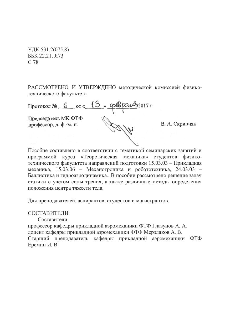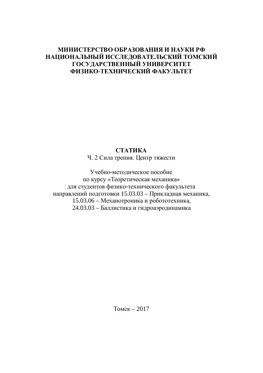 Пособие составлено в соответствии с тематикой семинарских занятий и программой курса «Теоретическая механика» студентов физико-технического факультета направлений подготовки 15.03.03 – Прикладная механика, 15.03.06 – Механотроника и робототехника, 24.03.03 – Баллистика и гидроаэродинамика.. В пособии рассмотрено решение задач статики с учетом силы трения, а также различные методы определения положения центра тяжести тела. Для преподавателей, аспирантов, студентов и магистрантов.