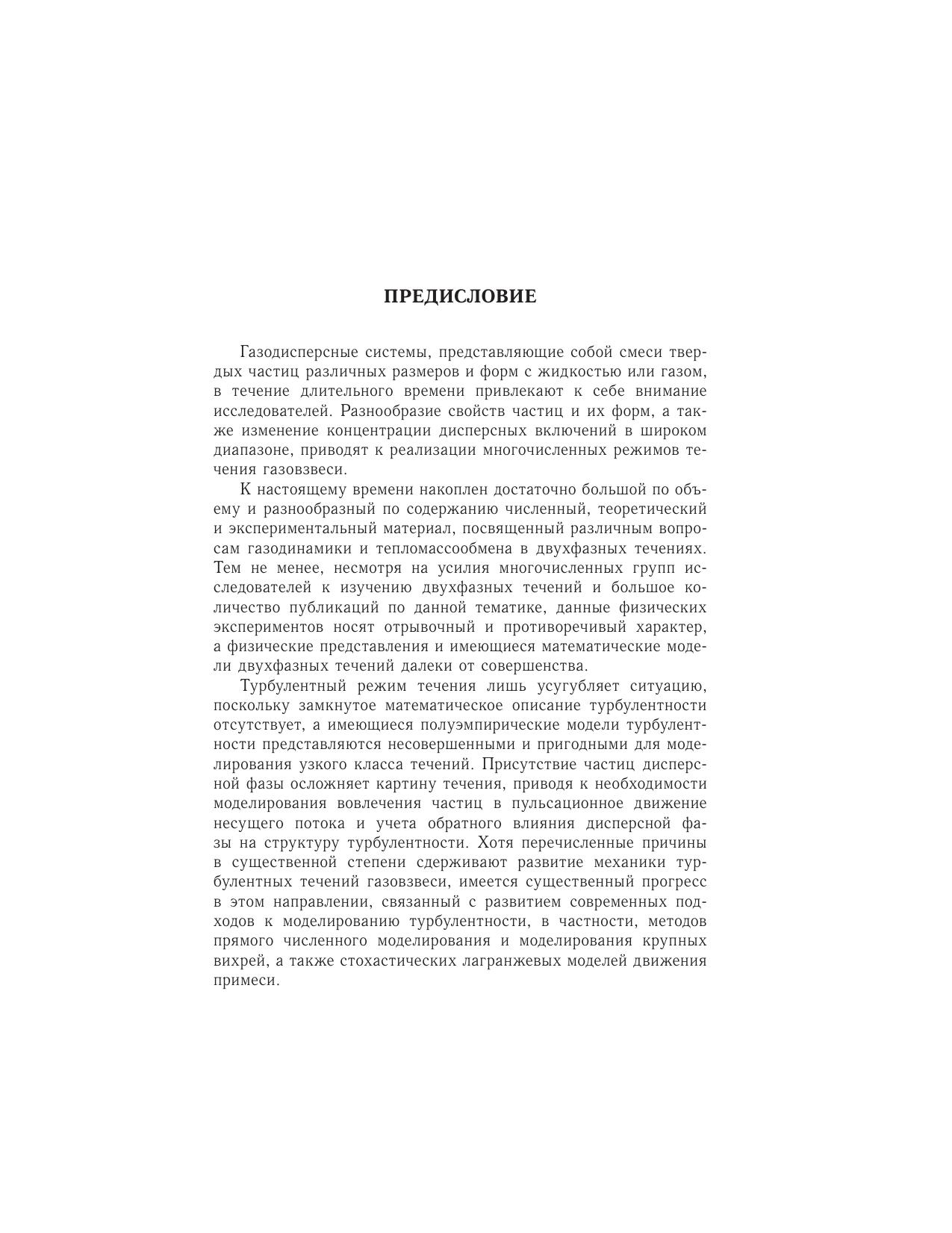 Рассматриваются математические модели и приводятся результаты численного моделирования турбулентных течений газа с твердыми частицами. Обсуждаются вопросы, связанные с движением частиц, взвешенных в турбулентном потоке, и их обратным влиянием на характеристики течения несущего газа, а также стохастические модели, основанные на лагранжевом подходе к описанию движения и теплообмена частиц в турбулентном потоке, и прямое численное моделирование и моделирование крупных вихрей турбулентных течений газовзвеси, включая влияние дисперсной фазы на структуру подсеточной турбулентности. Рассматриваются особенности численной реализации математических моделей двухфазных течений. Для научных работников, занимающихся исследованиями газовой динамики и тепломассообмена многофазных потоков, а также преподавателей, аспирантов и студентов соответствующих специальностей высших учебных заведений.