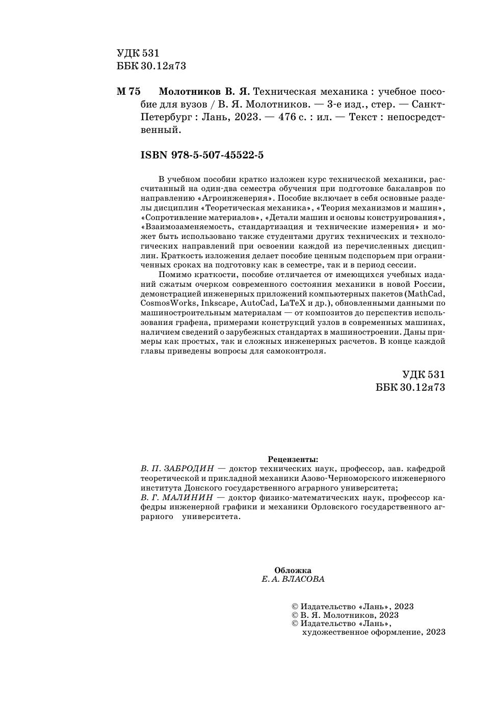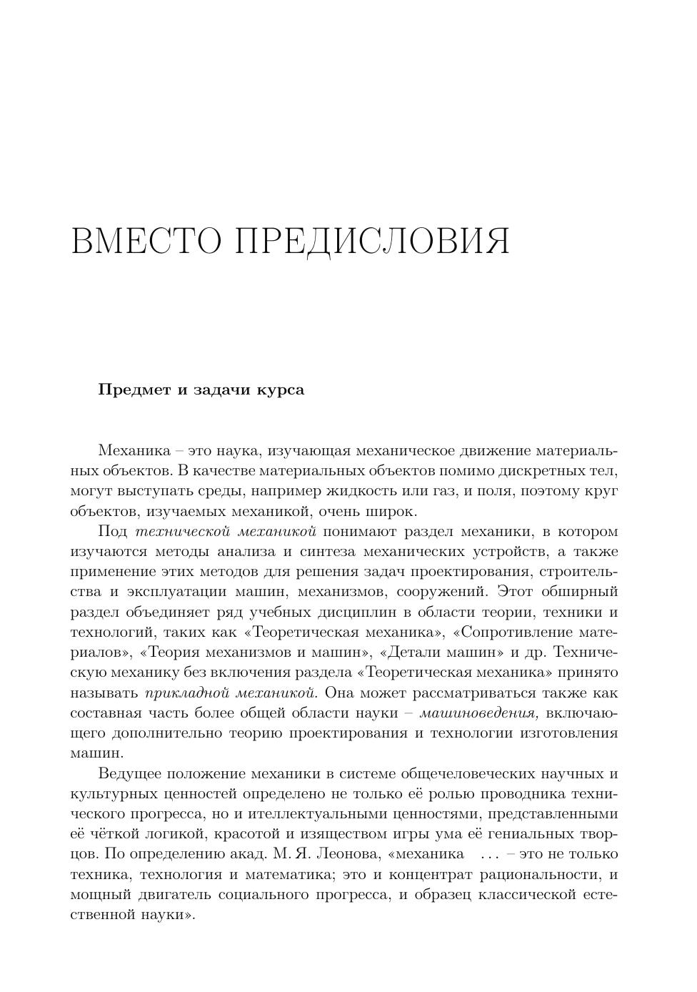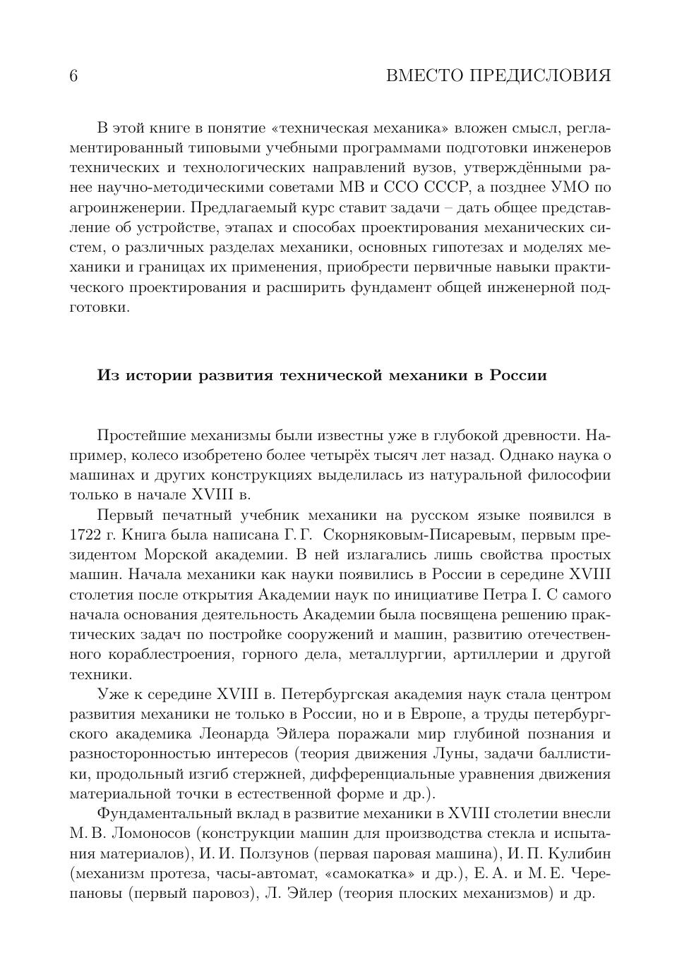 В учебном пособии кратко изложен курс технической механики, рассчитанный на один-два семестра обучения при подготовке бакалавров по направлению «Агроинженерия». Пособие включает в себя основные разделы дисциплин «Теоретическая механика», «Теория механизмов и машин», «Сопротивление материалов», «Детали машин и основы конструирования», «Взаимозаменяемость, стандартизация и технические измерения» и может быть использовано также студентами других технических и технологических направлений при освоении каждой из перечисленных дисциплин. Краткость изложения делает пособие ценным подспорьем при ограниченных сроках на подготовку как в семестре, так и в период сессии. Помимо краткости, пособие отличается от имеющихся учебных изданий сжатым очерком современного состояния механики в новой России, демонстрацией инженерных приложений компьютерных пакетов (MathCad, CosmosWorks, Inkscape, AutoCad, LaTeX и др.), обновленными данными по машиностроительным материалам — от композитов до перспектив использования графена, примерами конструкций узлов в современных машинах, наличием сведений о зарубежных стандартах в машиностроении. Даны примеры как простых, так и сложных инженерных расчетов. В конце каждой главы приведены вопросы для самоконтроля.