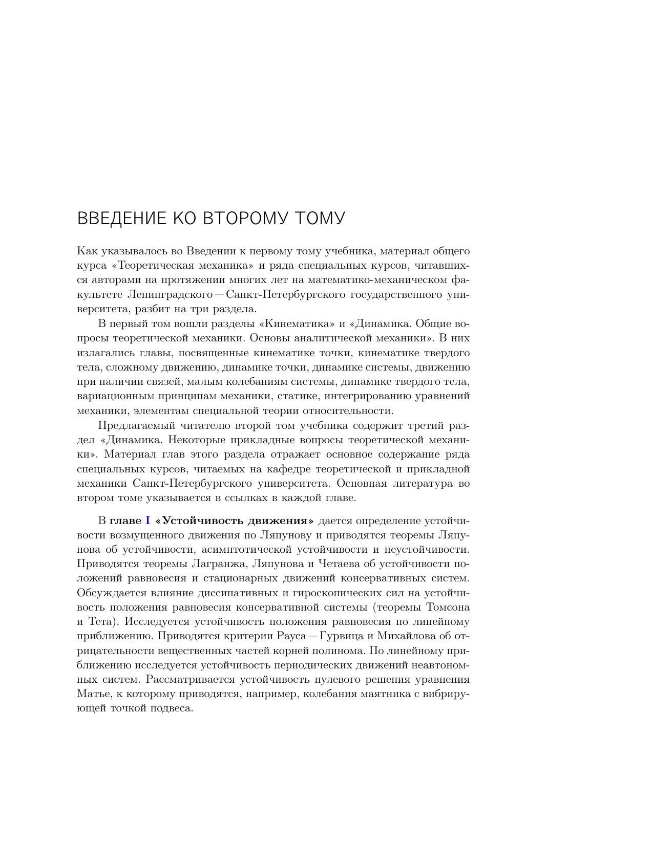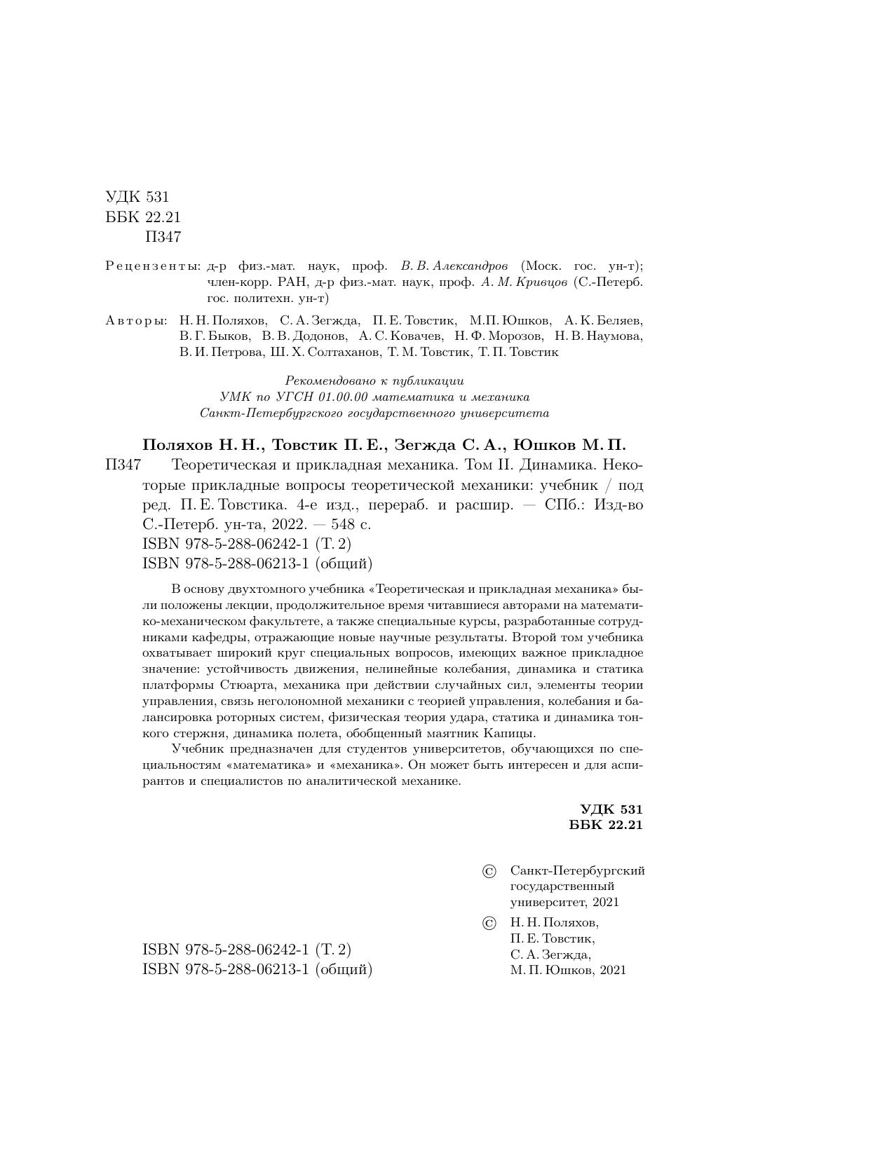 В основу двухтомного учебника "Теоретическая и прикладная механика" были положены лекции, продолжительное время читавшиеся авторами на математико-механическом факультете, а также специальные курсы, разработанные сотрудниками кафедры, отражающие новые научные результаты. Второй том учебника охватывает широкий круг специальных вопросов, имеющих важное прикладное значение: устойчивость движения, нелинейные колебания, динамика и статика платформы Стюарта, механика при действии случайных сил, элементы теории управления, связь неголономной механики с теорией управления, колебания и балансировка роторных систем, физическая теория удара, статика и динамика тонкого стержня, динамика полета, обобщенный маятник Капицы.