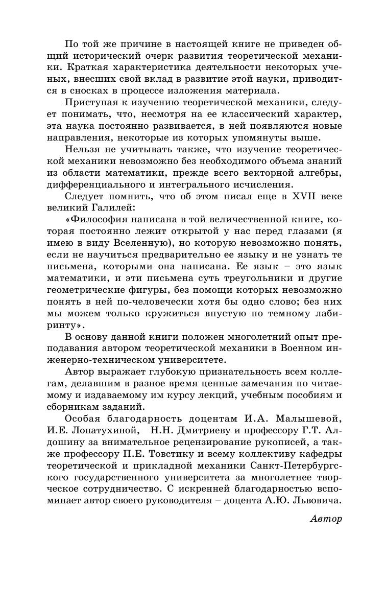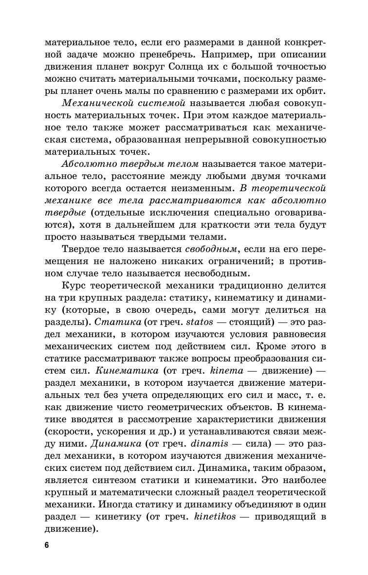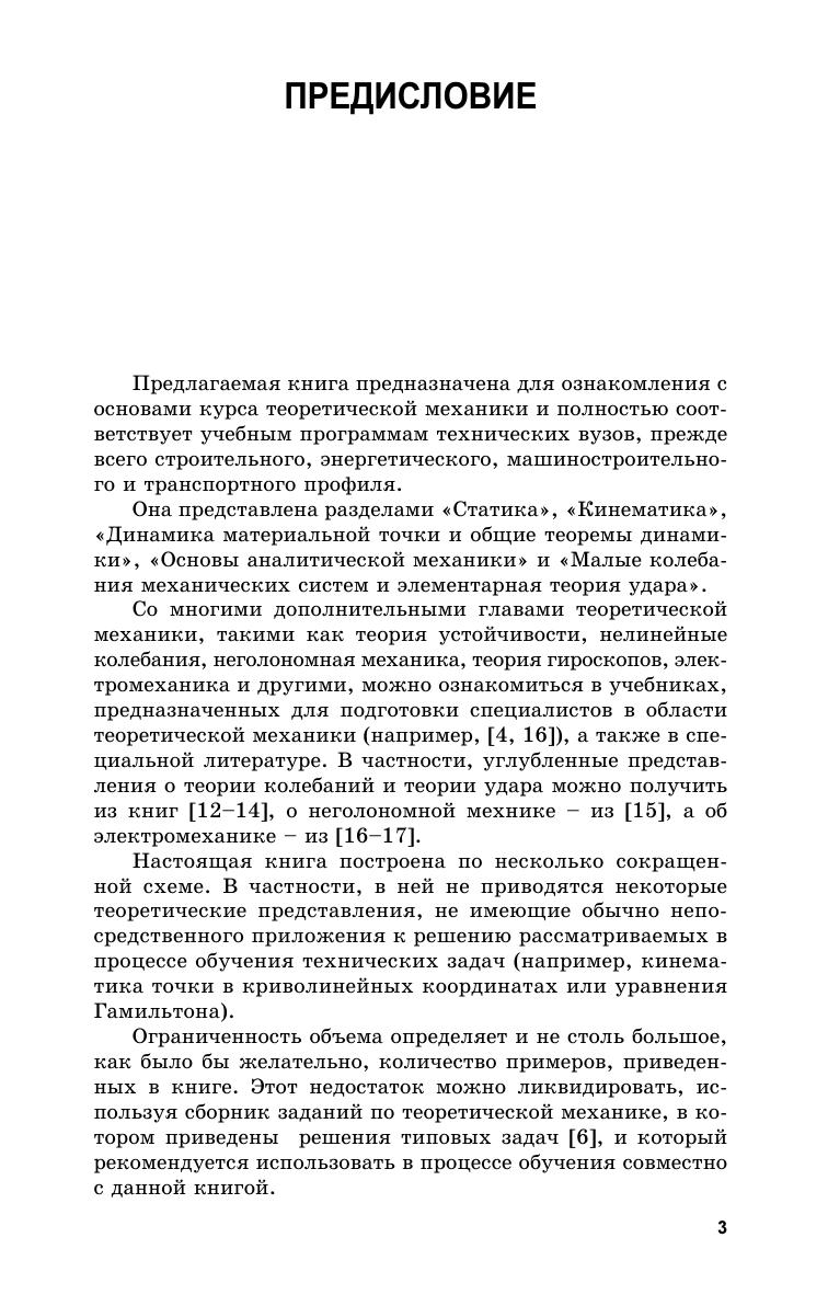 Книга предназначена для ознакомления студентов и курсантов высших технических учебных заведений с основами теоретической механики — статики, кинематики и динамики. Она представлена разделами «Статика», «Кинематика», «Динамика материальной точки и общие теоремы динамики», «Основы аналитической механики» и «Малые колебания механических систем и элементарная теория удара». Книга может быть также полезна инженерам и научным работникам для углубления знаний по основам теоретической механики.