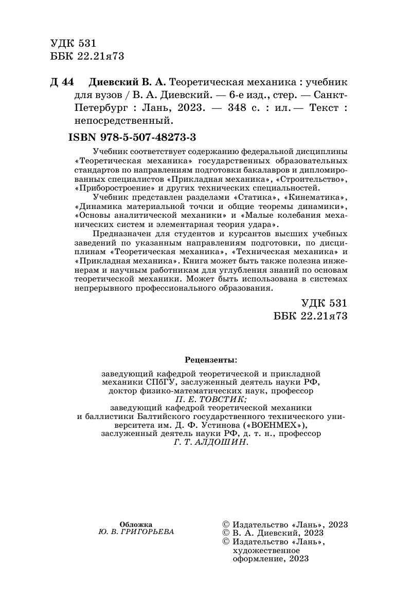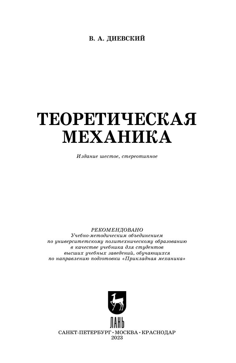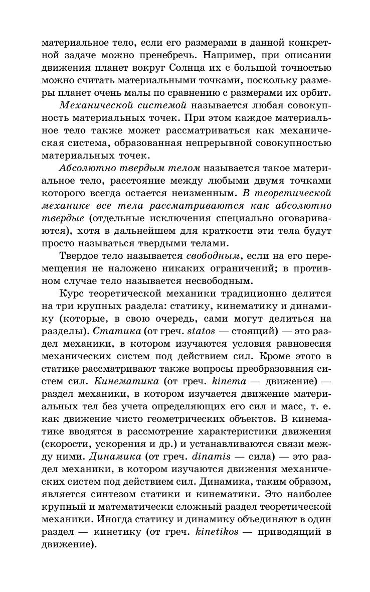 Книга предназначена для ознакомления студентов и курсантов высших технических учебных заведений с основами теоретической механики — статики, кинематики и динамики. Она представлена разделами «Статика», «Кинематика», «Динамика материальной точки и общие теоремы динамики», «Основы аналитической механики» и «Малые колебания механических систем и элементарная теория удара». Книга может быть также полезна инженерам и научным работникам для углубления знаний по основам теоретической механики.