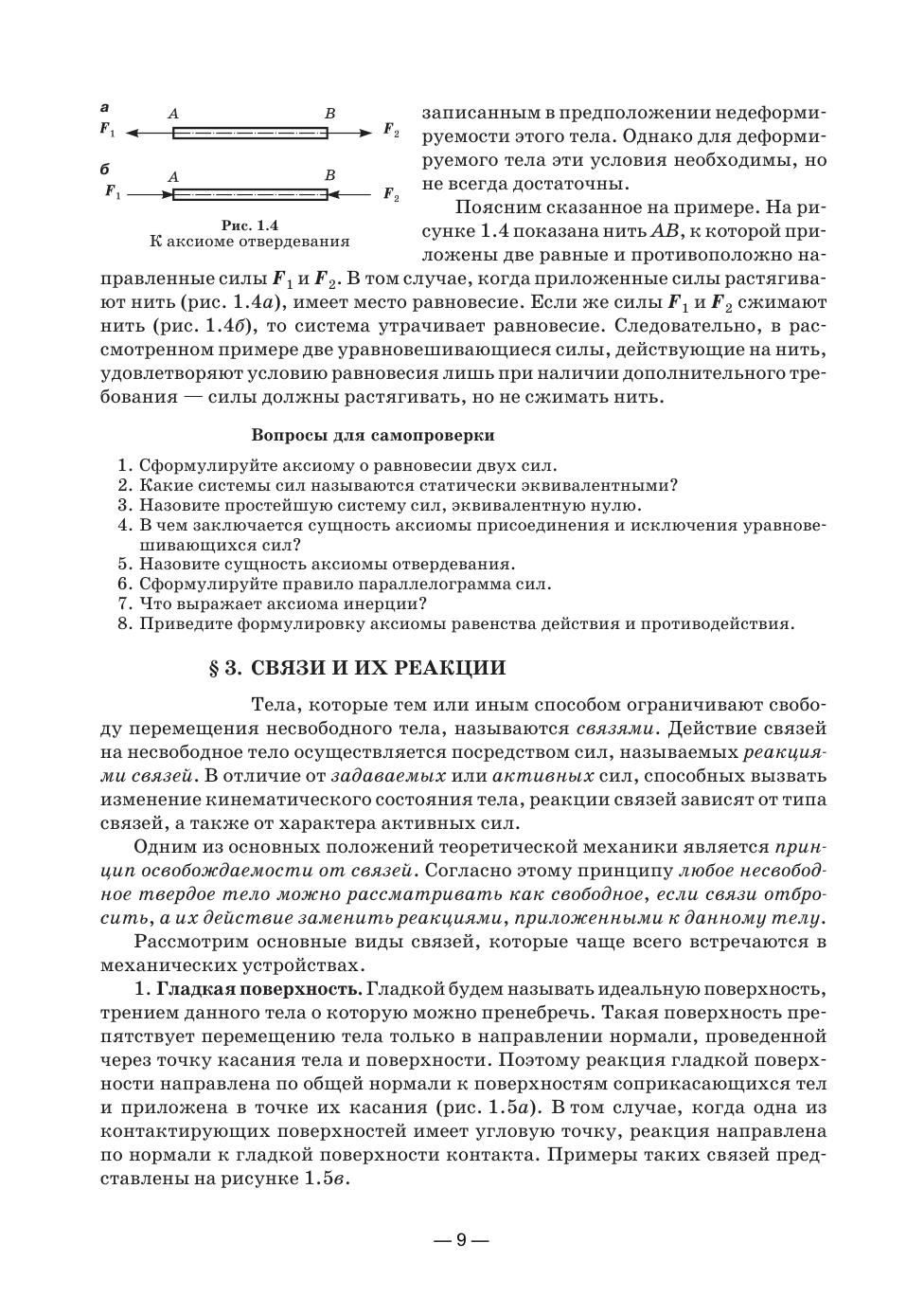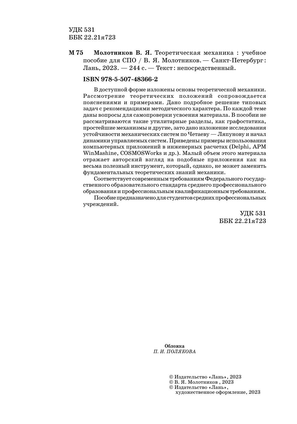 В доступной форме изложены основы теоретической механики. Рассмотрение теоретических положений сопровождается пояснениями и примерами. Дано подробное решение типовых задач с рекомендациями методического характера. По каждой теме даны вопросы для самопроверки усвоения материала. В пособии не рассматриваются такие утилитарные разделы, как графостатика, простейшие механизмы и другие, зато дано изложение исследования устойчивости механических систем по Четаеву — Ляпунову и начал динамики управляемых систем. Приведены примеры использования компьютерных приложений в инженерных расчетах (Delphi, APM WinMashine, COSMOSWorks и др.). Малый объем этого материала отражает авторский взгляд на подобные приложения как на весьма полезный инструмент, который, однако, не может заменить фундаментальных теоретических знаний механики. Соответствует современным требованиям Федерального государственного образовательного стандарта среднего профессионального образования и профессиональным квалификационным требованиям. Пособие предназначено для студентов средних профессиональных учреждений.