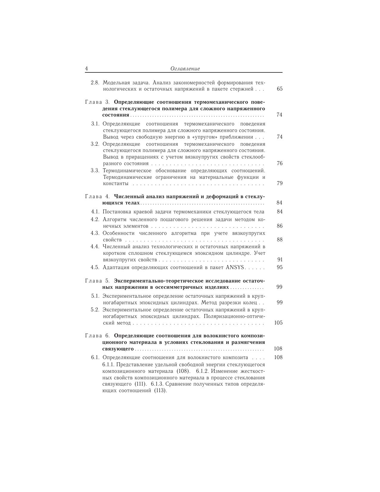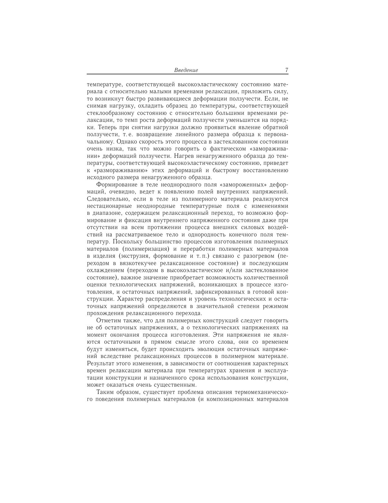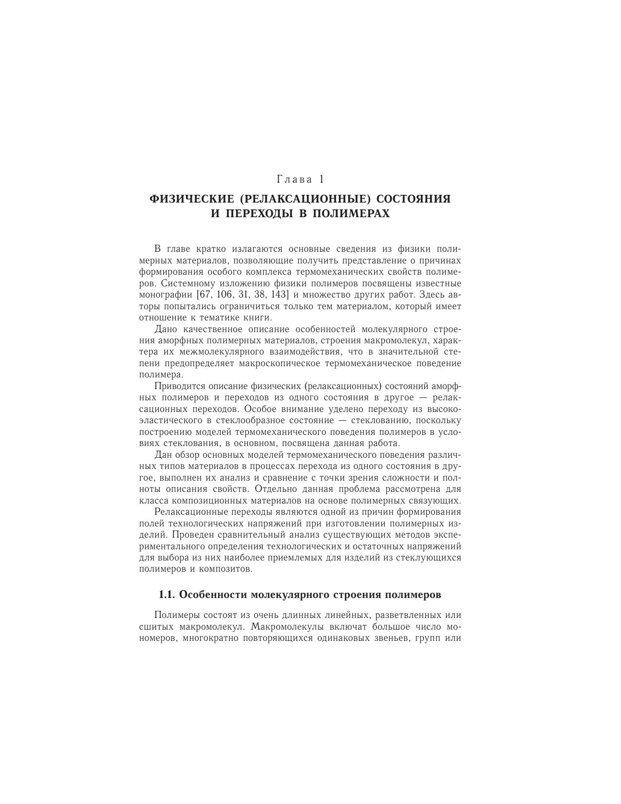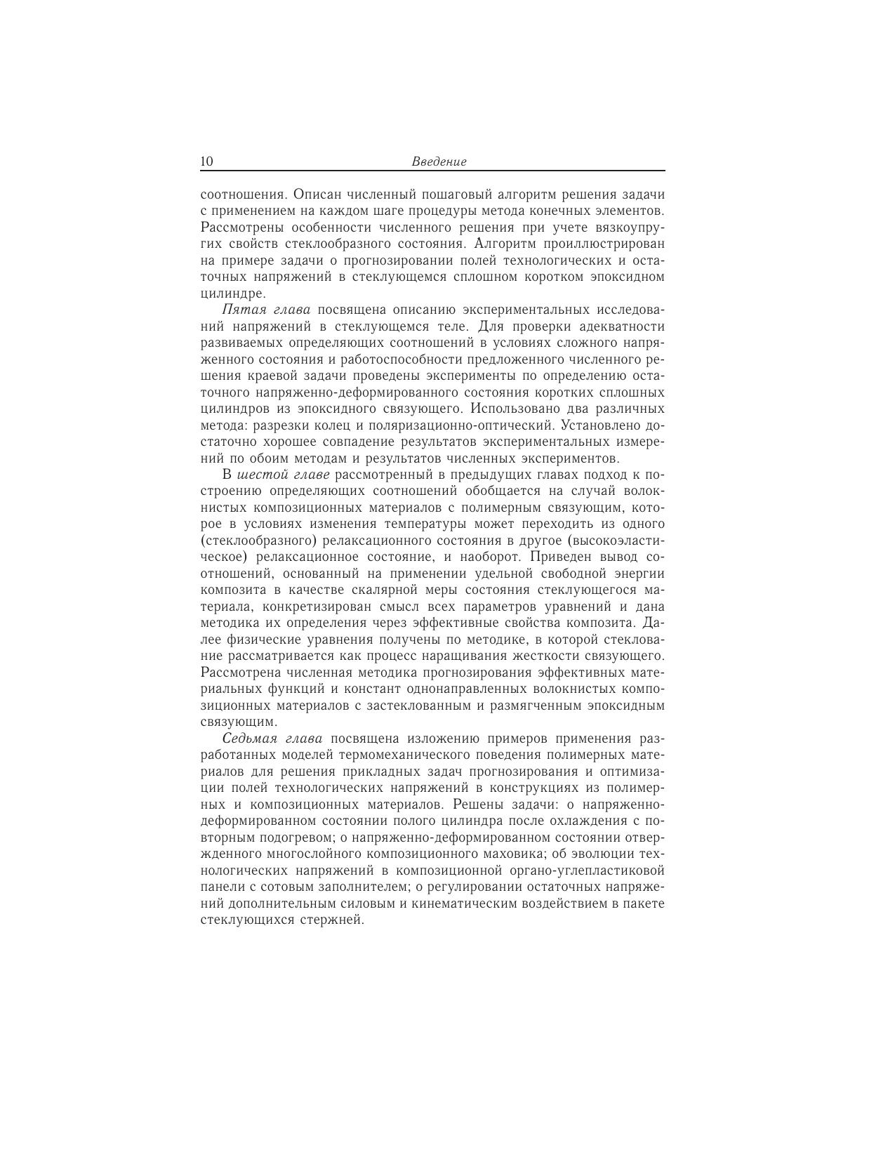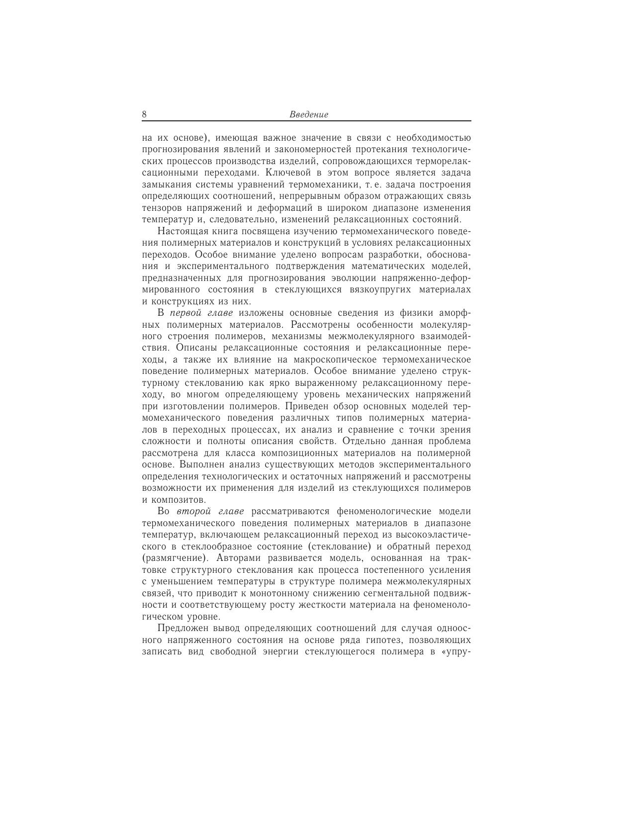 Рассматривается проблема описания термомеханического поведения полимерных материалов в условиях релаксационных переходов. Предложены новые определяющие соотношения, устанавливающие непрерывную связь тензоровнапряжений и деформаций в широком интервале температур, включающем диапазон релаксационного перехода. Разработана и реализована система экспериментов по идентификации материальных функций и констант предложенныхопределяющих соотношений. Приведены результаты экспериментов по проверке возможностей разработанных математических моделей для прогнозирования полей остаточных напряжений в стеклующихся полимерных изделиях в различных условиях охлаждения. Описаны численные методы решения краевых задач механики стеклующихся материалов. Приведены решения конкретных задач технологической механики полимерных и композиционных материалов и конструкций.Книга предназначена научным и инженерно-техническим работникам, а также аспирантам и студентам старших курсов, занимающимся вопросами механики деформируемого твердого тела