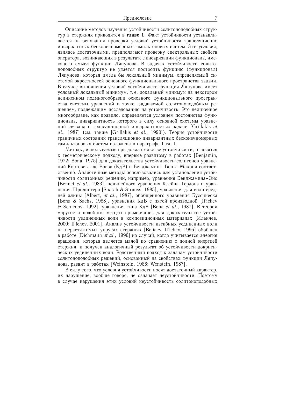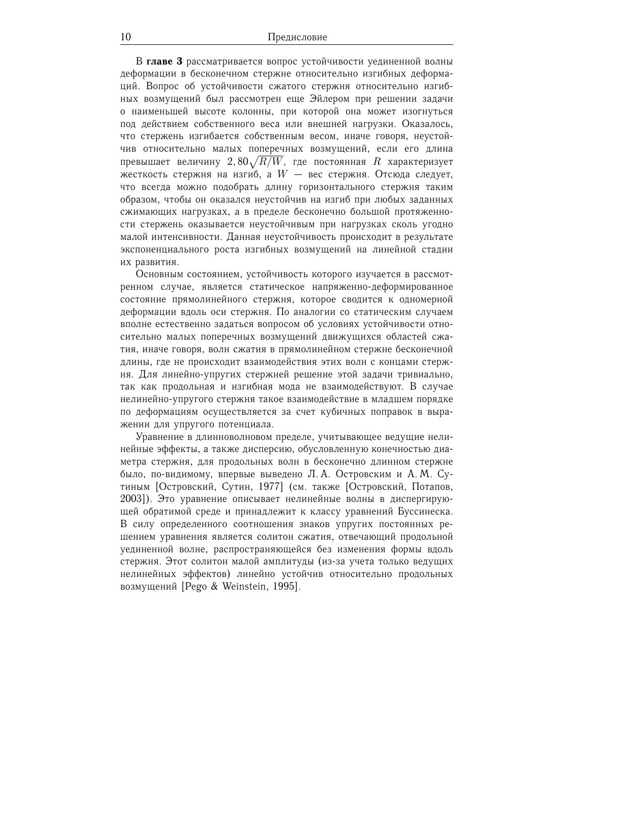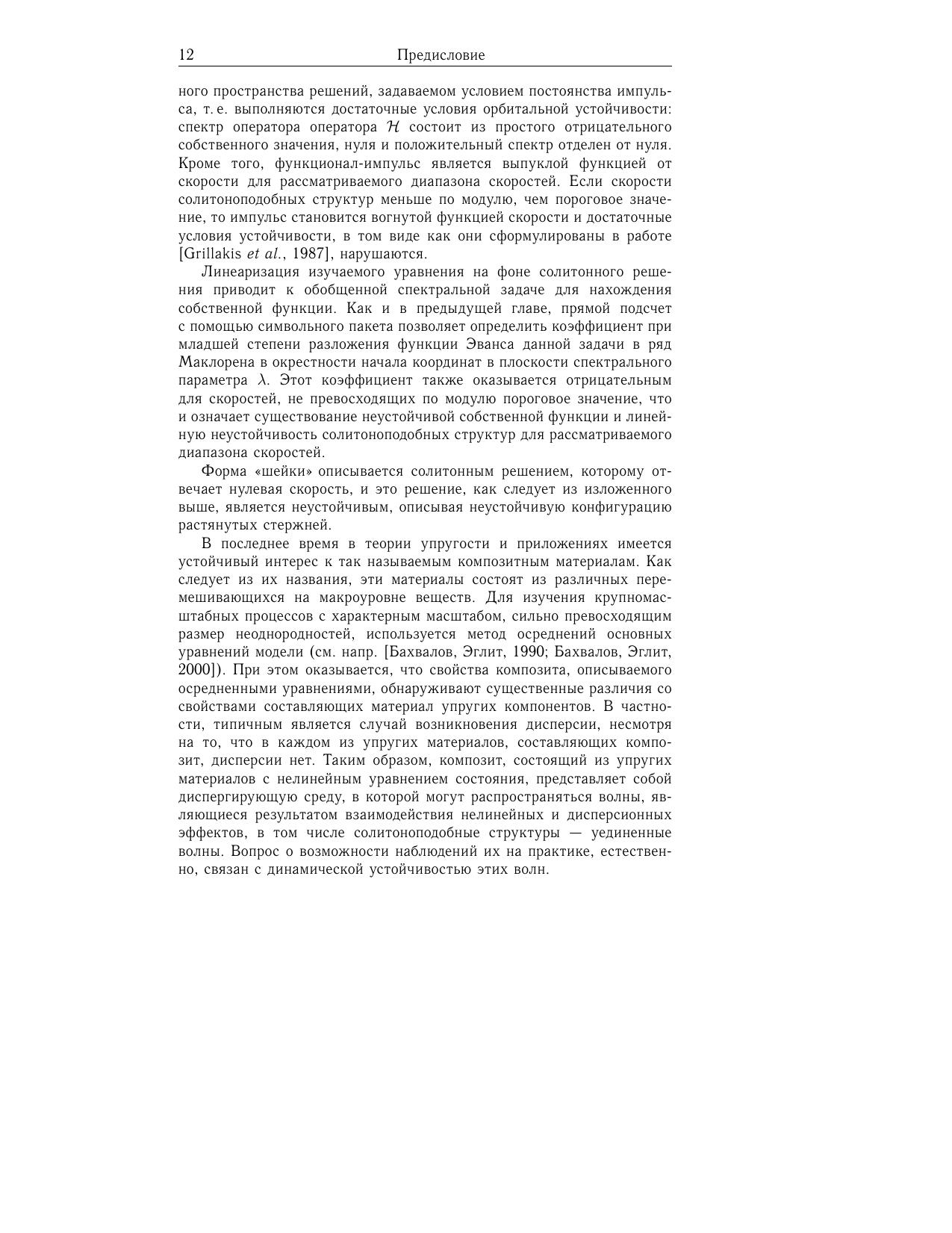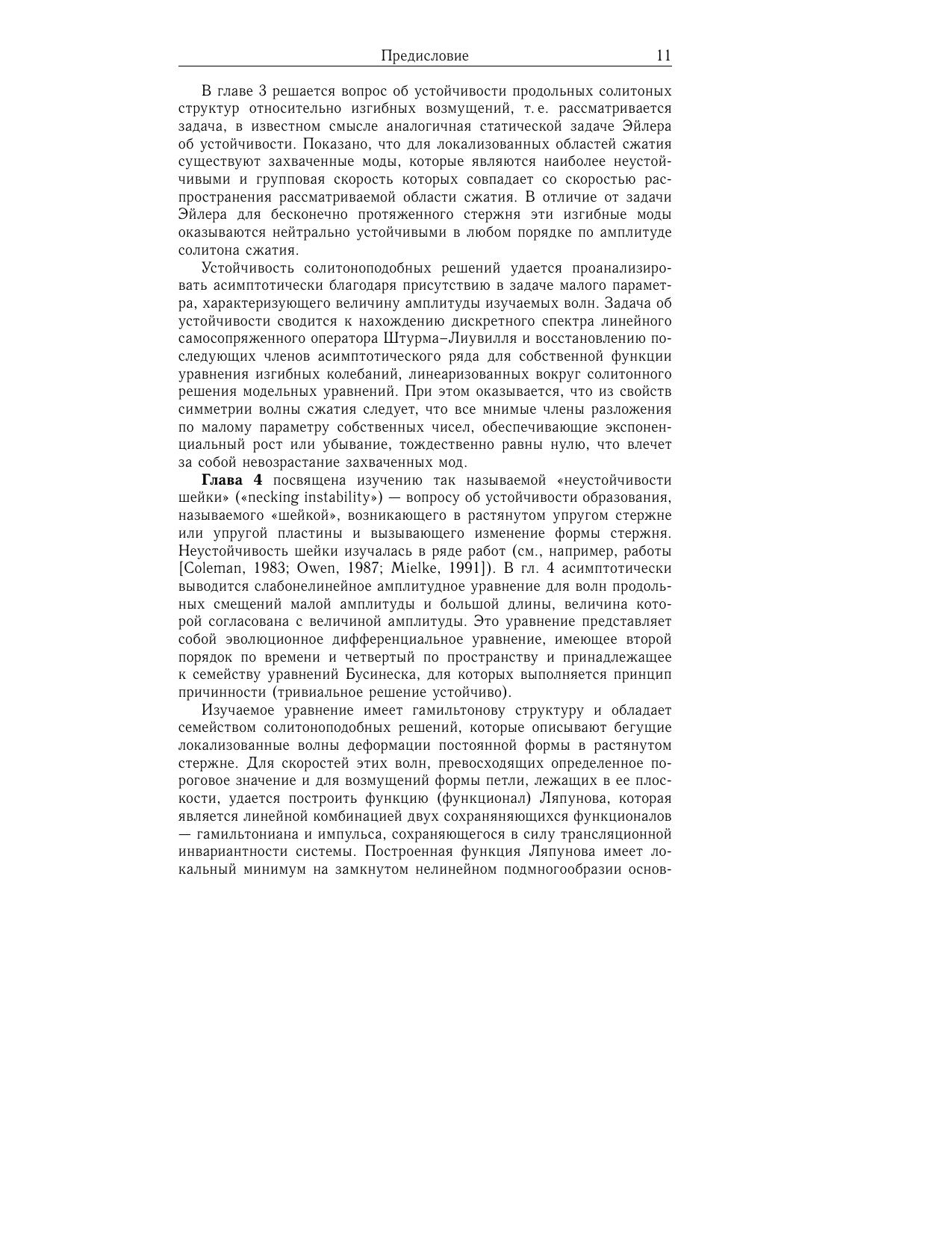 Излагаются результаты об устойчивости петлеобразных солитонов в эластике Эйлера (в нерастяжимом стержне), захваченных мод в сжимаемом стержне, солитонных структур в растянутом сжимаемом стержне, уединенных волн в композиционном материале, представляющем собой упругую матрицу с распределенными в ней стержнями. Обсуждается устойчивость решений типа уединенных волн с осциллирующей структурой фронтов двух самосогласованных уравнений Клейна-Гордона, которые описывают винтовые структуры в упругих стержнях с кручением. Приводится ряд нерешенных задач об устойчивости: устойчивость уединенных волн в модели изгиба бесконечного нерастяжимого стержня с учетом кручения устойчивость уединенных волн в плоском бесконечном стержне без кручения с учетом конечных изгибов и малых (линейных) деформаций и устойчивость уединенных волн в одной модели осесимметричной оболочки, заполненной жидкостью. Для специалистов в различных областях механики сплошной среды, математической физики и прикладной математики, аспирантов и студентов старших курсов физико-математических специальностей.