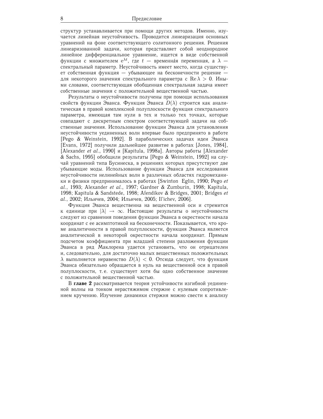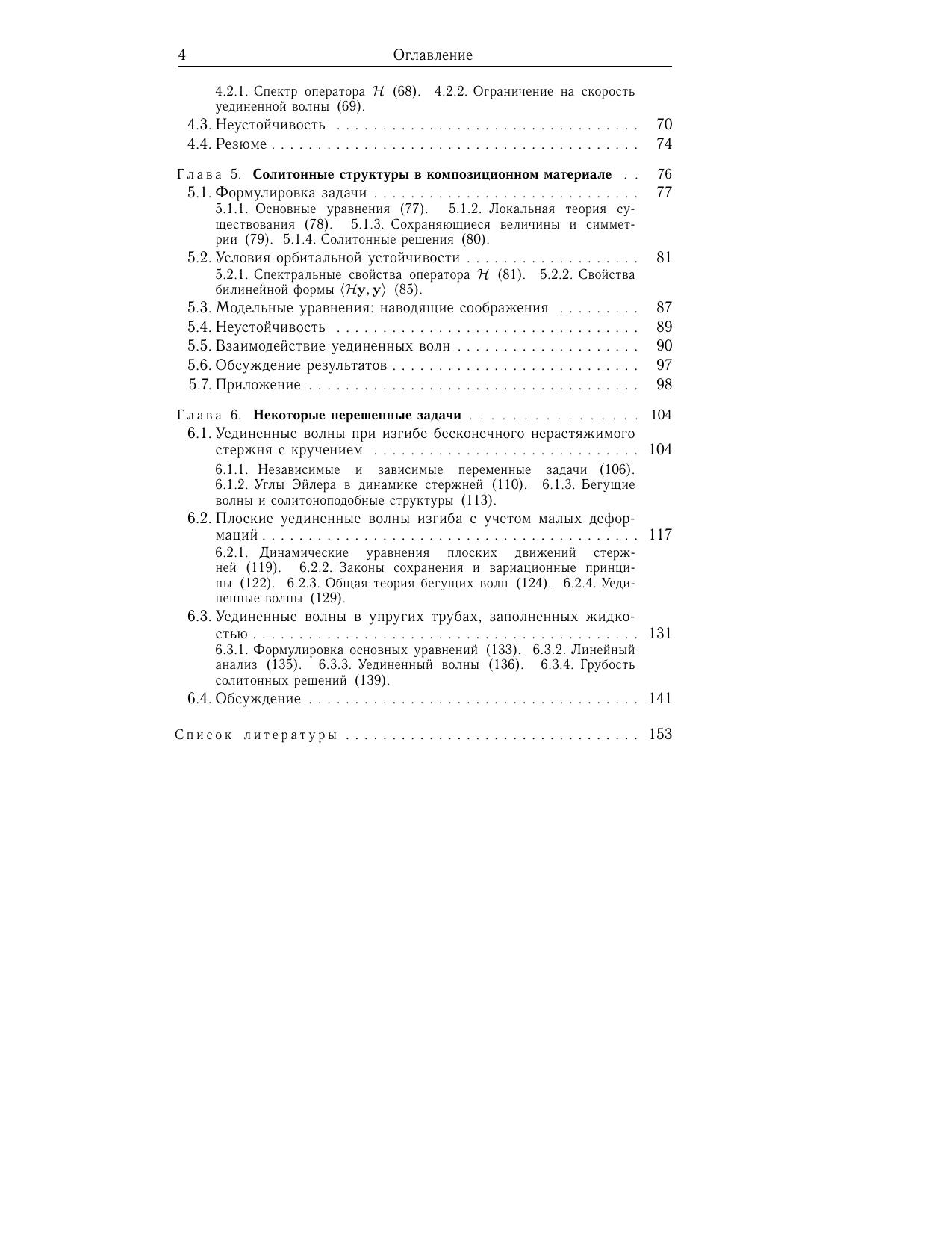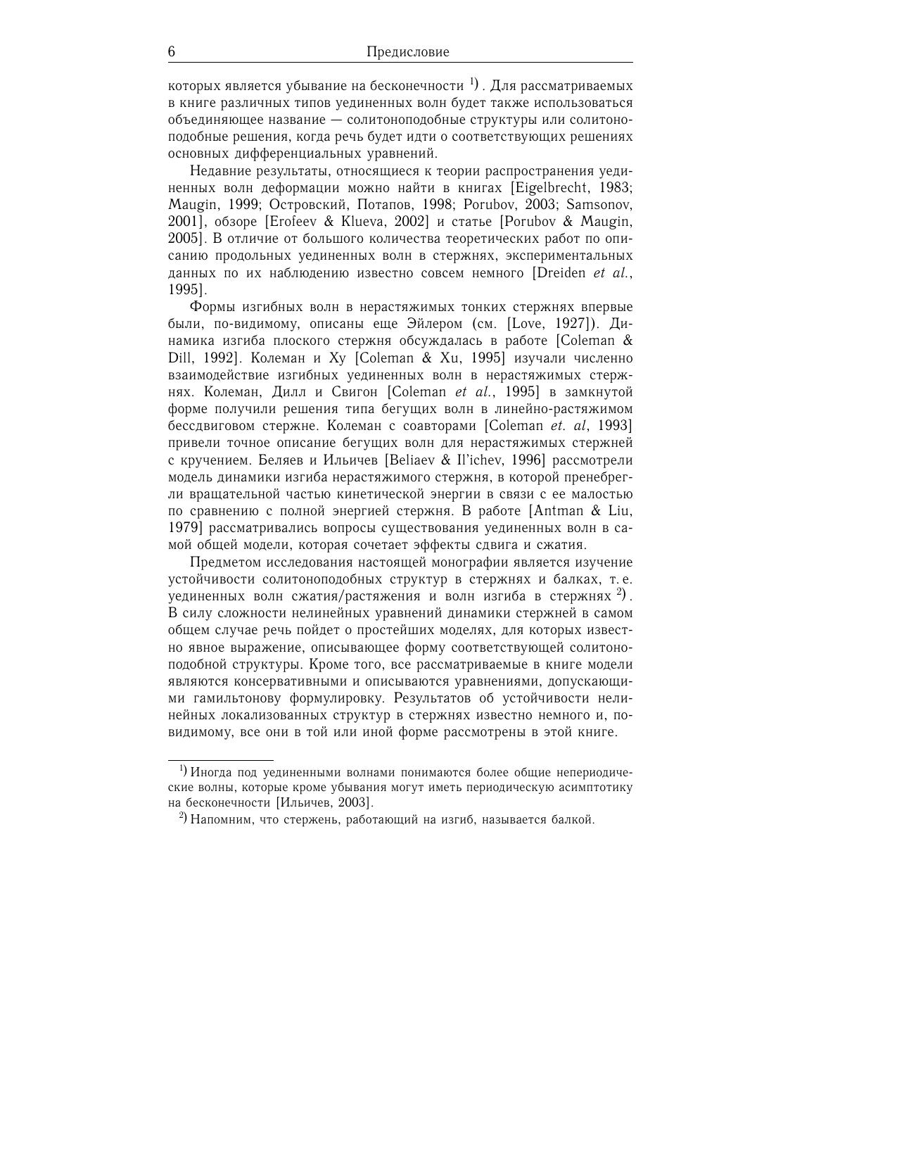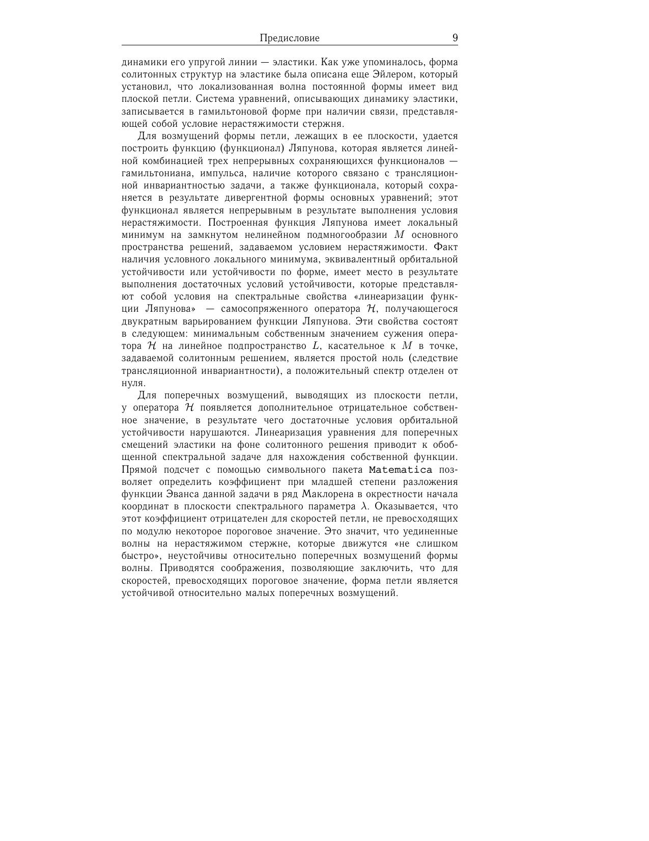 Излагаются результаты об устойчивости петлеобразных солитонов в эластике Эйлера (в нерастяжимом стержне), захваченных мод в сжимаемом стержне, солитонных структур в растянутом сжимаемом стержне, уединенных волн в композиционном материале, представляющем собой упругую матрицу с распределенными в ней стержнями. Обсуждается устойчивость решений типа уединенных волн с осциллирующей структурой фронтов двух самосогласованных уравнений Клейна-Гордона, которые описывают винтовые структуры в упругих стержнях с кручением. Приводится ряд нерешенных задач об устойчивости: устойчивость уединенных волн в модели изгиба бесконечного нерастяжимого стержня с учетом кручения устойчивость уединенных волн в плоском бесконечном стержне без кручения с учетом конечных изгибов и малых (линейных) деформаций и устойчивость уединенных волн в одной модели осесимметричной оболочки, заполненной жидкостью. Для специалистов в различных областях механики сплошной среды, математической физики и прикладной математики, аспирантов и студентов старших курсов физико-математических специальностей.