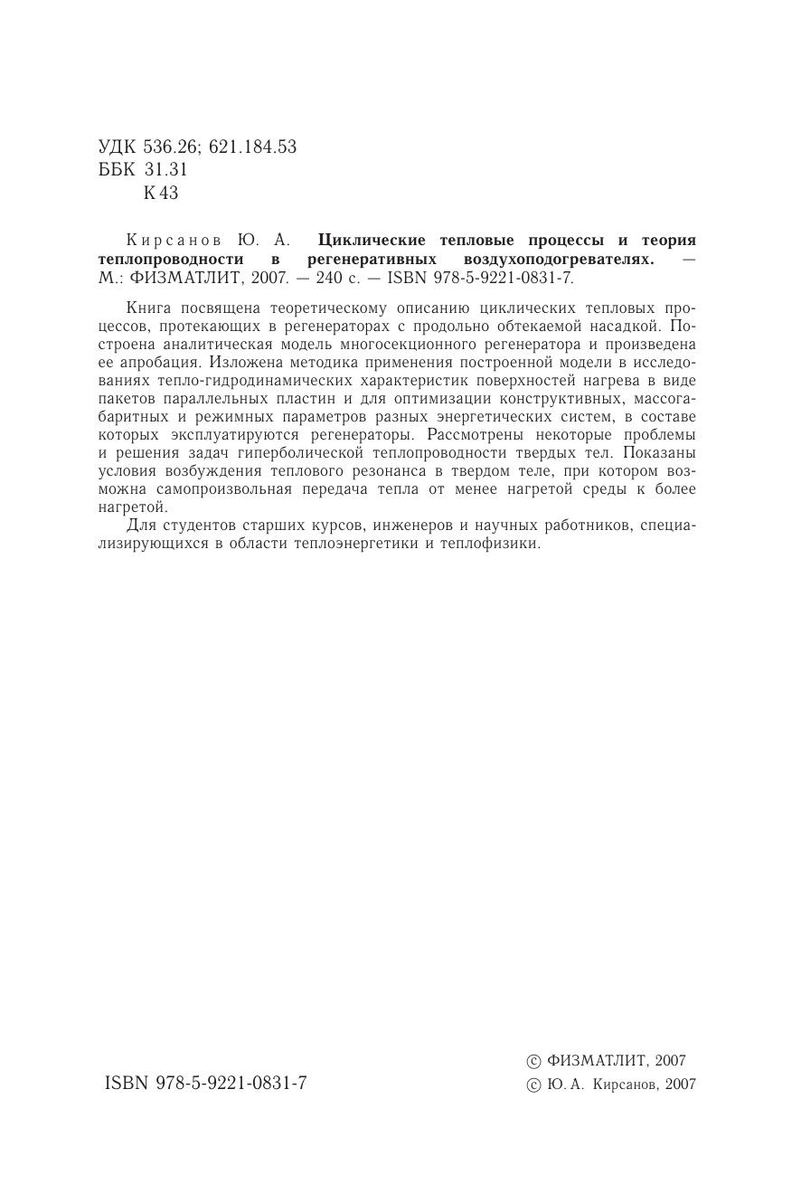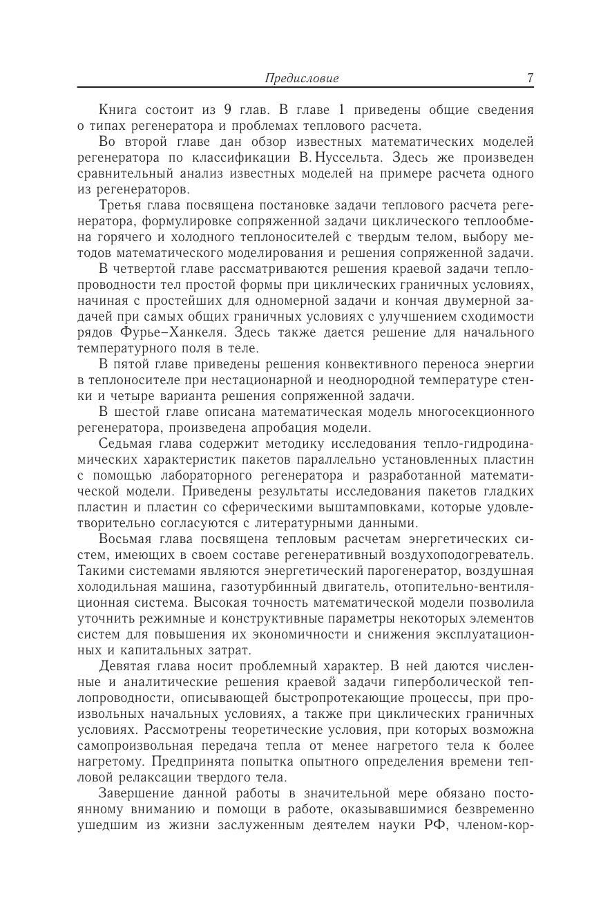 Книга посвящена теоретическому описанию циклических тепловых процессов, протекающих в регенераторах с продольно обтекаемой насадкой. Построена аналитическая модель многосекционного регенератора и произведена ее апробация. Изложена методика применения построенной модели в исследованиях тепло-гидродинамических характеристик поверхностей нагрева в виде пакетов параллельных пластин и для оптимизации конструктивных, массогабаритных и режимных параметров разных энергетических систем, в составе которых эксплуатируются регенераторы. Рассмотрены некоторые проблемы и решения задач гиперболической теплопроводности твердых тел. Показаны условия возбуждения теплового резонанса в твердом теле, при котором возможна самопроизвольная передача тепла от менее нагретой среды к более нагретой. Для студентов старших курсов, инженеров и научных работников, специализирующихся в области теплоэнергетики и теплофизики.