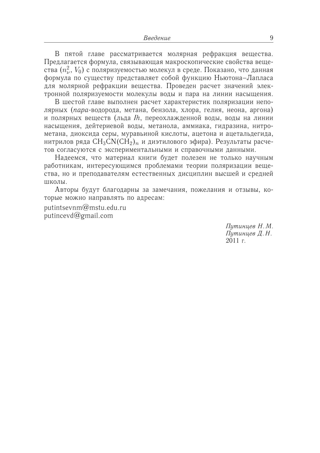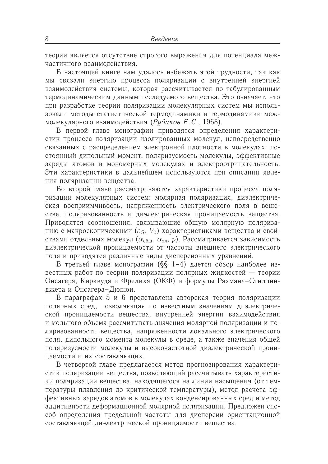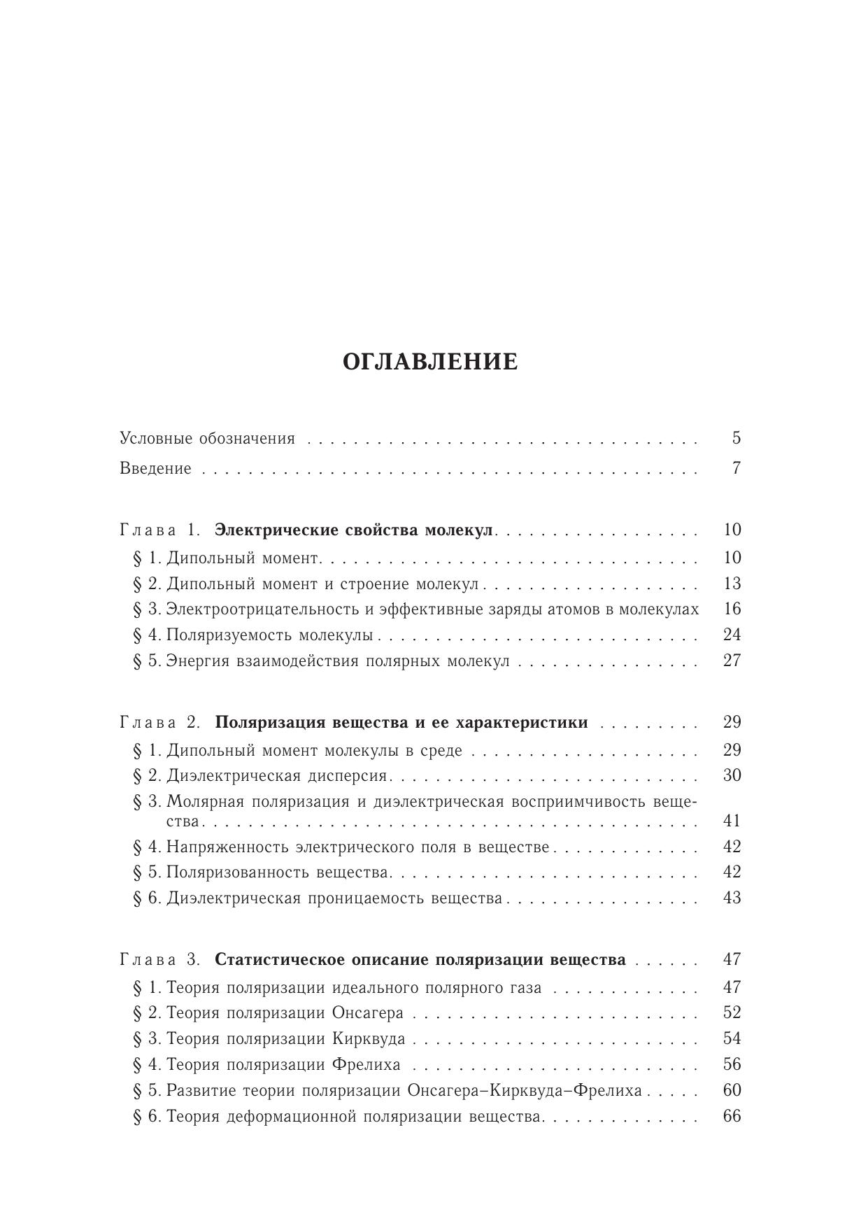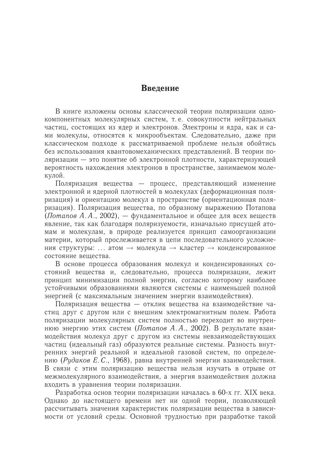 В книге изложены основы классической теории поляризации однокомпонентных молекулярных систем, находящихся в различных агрегатных состояниях. Рассчитаны значения характеристик поляризации гексагонального льда, переохлажденной воды, воды и пара от температуры плавления до критической температуры, а также приведены расчеты характеристик поляризации ряда неполярных и полярных веществ. Результаты расчета находятся в согласии с экспериментальными и справочными данными.Для преподавателей естественных дисциплин, а также научных работников, аспирантов и студентов, интересующихся строением и свойствами вещества.