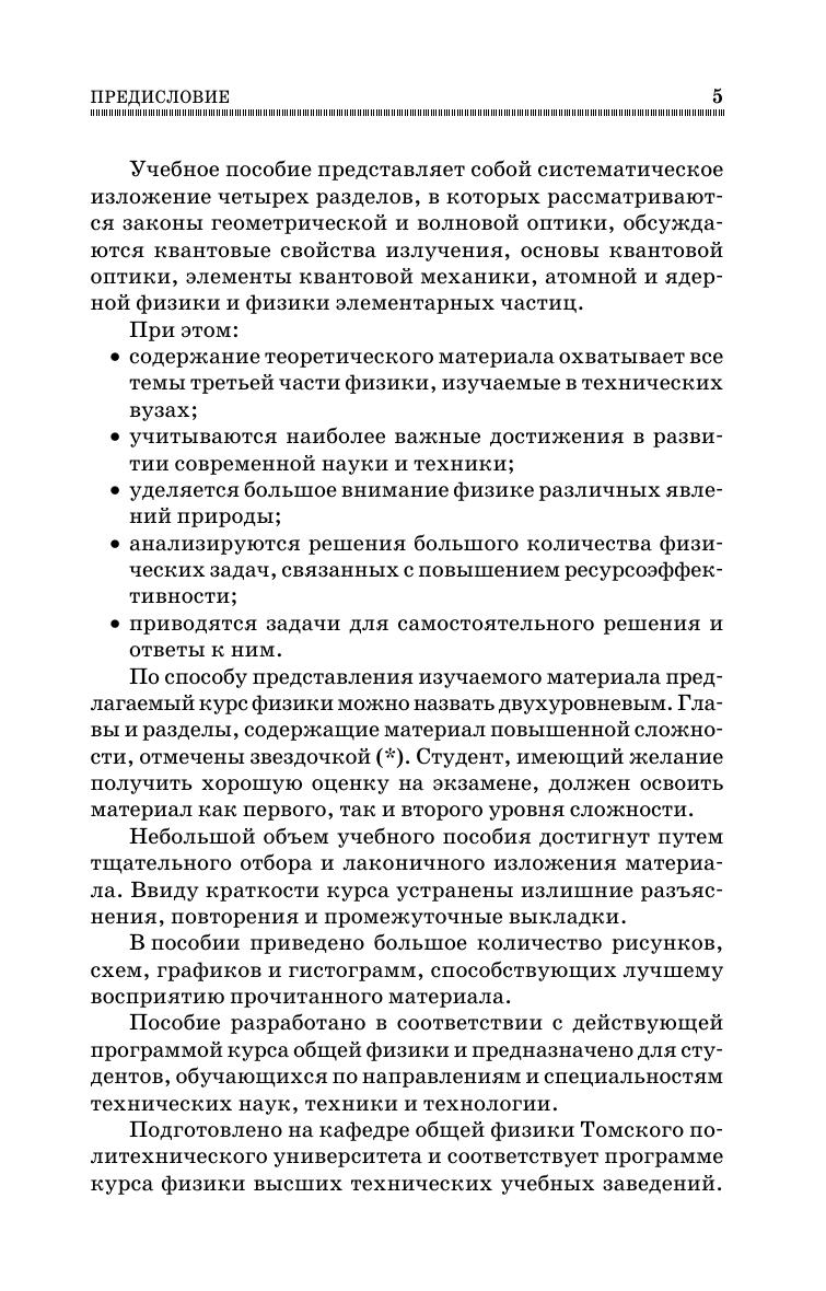 Рассматриваются законы геометрической и волновой оптики, обсуждаются квантовые свойства излучения, основы квантовой оптики, элементы квантовой механики, атомной и ядерной физики и физики элементарных частиц. Учитываются наиболее важные достижения в совре-менной науке и технике, уделяется большое внимание физике различных природных явлений. Цель книги – помочь освоить материал программы, научить активно применять теоретические основы физики как рабочий аппарат, позволяющий решать конкретные задачи, связанные с повышением ресурсоэффективности. Пособие ориентировано на организацию самостоятельной работы студентов. В нем анализируется решение многих физических задач и приводятся задачи для самостоятельного решения и ответы к ним. Подготовлено по программе курса физики высших технических учебных заведений в полном соответствии с требованиями образовательного Госстандарта. Соответствует инновационной политике и направлено на ак-тивизацию научного мышления и познавательной деятельности студентов. Предназначено для межвузовского использования преподавателями и студентами технических специальностей очной и дистанционной форм обучения.