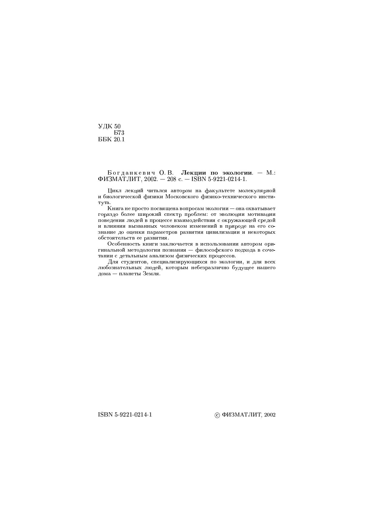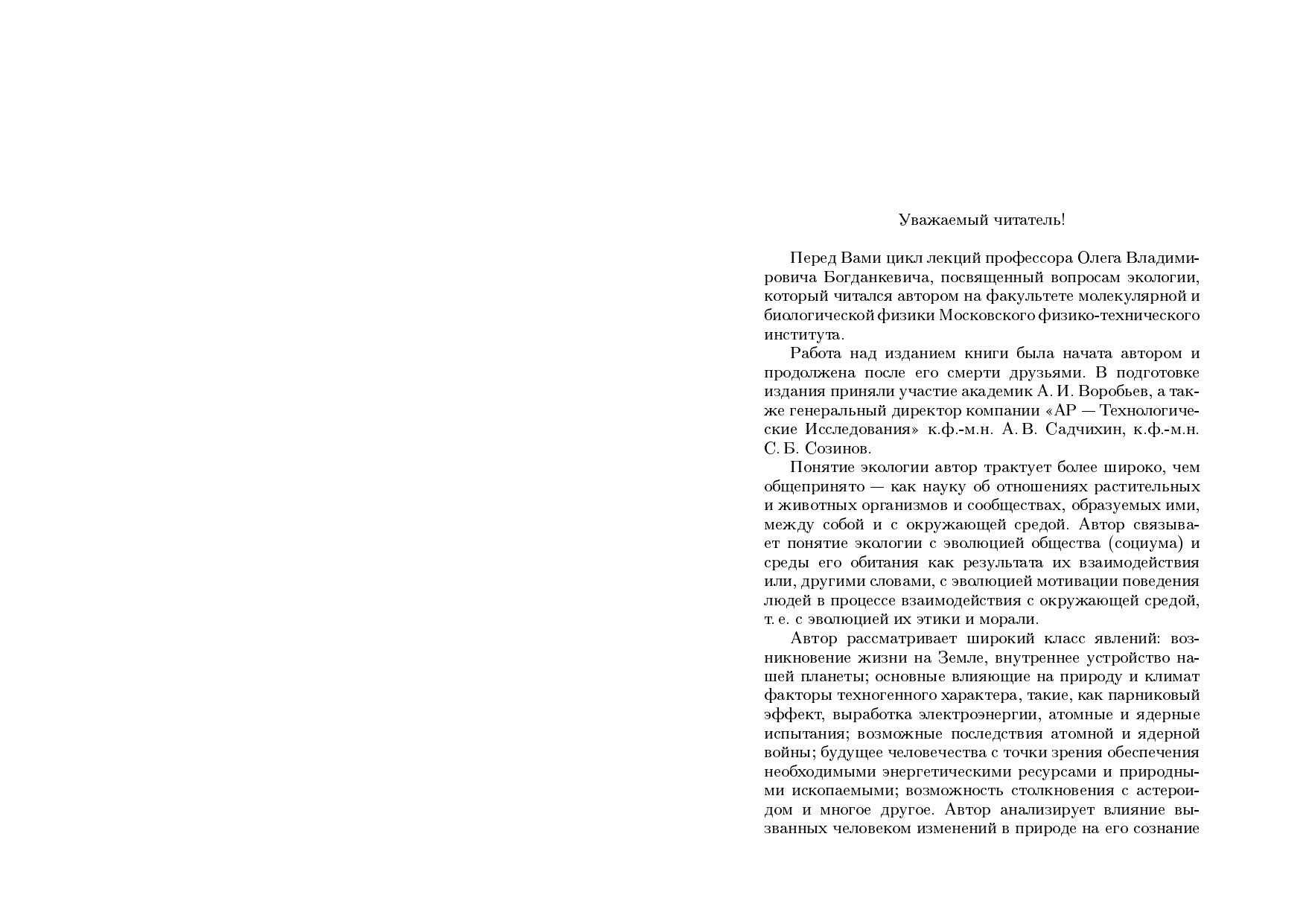 Цикл лекций читался автором на факультете молекулярной и биологической физики Московского физико-технического института. Книга не просто посвящена вопросам экологии - она охватывает более широкий спектр проблем: от эволюции мотивации поведения людей в процессе взаимодействия с окружающей средой и влияние вызванных человеком изменений в природе на его сознание до оценки параметров развития цивилизации и некоторых обстоятельств ее развития. Особенность книги заключается в использовании автором оригинальной методологии познания - философского подхода в сочетании с детальным анализом физических процессов. Для студентов, специализирующихся по экологии, и для всех любознательных людей, которым небезразлично будущее нашего дома - планеты Земля.