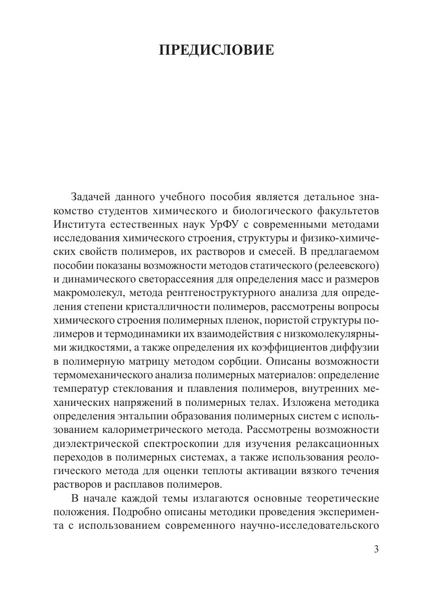 В учебном пособии, подготовленном преподавателями кафедры высокомолекулярных соединений Института естественных наук УрФУ, даны сведения о химическом строении и молекулярных параметрах полимеров, их фазовых состояниях, пористой структуре и электрических свойствах, о релаксационных переходах, термодинамике растворения и набухания в низкомолекулярных жидкостях, а также о реологических свойствах полимерных систем. подробно описаны методики проведения эксперимента с использованием современного научно-исследовательского оборудования. Для студентов и аспирантов, специализирующихся в области физикохимии полимеров.
