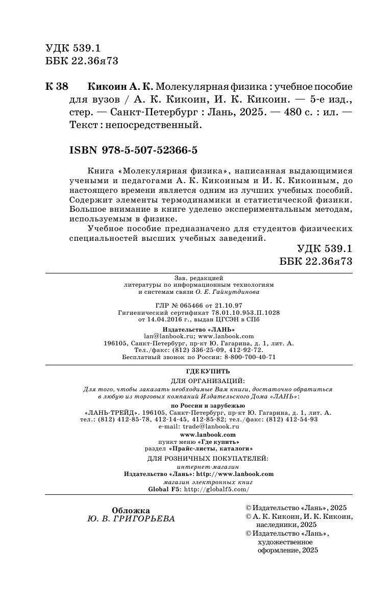 Допущено Научно-методическим советом по физике Министерства образования и науки РФ в качестве учебного пособия для студентов вузов, обучающихся по физическим, техническим и педагогическим направлениям и специальностям. Книга "Молекулярная физика", написанная выдающимися учеными и педагогами А. К. Кикоиным и И. К. Кикоиным, до настоящего времени является одним из лучших учебных пособий. Содержит элементы термодинамики и статистической физики. Большое внимание в книге уделено экспериментальным методам, используемым в физике. Учебное пособие предназначено для студентов физических специальностей высших учебных заведений.