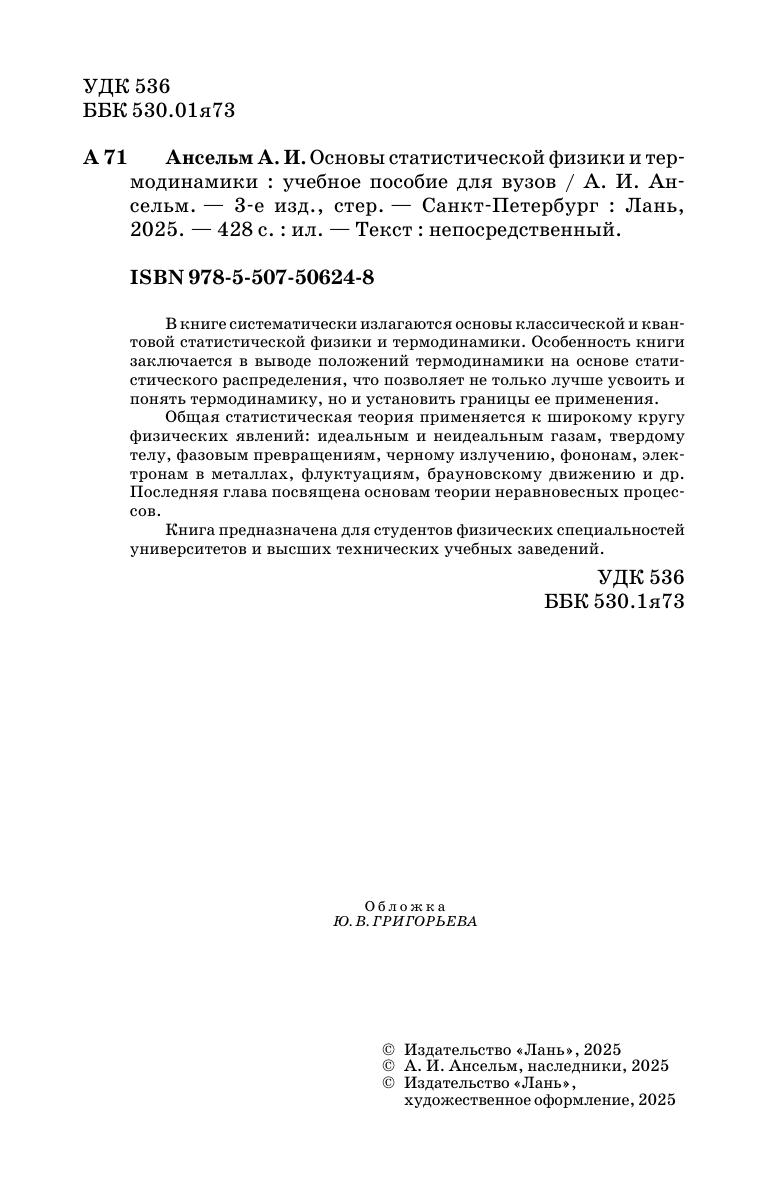 В книге систематически излагаются основы классической и квантовой статистической физики и термодинамики. Особенность книги заключается в выводе положений термодинамики на основе статистического распределения, что позволяет не только лучше усвоить и понять термодинамику, но и установить границы ее применения. Общая статистическая теория применяется к широкому кругу физических явлений: идеальным и неидеальным газам, твердому телу, фазовым превращениям, черному излучению, фононам, электронам в металлах, флуктуациям, броуновскому движению и др. Последняя глава посвящена основам теории неравновесных процессов. Книга предназначена для студентов физических специальностей университетов и высших технических учебных заведений.
