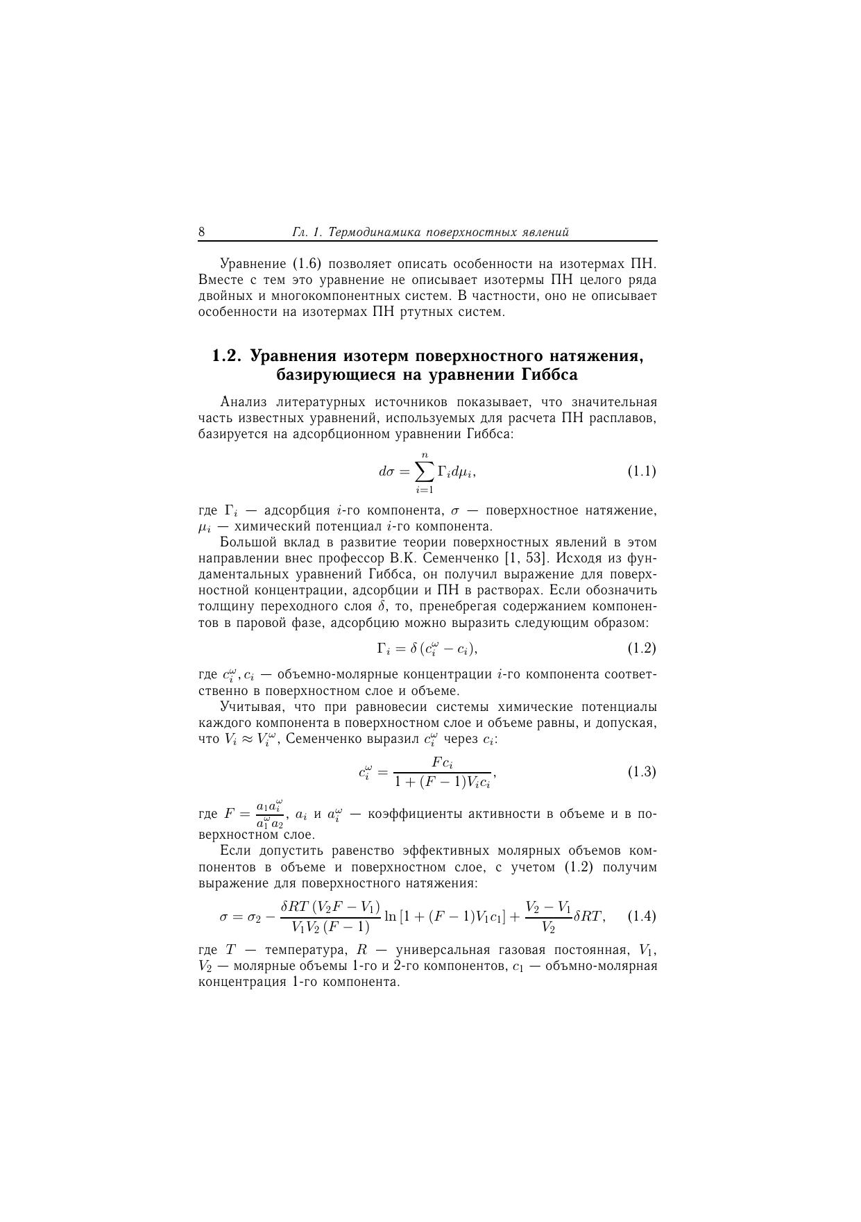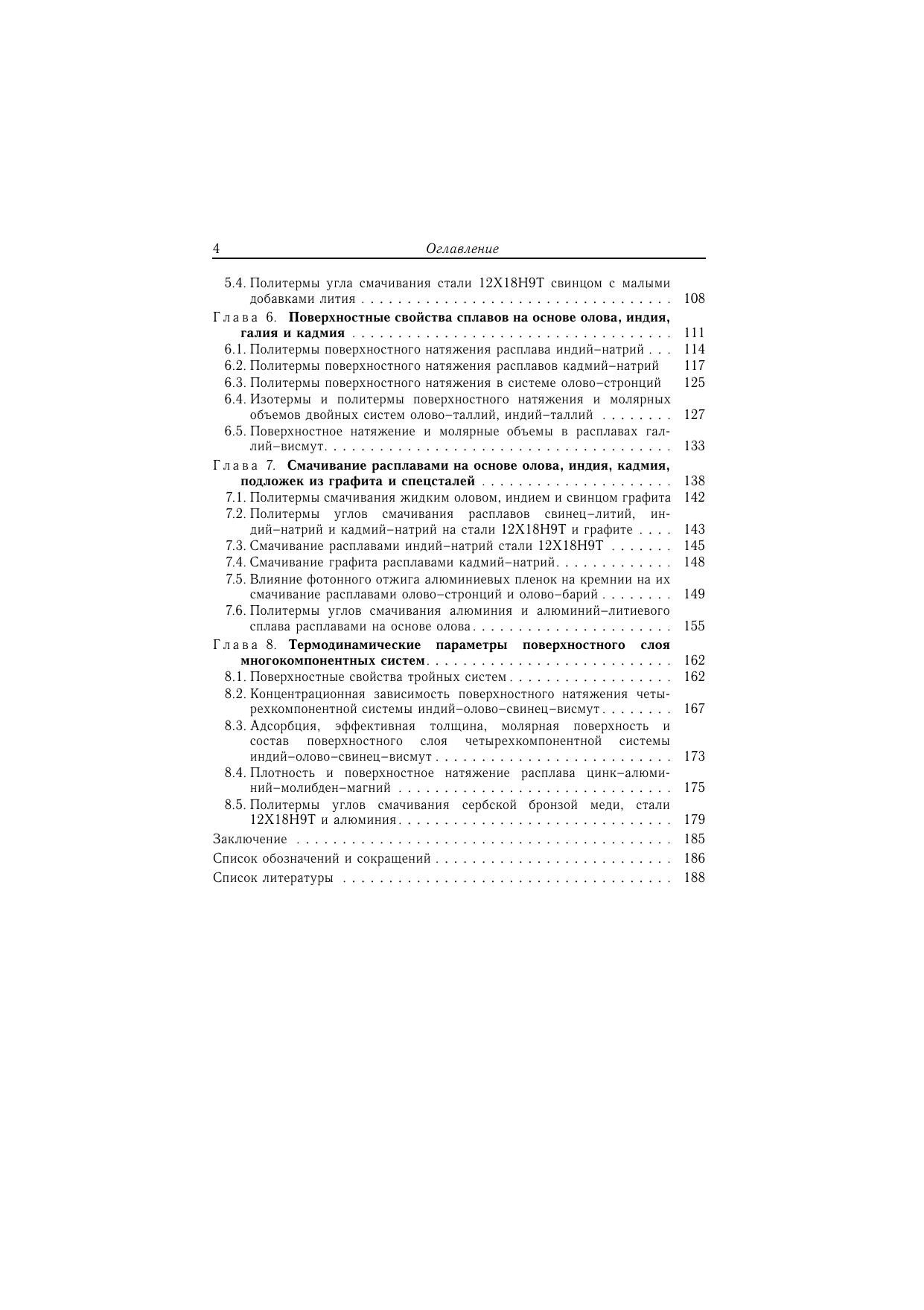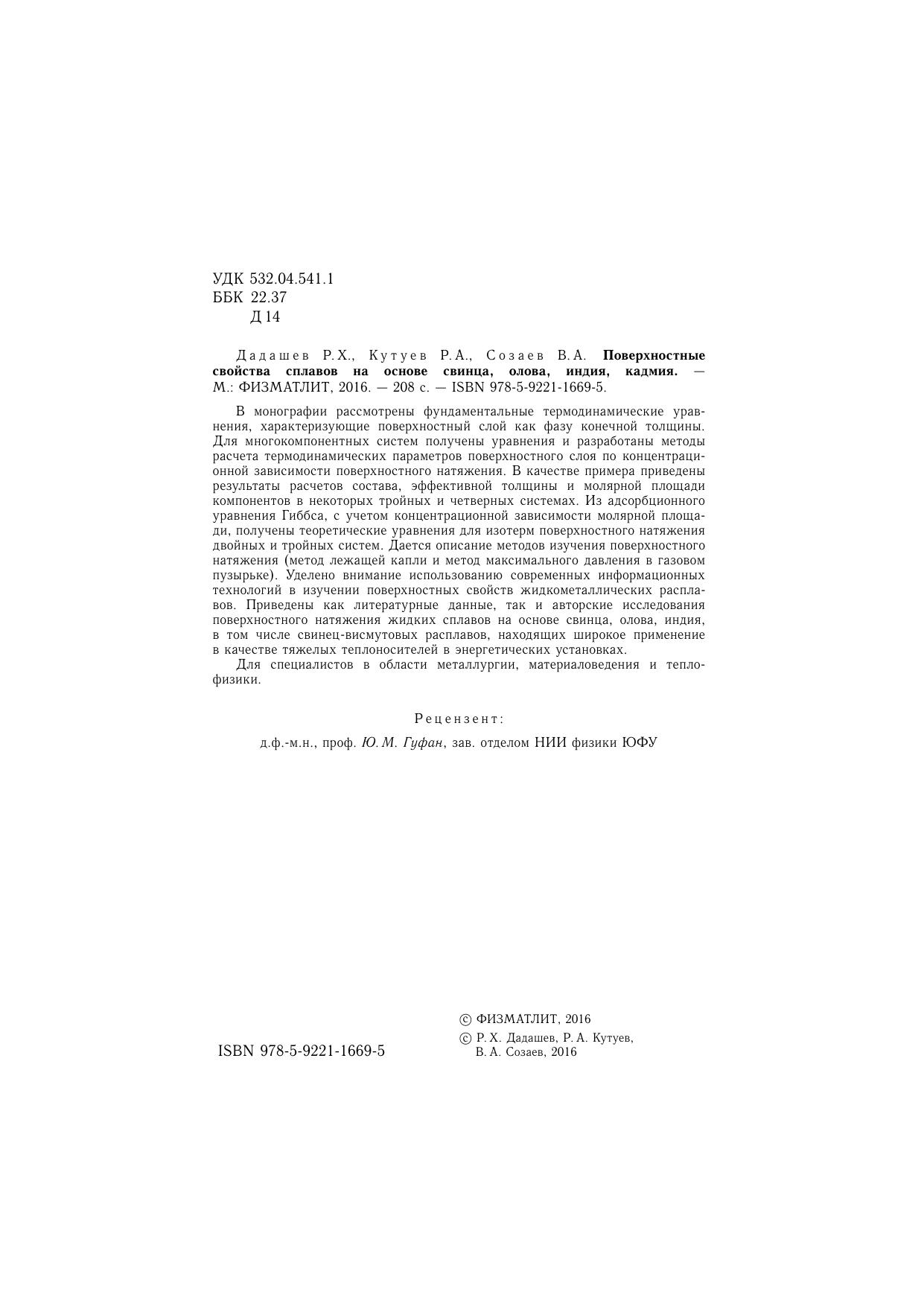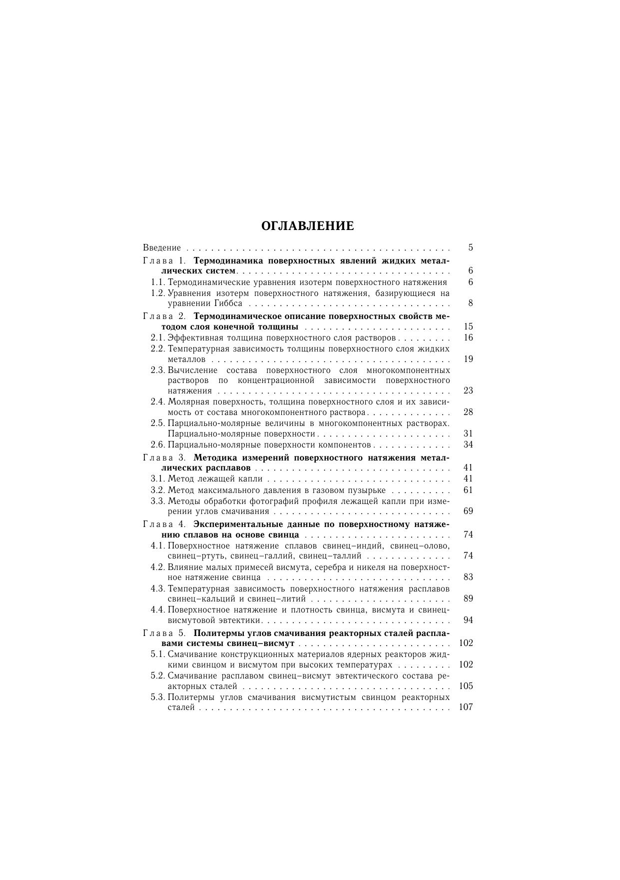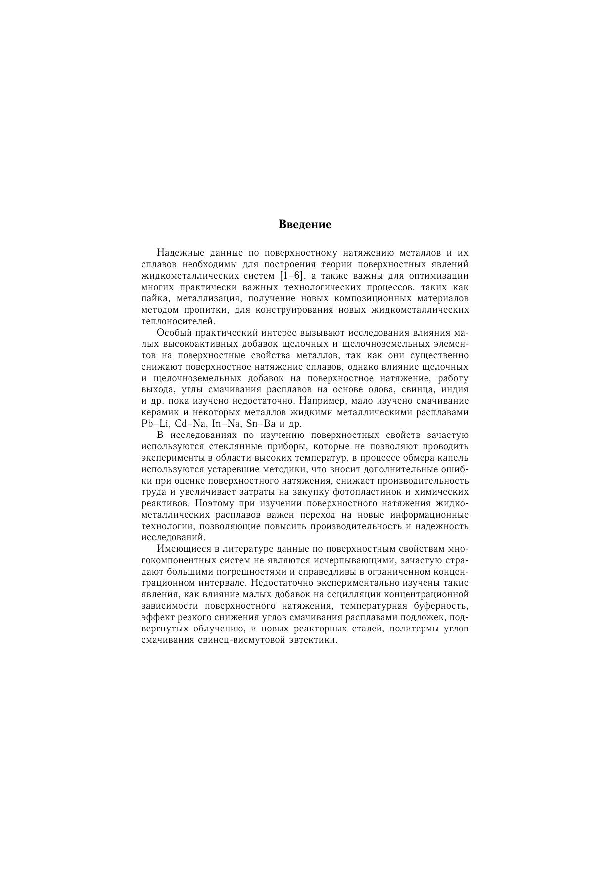 В монографии рассмотрены фундаментальные термодинамические уравнения, характеризующие поверхностный слой как фазу конечной толщины. Для многокомпонентных систем получены уравнения и разработаны методы расчета термодинамических параметров поверхностного слоя по концентрационной зависимости поверхностного натяжения. В качестве примера приведены результаты расчетов состава, эффективной толщины и молярной площади компонентов в некоторых тройных и четверных системах. Из адсорбционного уравнения Гиббса, с учетом концентрационной зависимости молярной площади, получены теоретические уравнения для изотерм поверхностного натяжения двойных и тройных систем. Дается описание методов изучения поверхностного натяжения (метод лежащей капли и метод максимального давления в газовом пузырьке). Уделено внимание использованию современных информационных технологий в изучении поверхностных свойств жидкометаллических расплавов. Приведены как литературные данные, так и авторские исследования поверхностного натяжения жидких сплавов на основе свинца, олова, индия, в том числе свинец-висмутовых расплавов, находящих широкое применение в качестве тяжелых теплоносителей в энергетических установках.
