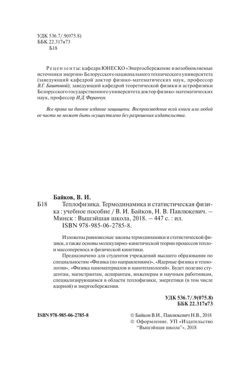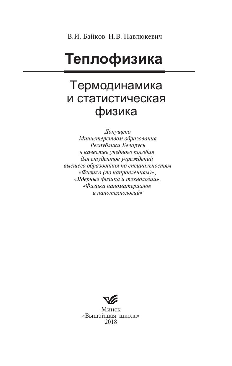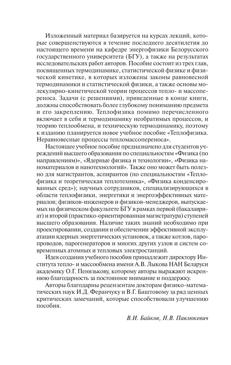 Изложены равновесные законы термодинамики и статистической физики, а также основы молекулярно-кинетической теории процессов тепло- и массопереноса и физической кинетики. Предназначено для студентов учреждений высшего образования по специальностям «Физика (по направлениям)», «Ядерные физика и технологии», «Физика наноматериалов и нанотехнологий». Будет полезно студентам, магистрантам, аспирантам, инженерам и научным работникам, специализирующимся в области теплофизики, энергетики (в том числе ядерной) и энергосбережения.