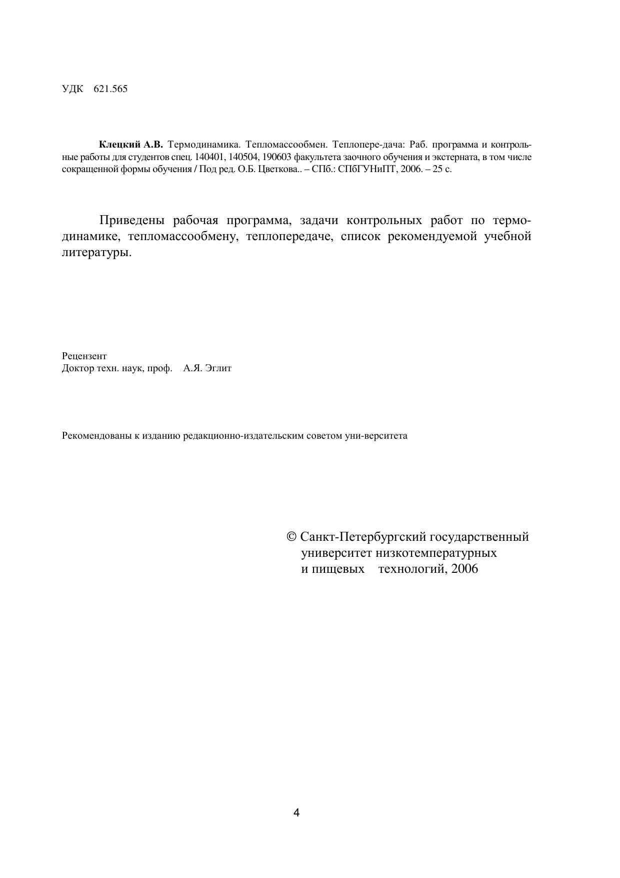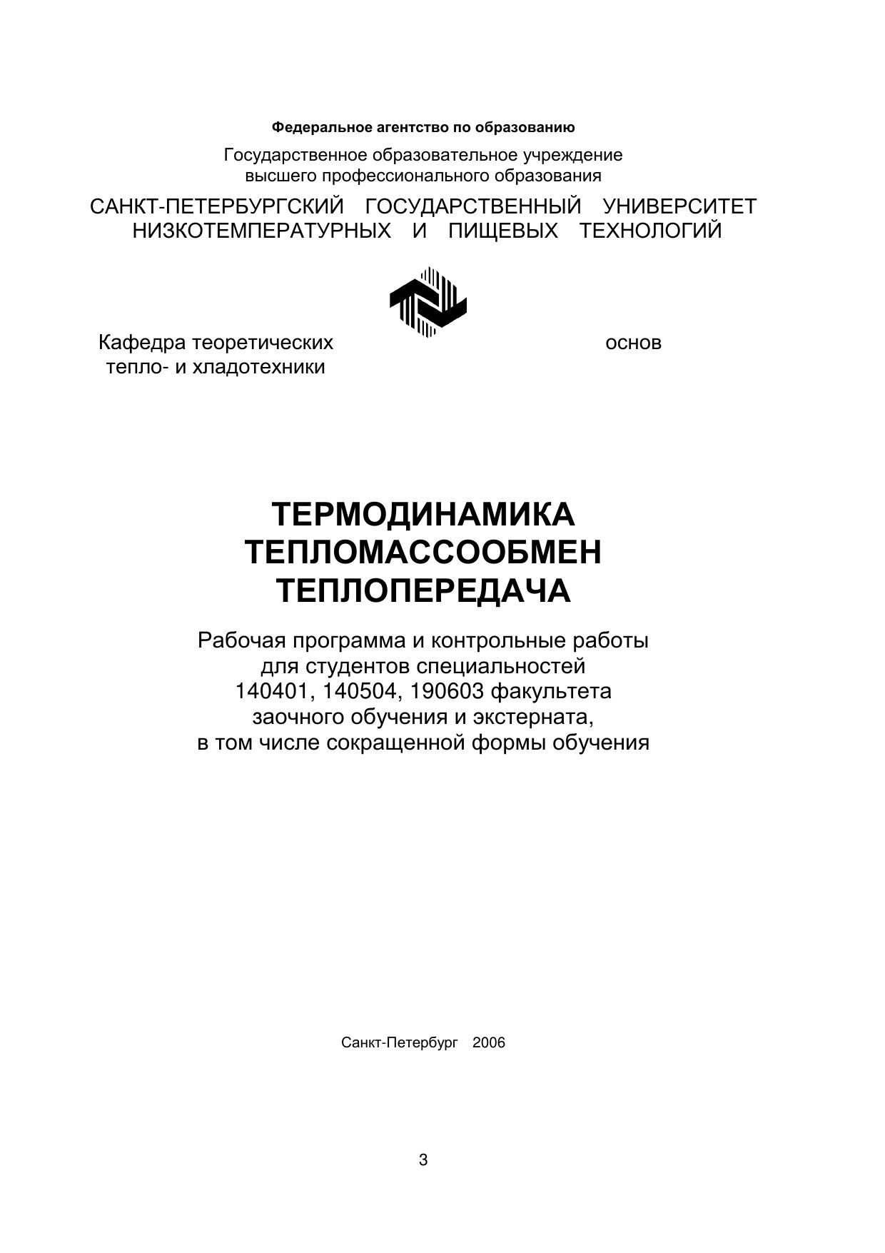 Термодинамика. Тепломассообмен. Теплопередача: Рабочая программа и контрольные работы для студентов спец. 140401, 140504, 190603 факультета заочного обучения и экстерната, в том числе сокращенной формы обучения