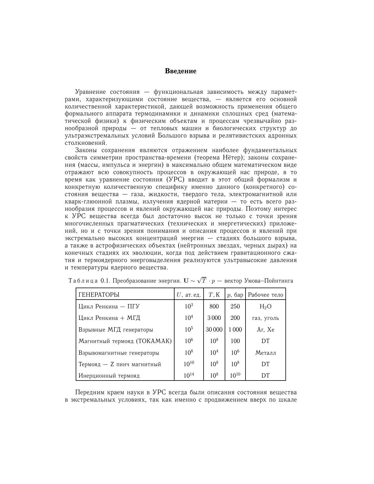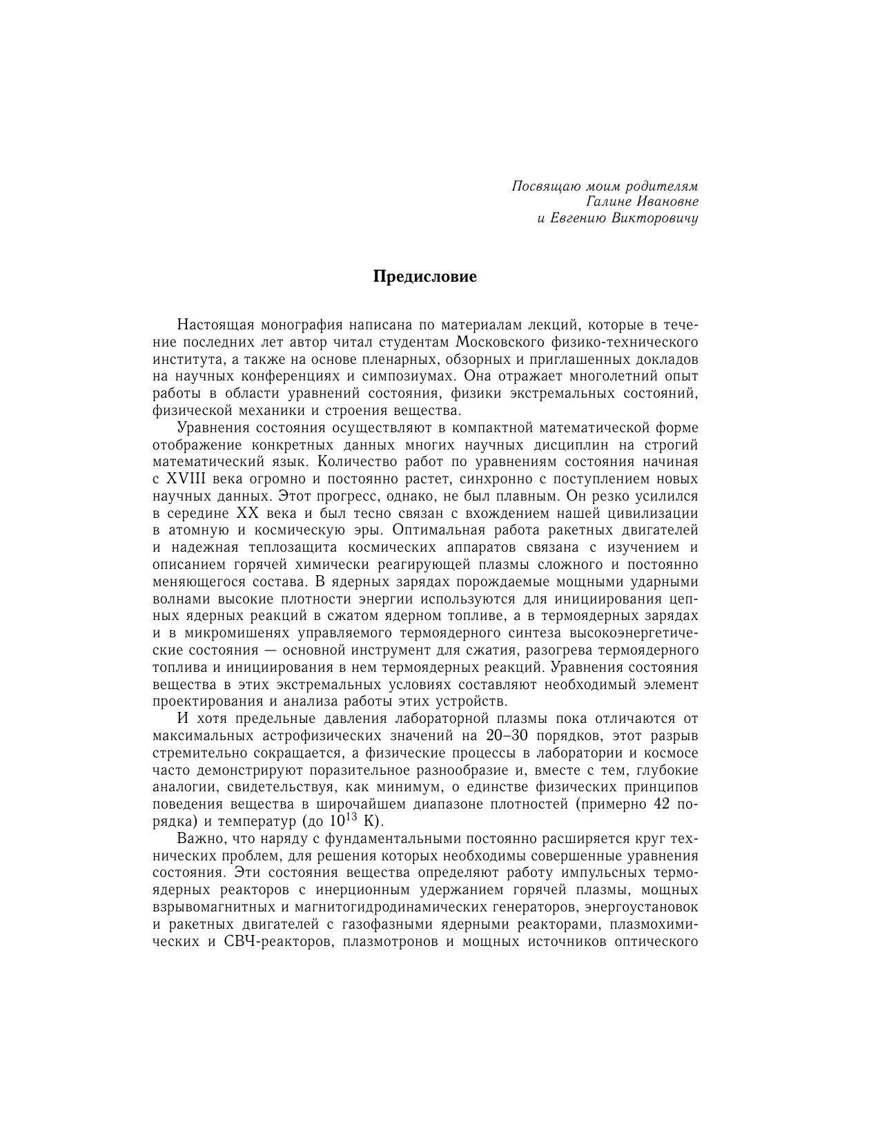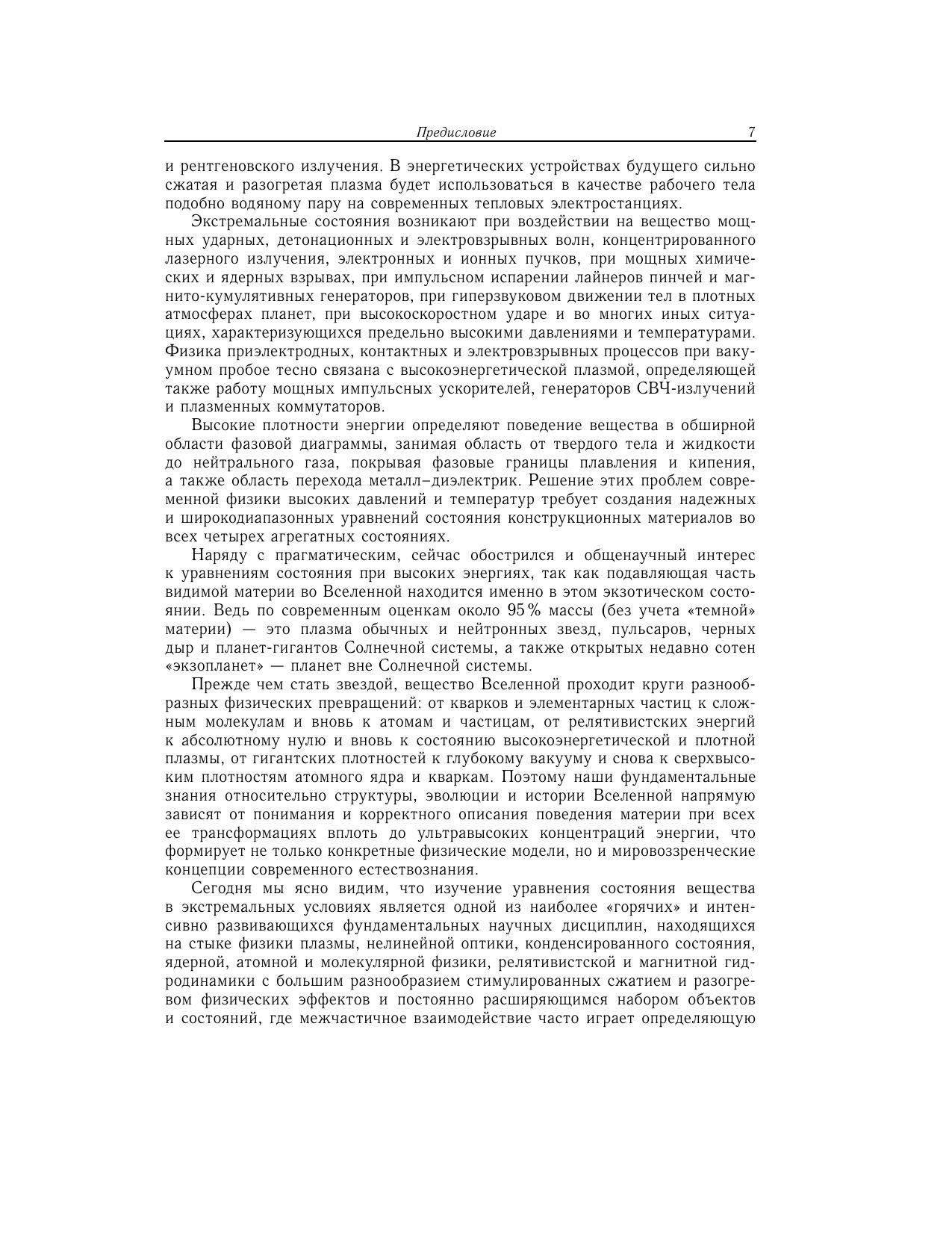 В монографии представлен сравнительный анализ различных термодинамических моделей уравнений состояния. Рассмотрены основные идейные предпосылки теоретических методов и эксперимент. Основное внимание уделено описанию состояний, представляющих наибольший интерес для физики высоких концентраций энергии, которые либо уже получены, либо в обозримом будущем могут быть получены в контролируемых условиях на Земле, либо реализуются в астрофизических объектах на разных этапах их эволюции. Рассмотрены также ультраэкстремальные астрофизические и ядернофизические приложения, где на термодинамику вещества существенное влияние оказывают релятивизм, мощные гравитационные и магнитные поля, тепловое излучение, превращение ядерных частиц, нейтронизация нуклонов и деконфайнмент кварков. Для широкого круга специалистов, занимающихся уравнениями состояния вещества и физикой высоких плотностей энергии, а также для студентов старших курсов и аспирантов.