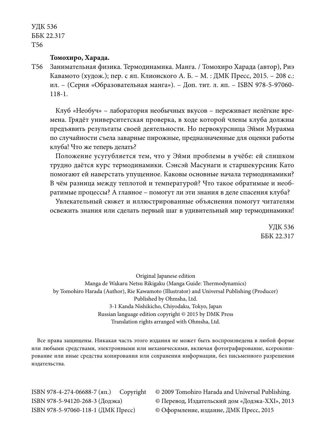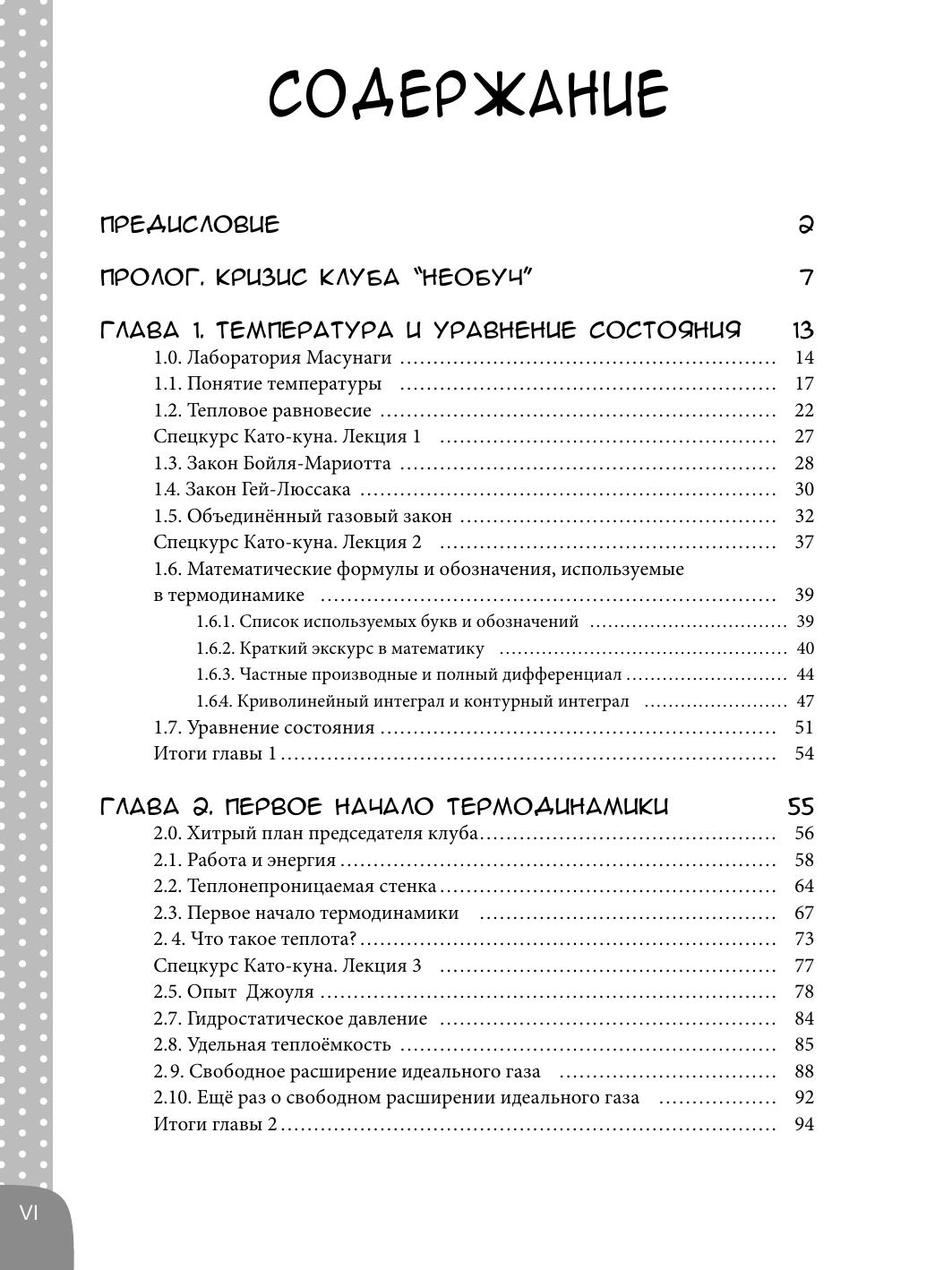Клуб «Необуч» – лаборатория необычных вкусов – переживает нелёгкие времена. Грядёт университетская проверка, в ходе которой члены клуба должны предъявить результаты своей деятельности. Но первокурсница Эйми Мураяма по случайности съела заварные пирожные, предназначенные для оценки работы клуба! Что же теперь делать? Положение усугубляется тем, что у Эйми проблемы в учёбе: ей слишком трудно даётся курс термодинамики. Сэнсэй Масунаги и старшекурсник Като помогают ей наверстать упущенное. Каковы основные начала термодинамики? В чём разница между теплотой и температурой? Что такое обратимые и необратимые процессы? А главное – помогут ли эти знания в деле спасения клуба? Увлекательный сюжет и иллюстрированные объяснения помогут читателям освежить знания или сделать первый шаг в удивительный мир термодинамики!