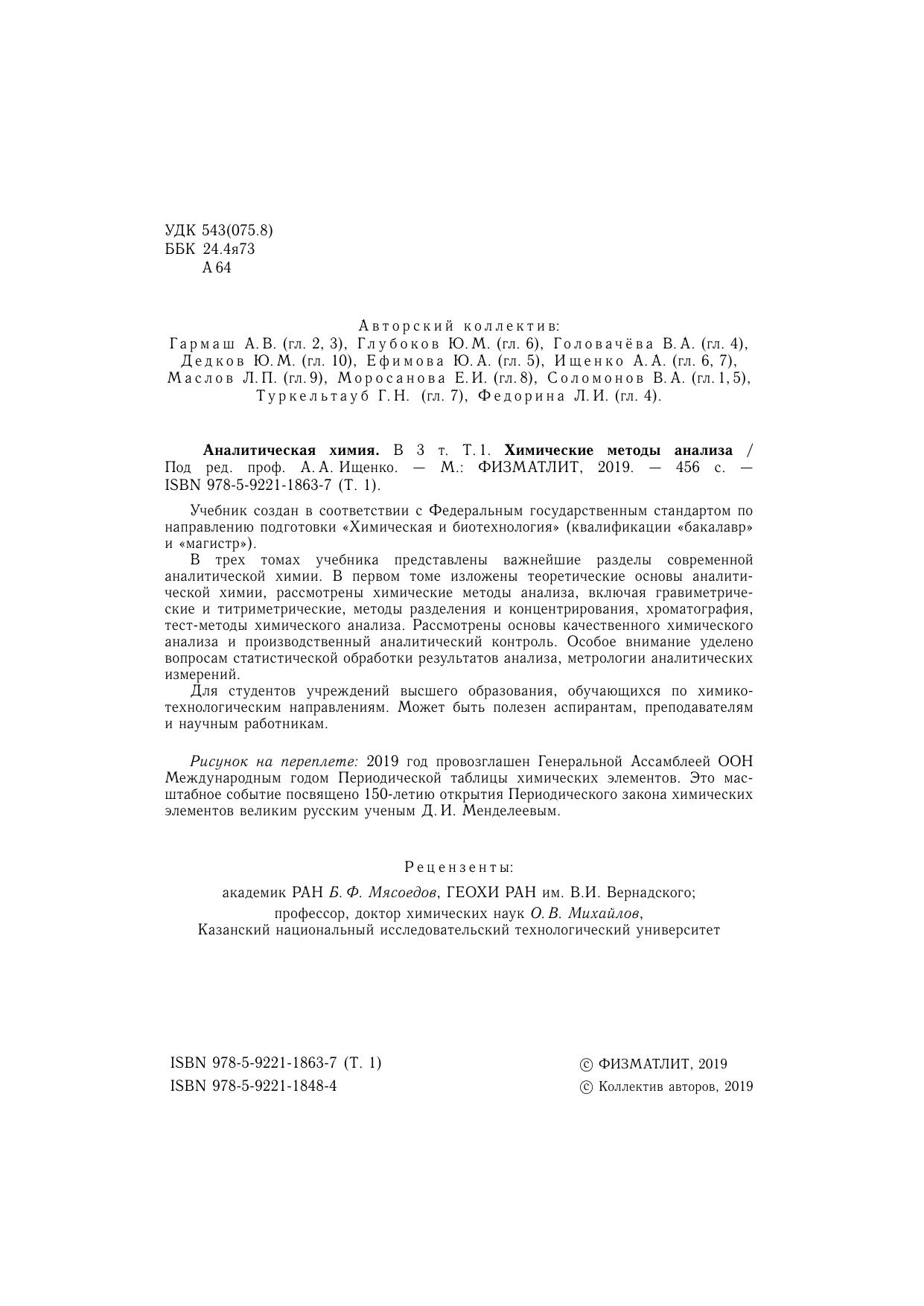 аналитической химии. В первом томе изложены теоретические основы аналитической химии, рассмотрены химические методы анализа, включая гравиметрические и титриметрические, методы разделения и концентрирования, хроматография,
