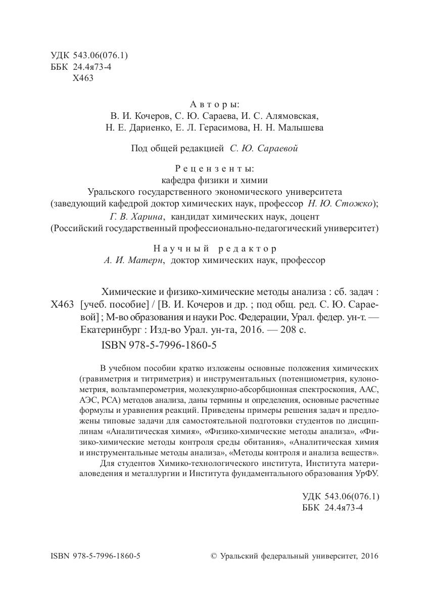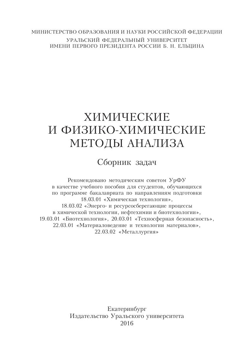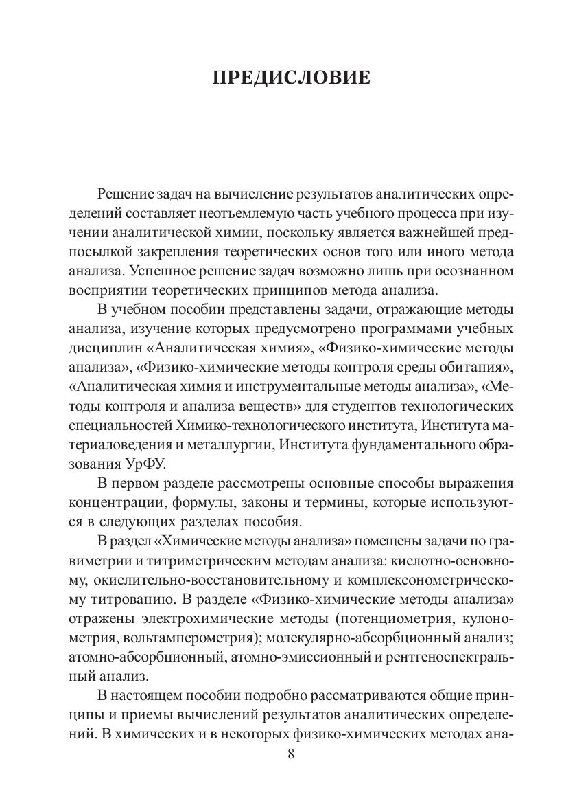 В учебном пособии кратко изложены основные положения химических (гравиметрия и титриметрия) и инструментальных (потенциометрия, кулонометрия, вольтамперометрия, молекулярно-абсорбционная спектроскопия, ААС, АЭС, РСА) методов анализа, даны термины и определения, основные расчетные формулы и уравнения реакций. Приведены примеры решения задач и предложены типовые задачи для самостоятельной подготовки студентов по дисциплинам «Аналитическая химия», «Физико-химические методы анализа», «Физико-химические методы контроля среды обитания», «Аналитическая химия и инструментальные методы анализа», «Методы контроля и анализа веществ». Для студентов Химико-технологического института, Института материаловедения и металлургии и Института фундаментального образования УрФУ.