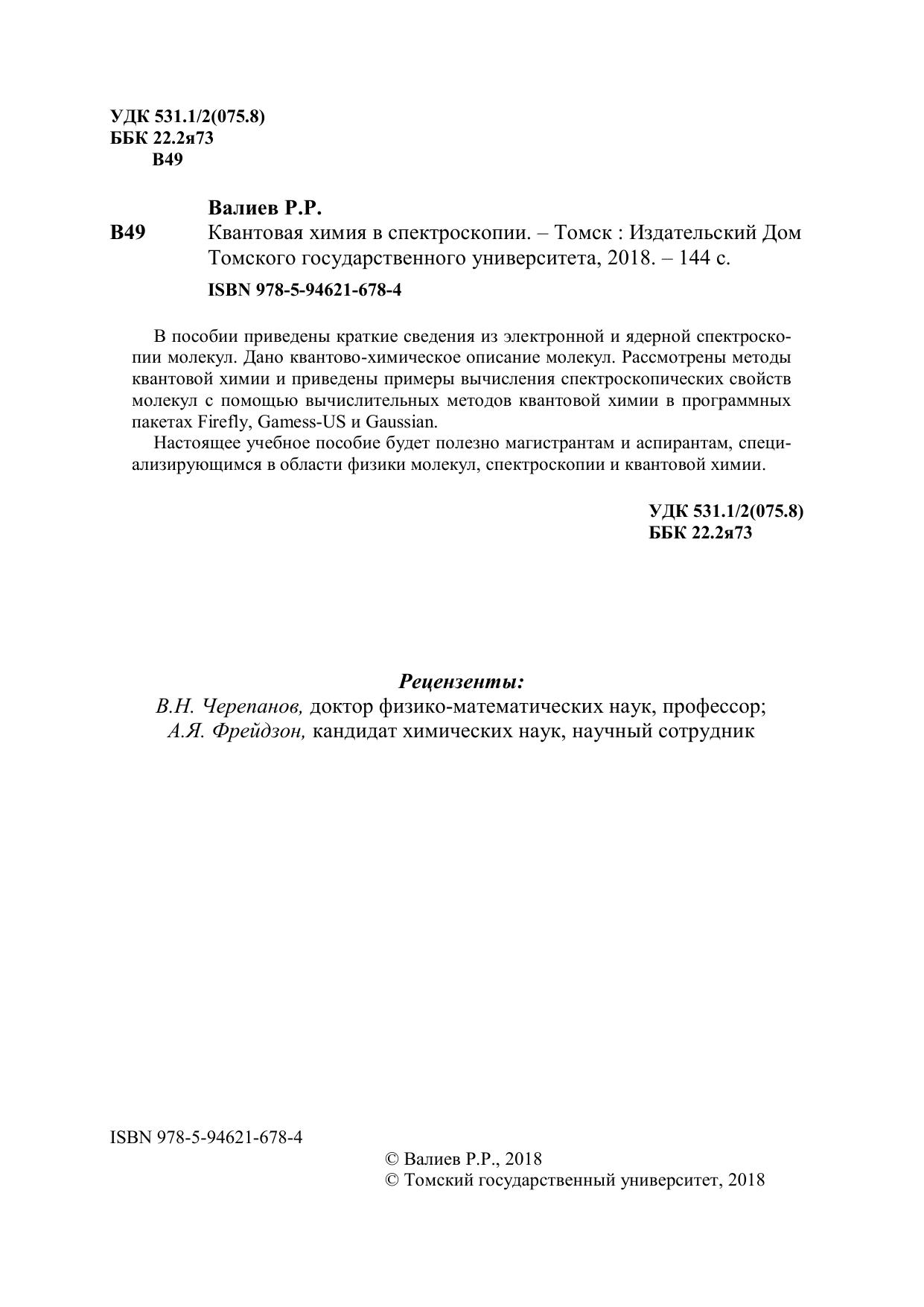 В пособии приведены краткие сведения из электронной и ядерной спектроскопии молекул. Дано квантово-химическое описание молекул. Рассмотрены методы квантовой химии и приведены примеры вычисления спектроскопических свойств молекул с помощью вычислительных методов квантовой химии в программных пакетах Firefly, Gamess-US и Gaussian. Настоящее учебное пособие будет полезно магистрантам и аспирантам, специализирующимся в области физики молекул, спектроскопии и квантовой химии.