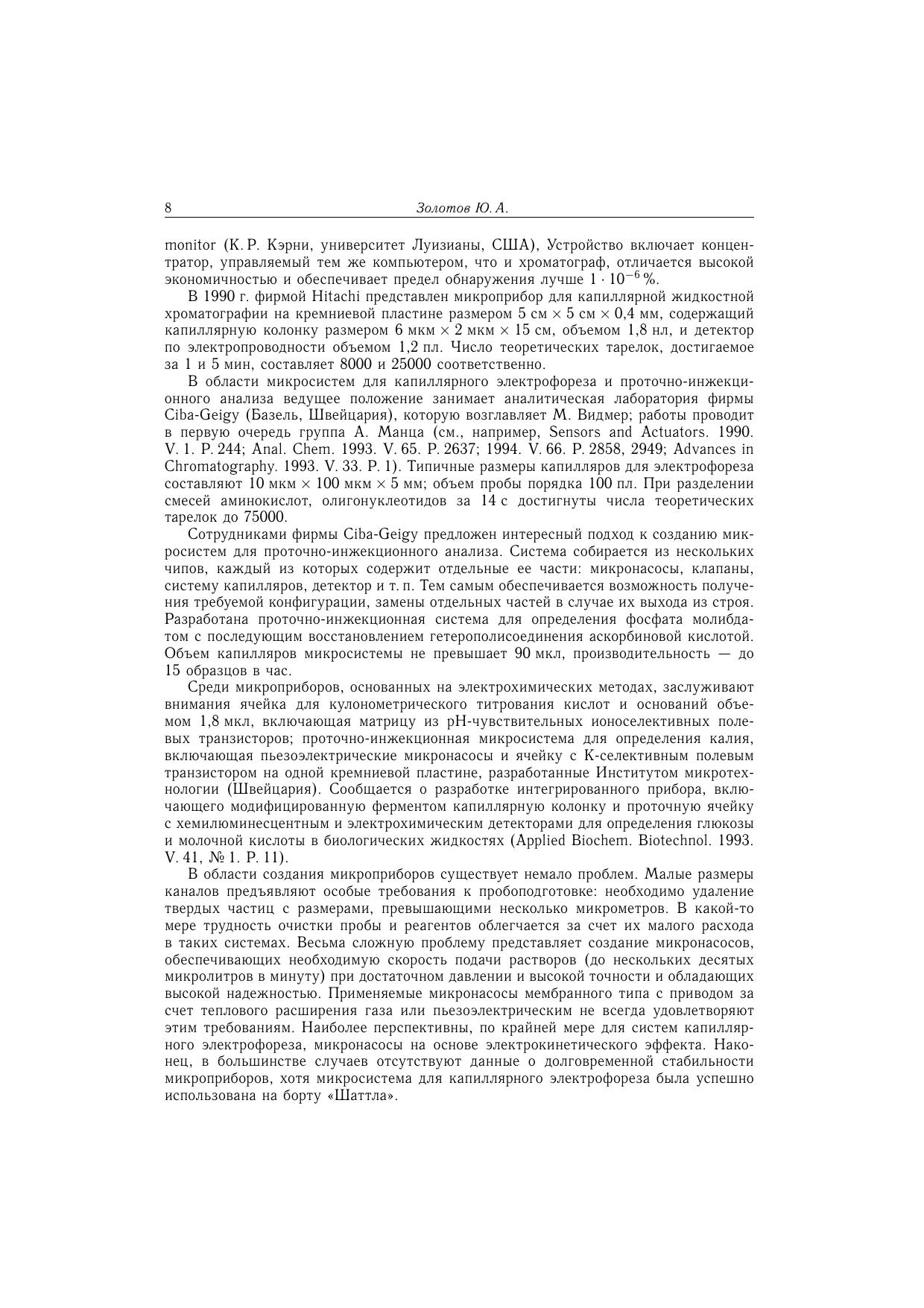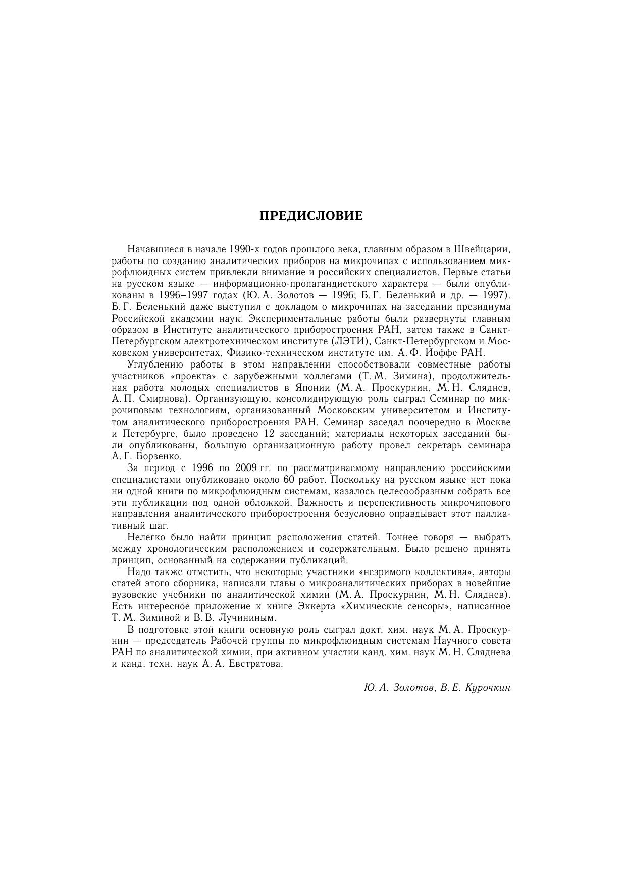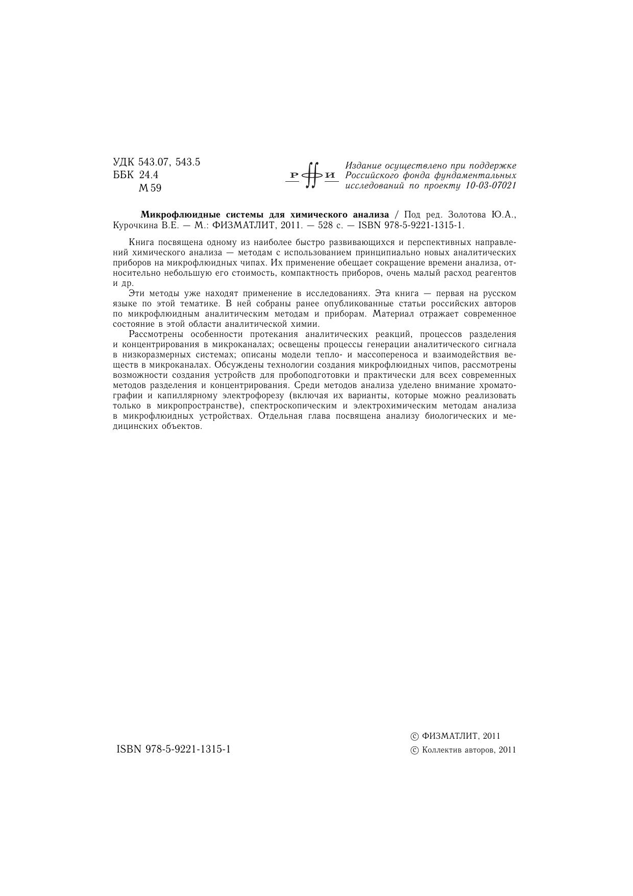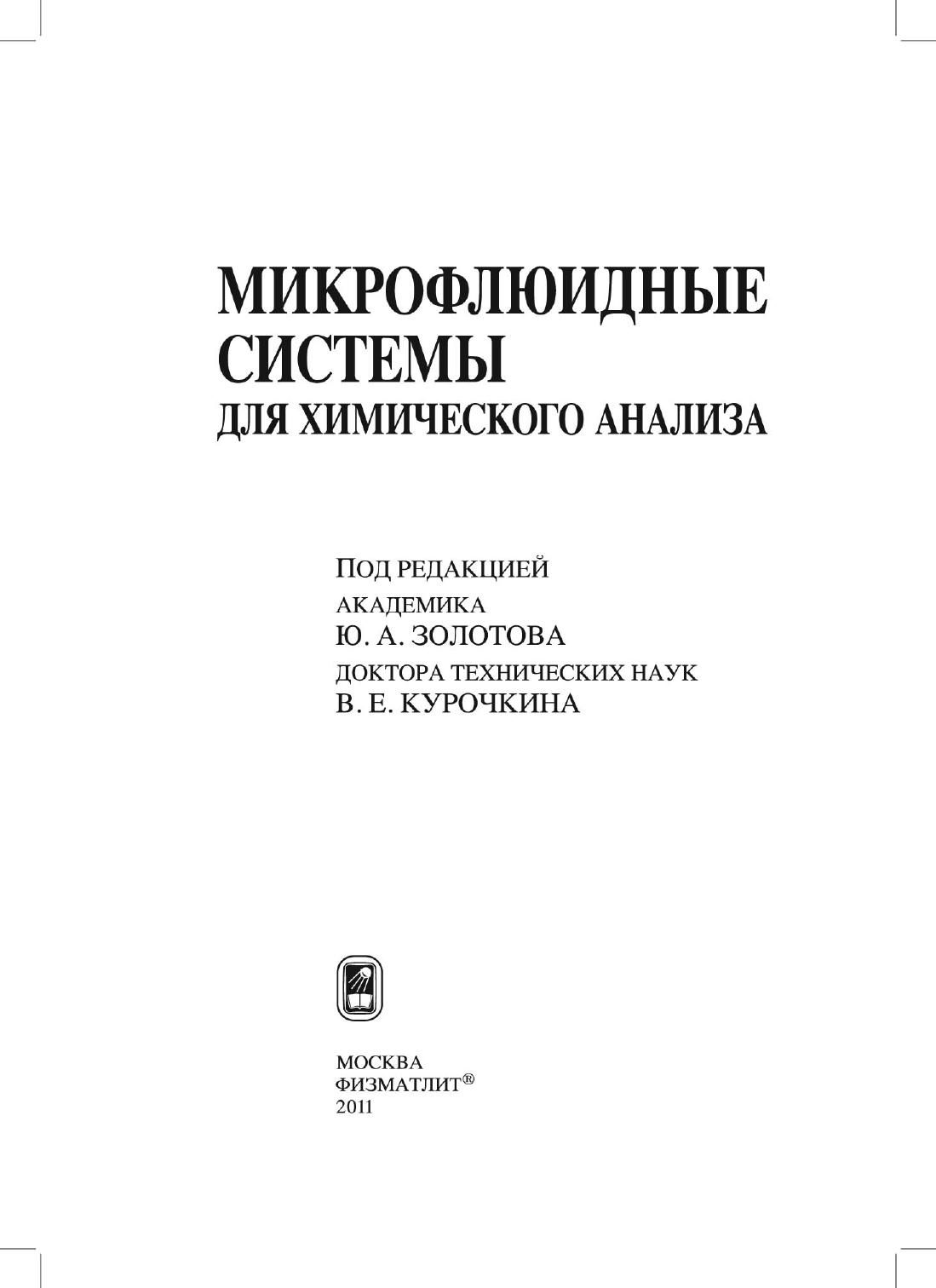 Книга посвящена одному из наиболее быстро развивающихся и перспективных направлений химического анализа — методам с использованием принципиально новых аналитических приборов на микрофлюидных чипах. Их применение обещает сокращение времени анализа, относительно небольшую его стоимость, компактность приборов, очень малый расход реагентов и др. Эти методы уже находят применение в исследованиях. Эта книга — первая на русском языке по этой тематике. В ней собраны ранее опубликованные статьи российских авторов по микрофлюидным аналитическим методам и приборам. Материал отражает современное состояние в этой области аналитической химии. Рассмотрены особенности протекания аналитических реакций, процессов разделения и концентрирования в микроканалах освещены процессы генерации аналитического сигнала в низкоразмерных системах описаны модели тепло- и массопереноса и взаимодействия веществ в микроканалах. Обсуждены технологии создания микрофлюидных чипов, рассмотрены возможности создания устройств для пробоподготовки и практически для всех современных методов разделения и концентрирования. Среди методов анализа уделено внимание хроматографии и капиллярному электрофорезу (включая их варианты, которые можно реализовать только в микропространстве), спектроскопическим и электрохимическим методам анализа в микрофлюидных устройствах. Отдельная глава посвящена анализу биологических и медицинских объектов.