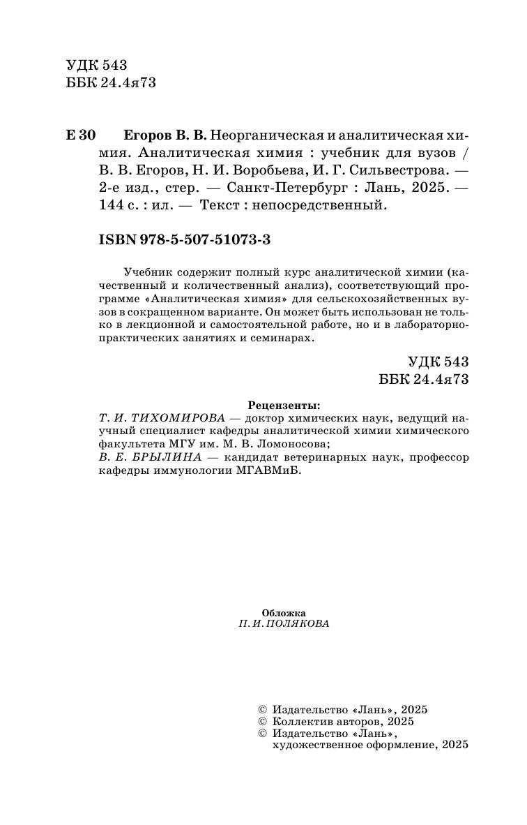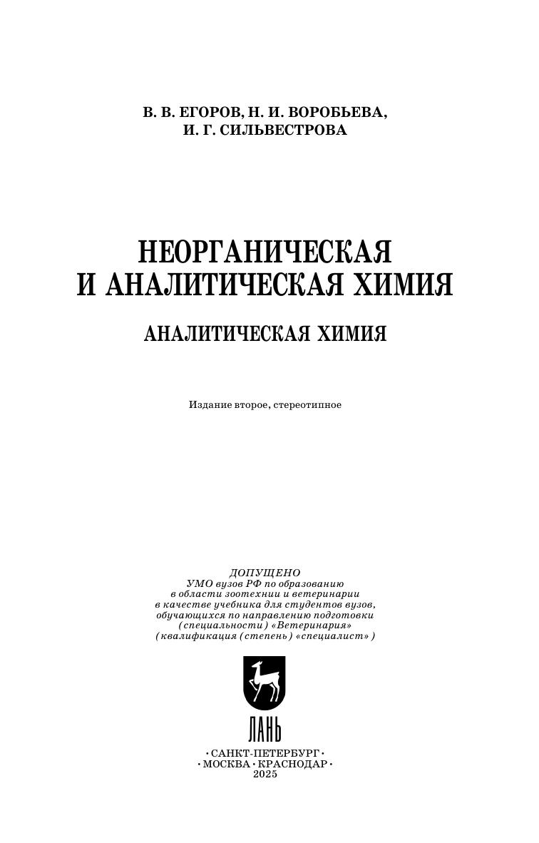 Неорганическая и аналитическая химия. Аналитическая химия Егоров В. В., Воробьева Н. И., Сильвестрова И. Г.