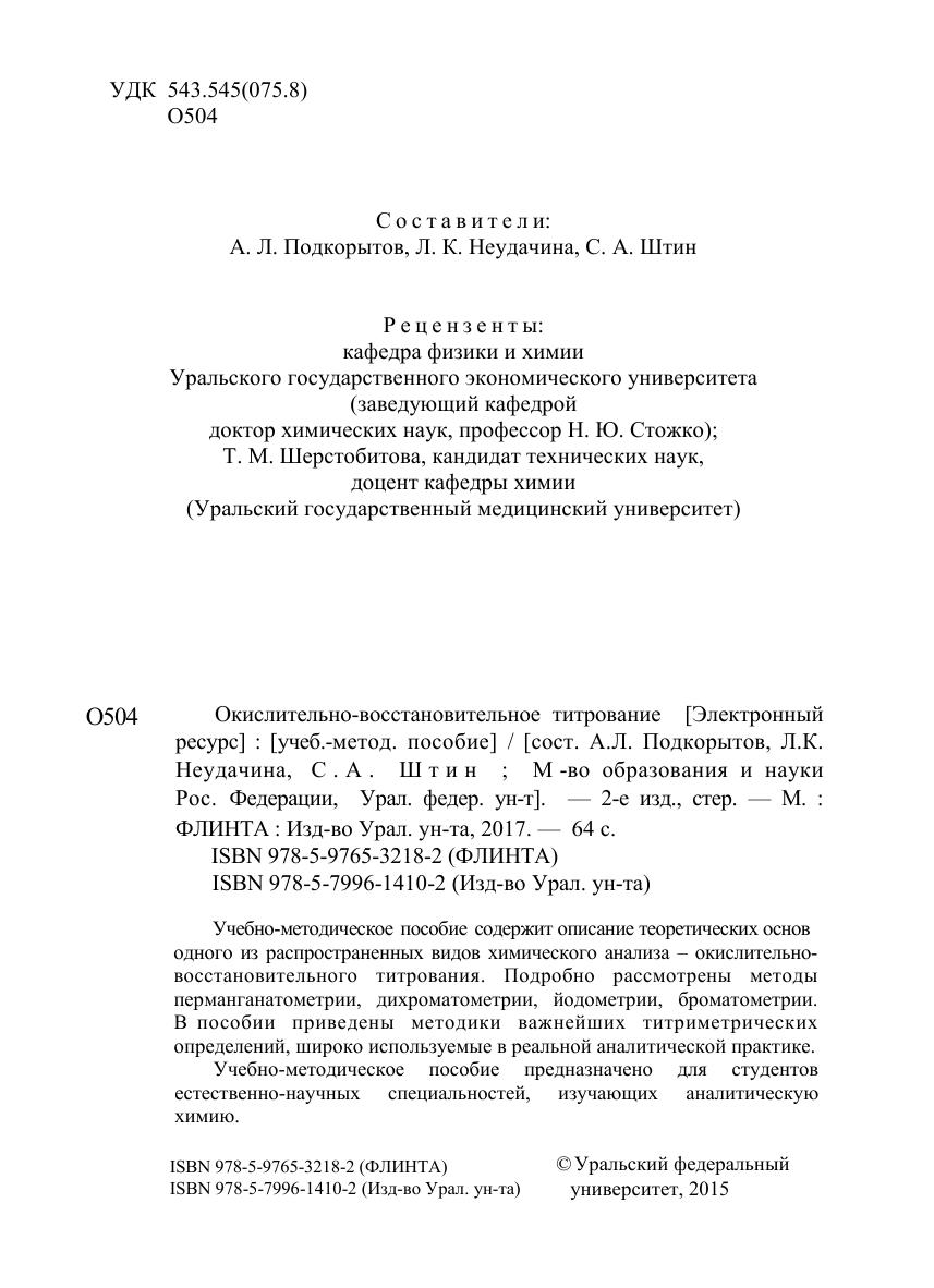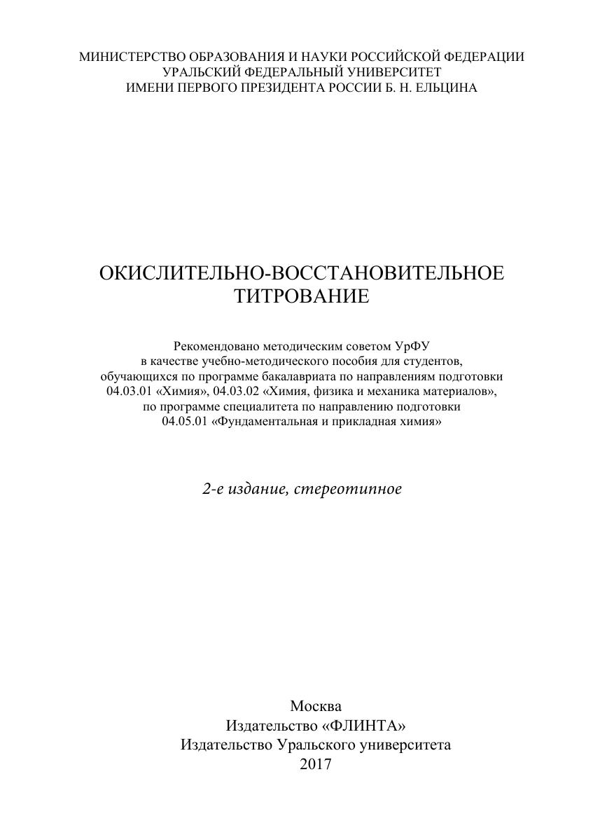 Учебно-методическое пособие содержит описание теоретических основ одного из распространенных видов химического анализа – окислительно-восстановительного титрования. Подробно рассмотрены методы перманганатометрии, дихроматометрии, йодометрии, броматометрии. В пособии приведены методики важнейших титриметрических определений, широко используемые в реальной аналитической практике. Учебно-методическое пособие предназначено для студентов естественно-научных специальностей, изучающих аналитическую химию.