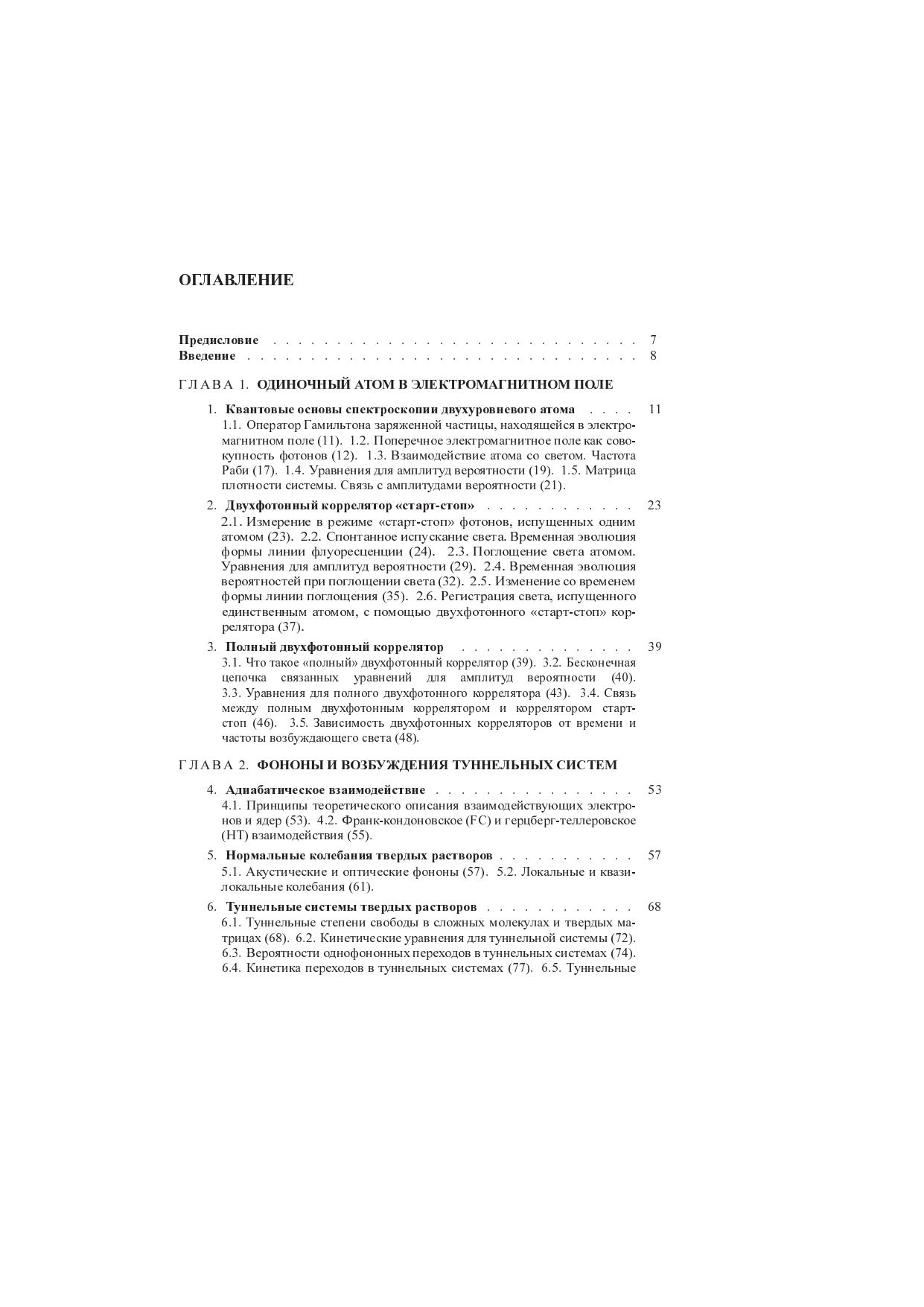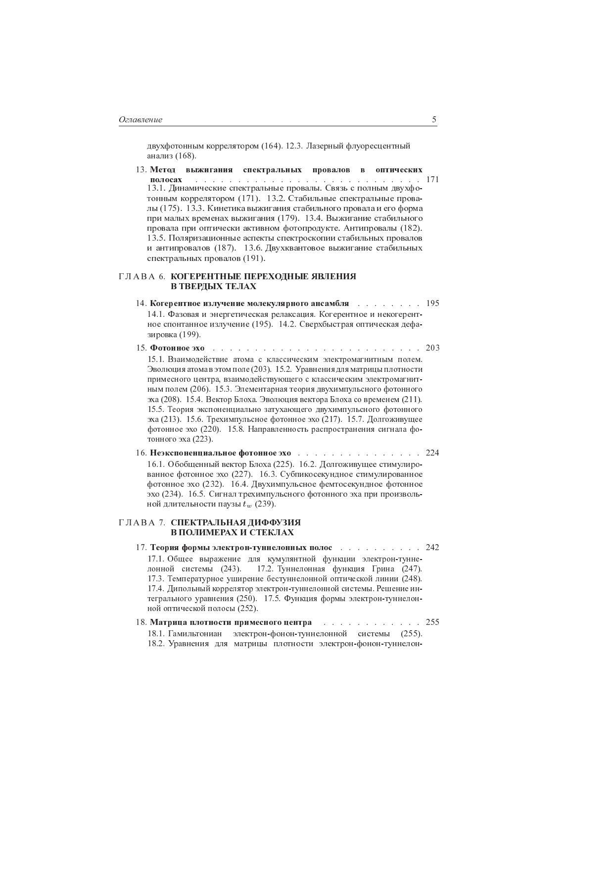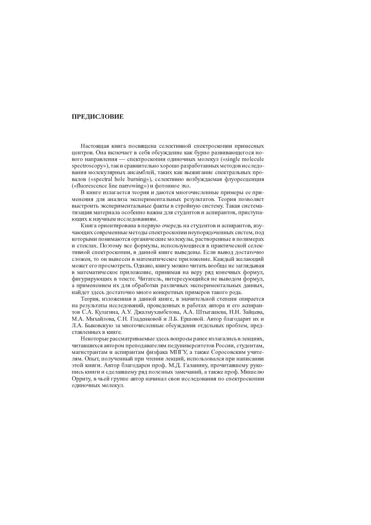 Обсуждаются теоретические основы спектроскопии одиночных молекул. Проводится анализ достоинств и недостатков одно- и двухфотонных методов счета, применяемых в спектроскопии одиночного примесного центра. Представлены теоретические основы традиционных методов селективной спектроскопии примесных центров в полимерах и стеклах, таких, как выжигание спектральных провалов и селективно возбуждаемой флуоресценции. Излагается динамическая теория спектральной диффузии, обусловленной туннельными переходами в низкотемпературных полимерах и стеклах, а также теория сверхбыстрой фазовой релаксации примесных центров, проявляющейся в неэкспоненциальном двух- и трехимпульсном фемтосекундном фотонном эхе. Рассмотрены многочисленные примеры применения теоретических формул, выведенных в книге, для обработки конкретных экспериментальных данных, добытых методами селективной лазерной спектроскопии. Для специалистов в области спектроскопии низкотемпературных твердых растворов, а также для студентов и аспирантов, специализирующихся в этой области