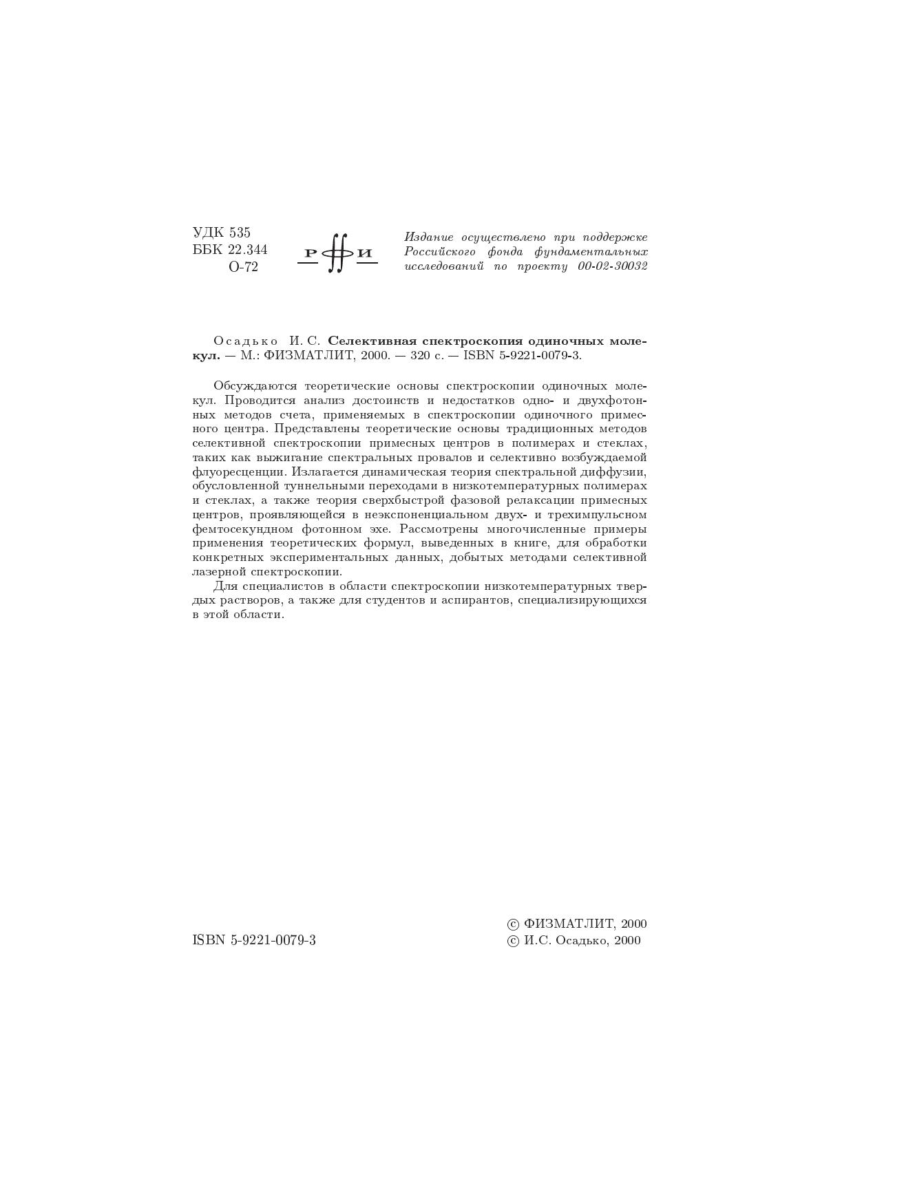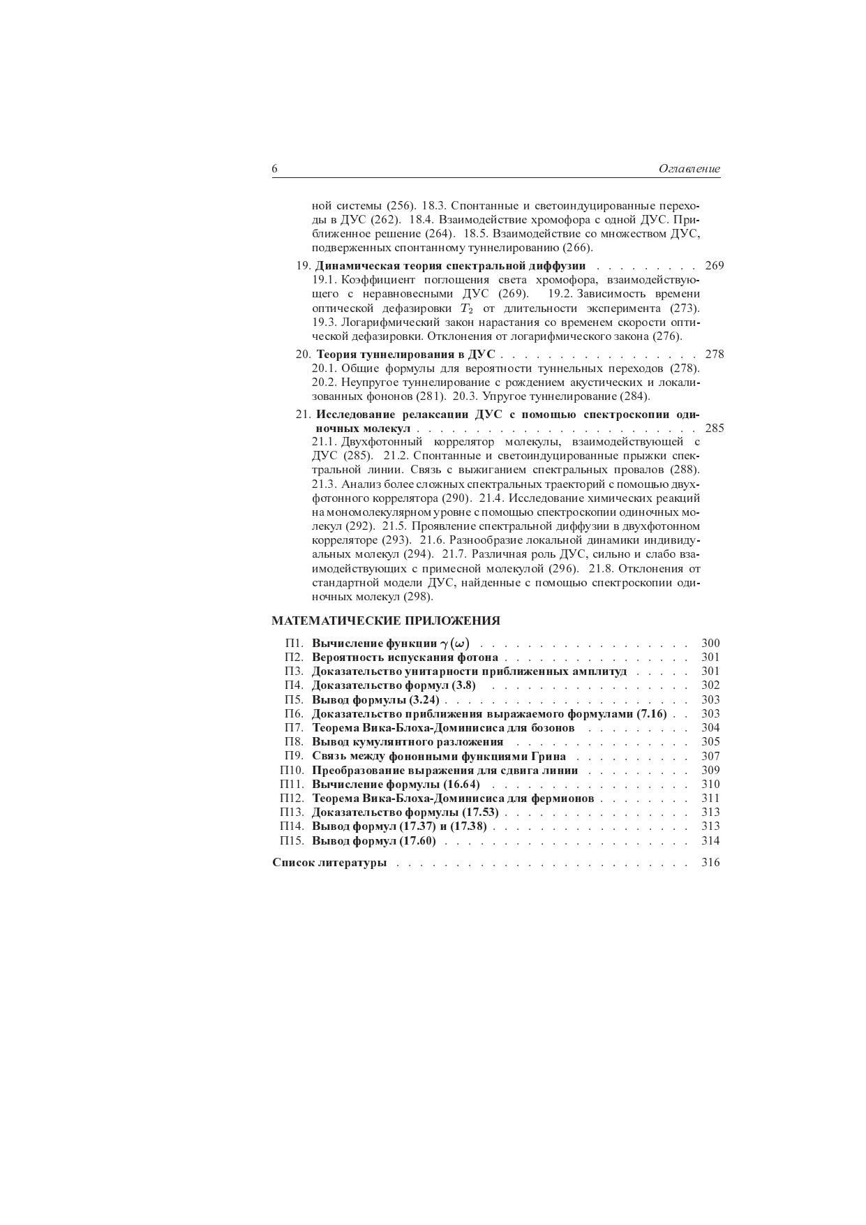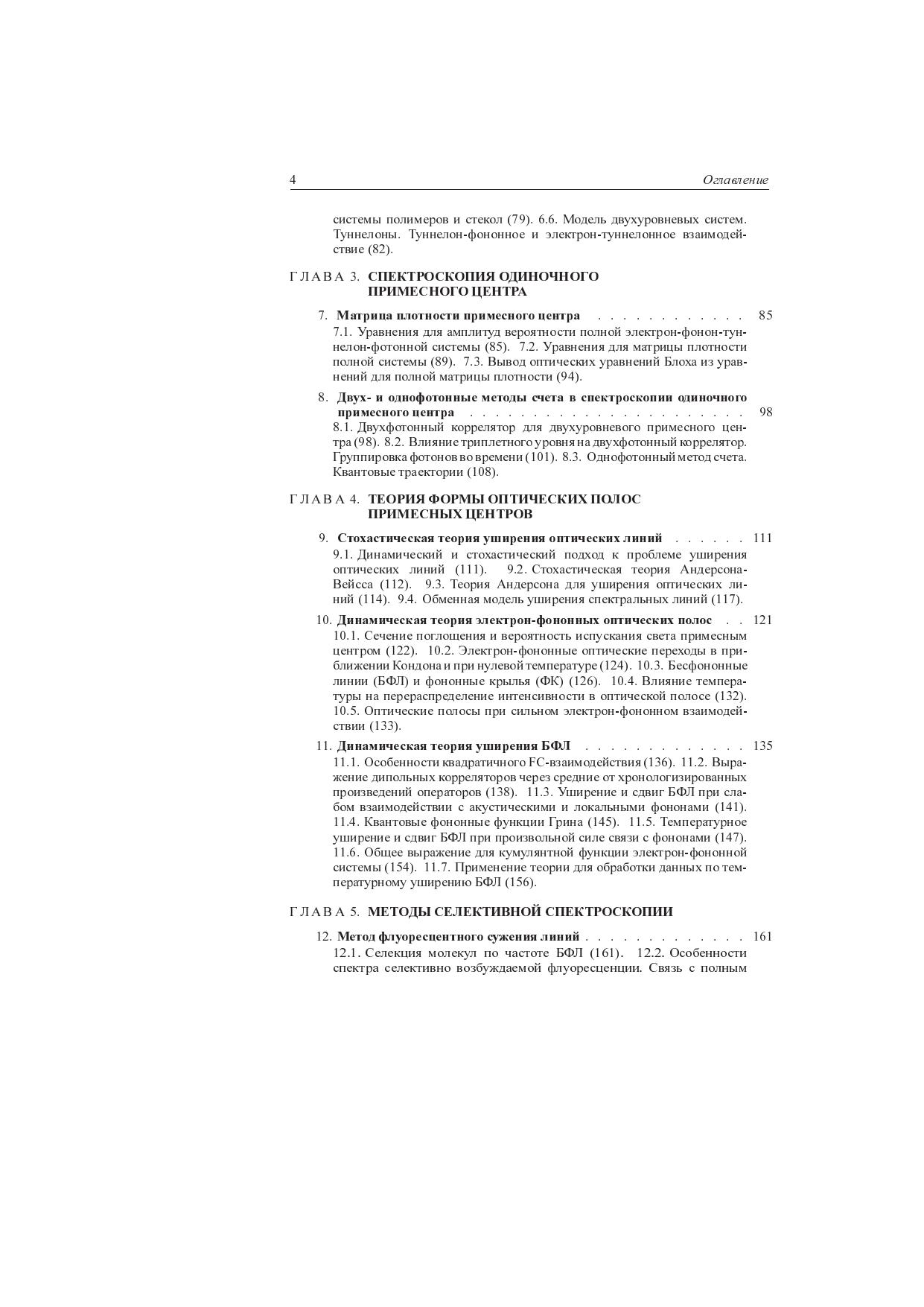 Обсуждаются теоретические основы спектроскопии одиночных молекул. Проводится анализ достоинств и недостатков одно- и двухфотонных методов счета, применяемых в спектроскопии одиночного примесного центра. Представлены теоретические основы традиционных методов селективной спектроскопии примесных центров в полимерах и стеклах, таких, как выжигание спектральных провалов и селективно возбуждаемой флуоресценции. Излагается динамическая теория спектральной диффузии, обусловленной туннельными переходами в низкотемпературных полимерах и стеклах, а также теория сверхбыстрой фазовой релаксации примесных центров, проявляющейся в неэкспоненциальном двух- и трехимпульсном фемтосекундном фотонном эхе. Рассмотрены многочисленные примеры применения теоретических формул, выведенных в книге, для обработки конкретных экспериментальных данных, добытых методами селективной лазерной спектроскопии. Для специалистов в области спектроскопии низкотемпературных твердых растворов, а также для студентов и аспирантов, специализирующихся в этой области