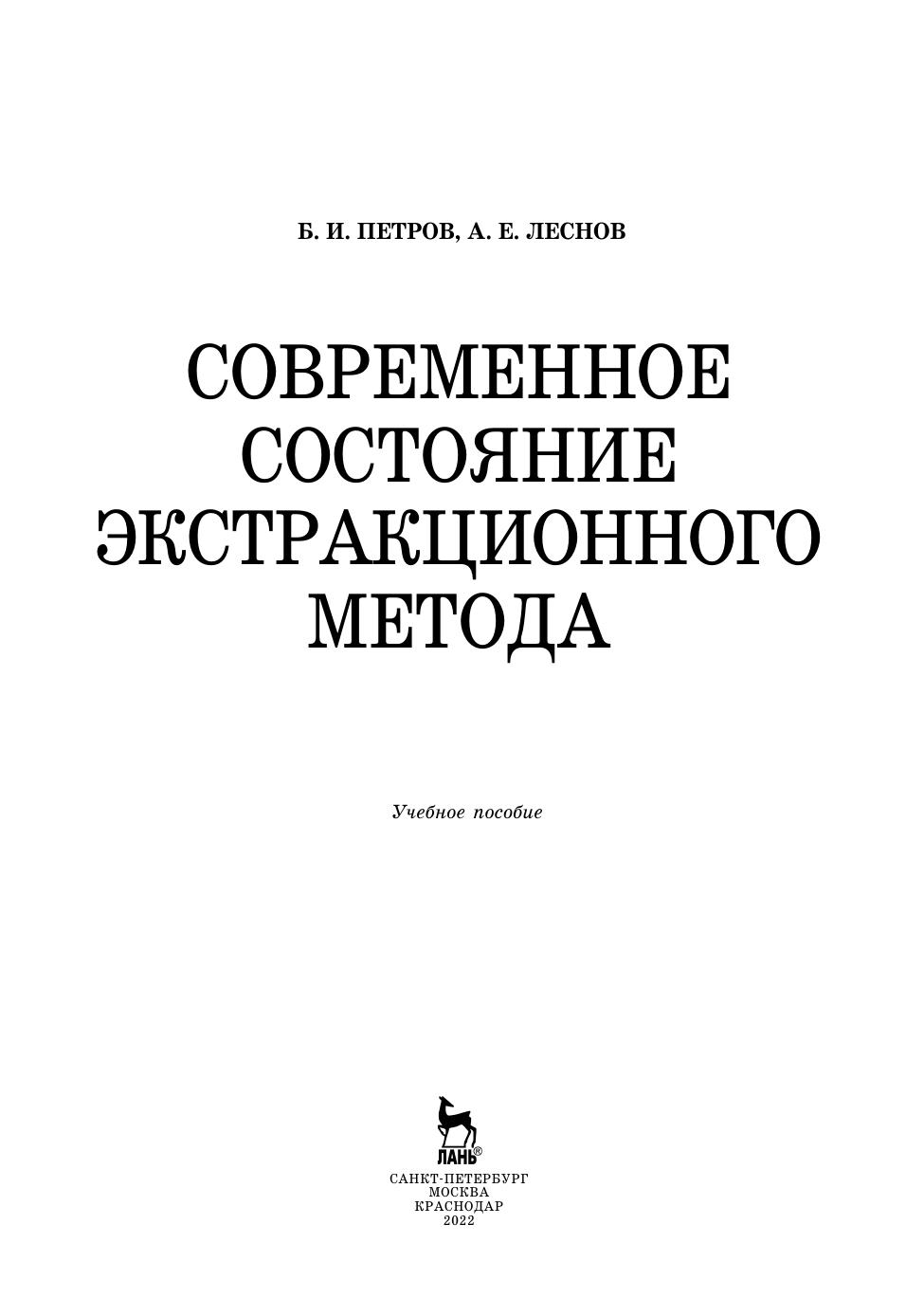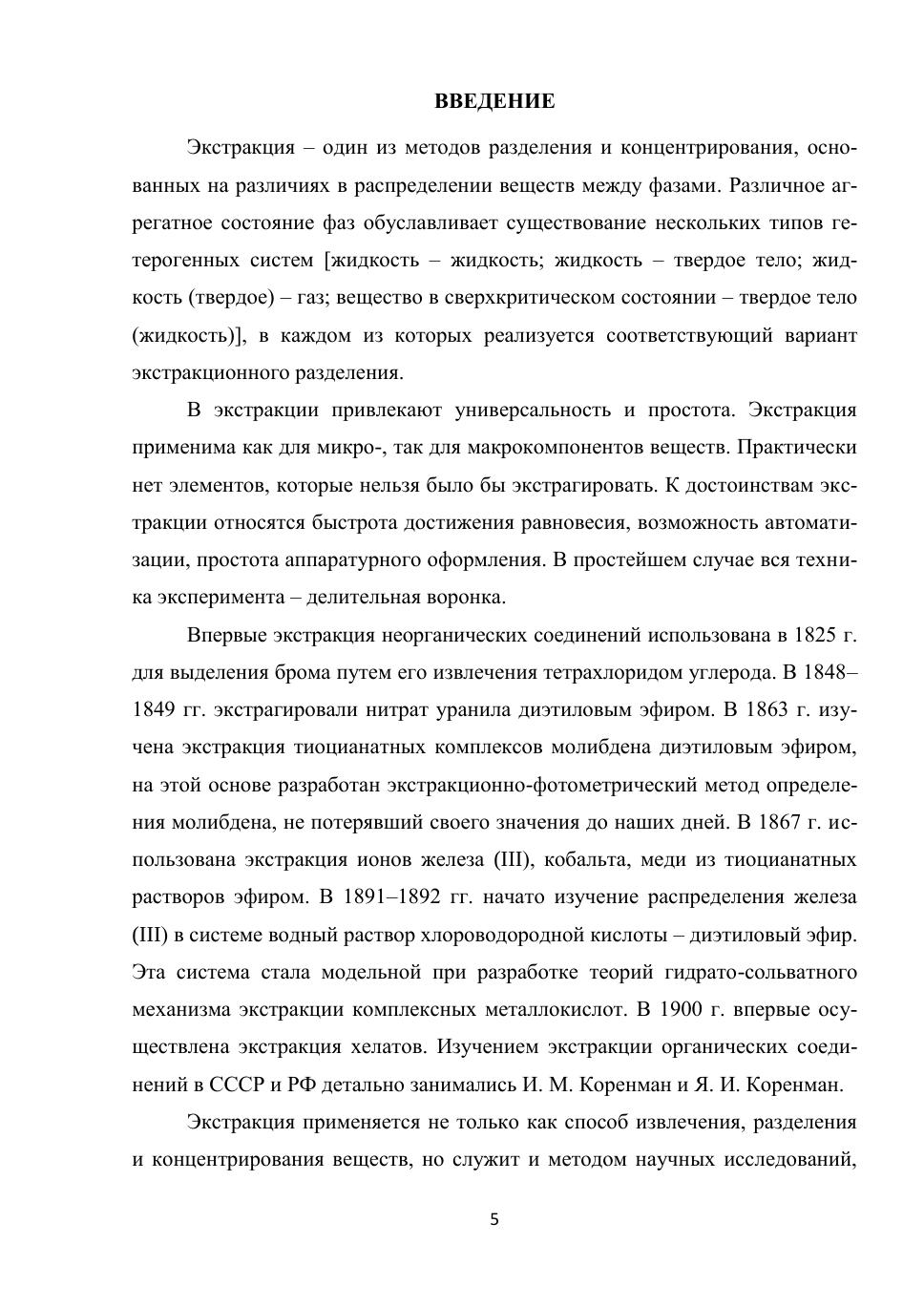 Учебное пособие посвящено одному из эффективных методов разделения и концентрирования — экстракции. В первой части дается характеристика общеизвестным, зарекомендовавшим себя способам экстракции: экстракции из расплавов и расплавами, выщелачиванию из твердого, жидкость-жидкостной, трехфазной, газовой, гомогенной экстракции. Вторая часть посвящена применению производных пиразолона в экстракции. В третьей части изложены приемы и способы, увеличивающие экологичность, безопасность экстракционных процессов, упрощающие анализ экстрактов. Учебное пособие предназначено для студентов, магистров, специализирующихся по аналитической химии, а также для широкого круга исследователей, работающих в области жидкостной экстракции, преподавателей, аспирантов, связанных по роду деятельности с методами разделения и концентрирования.