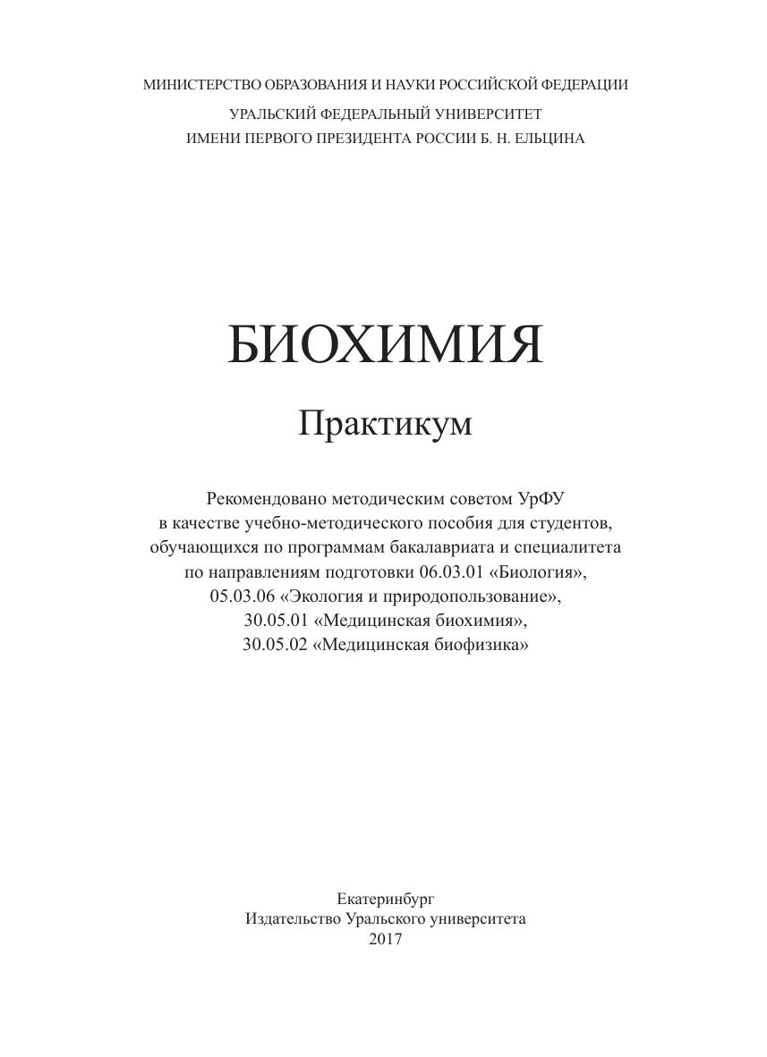 Учебно-методическое пособие включает 14 лабораторных работ, цель которых — ознакомление студентов с классическими методами биохимического анализа, закрепление навыков работы с лабораторным оборудованием. Представлены описания лабораторных работ по типовой схеме, а также иллюстративный материал, таблицы, контрольные вопросы и задания для самопроверки, тестовые задания, библиографический список, словарь терминов. Для студентов, обучающихся по направлениям «Биология», «Экология и природопользование», «Медицинская биохимия», «Медицинская биофизика».