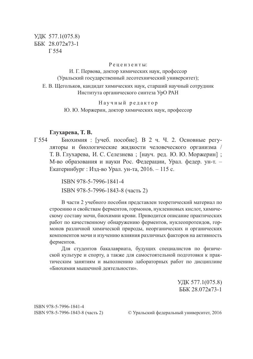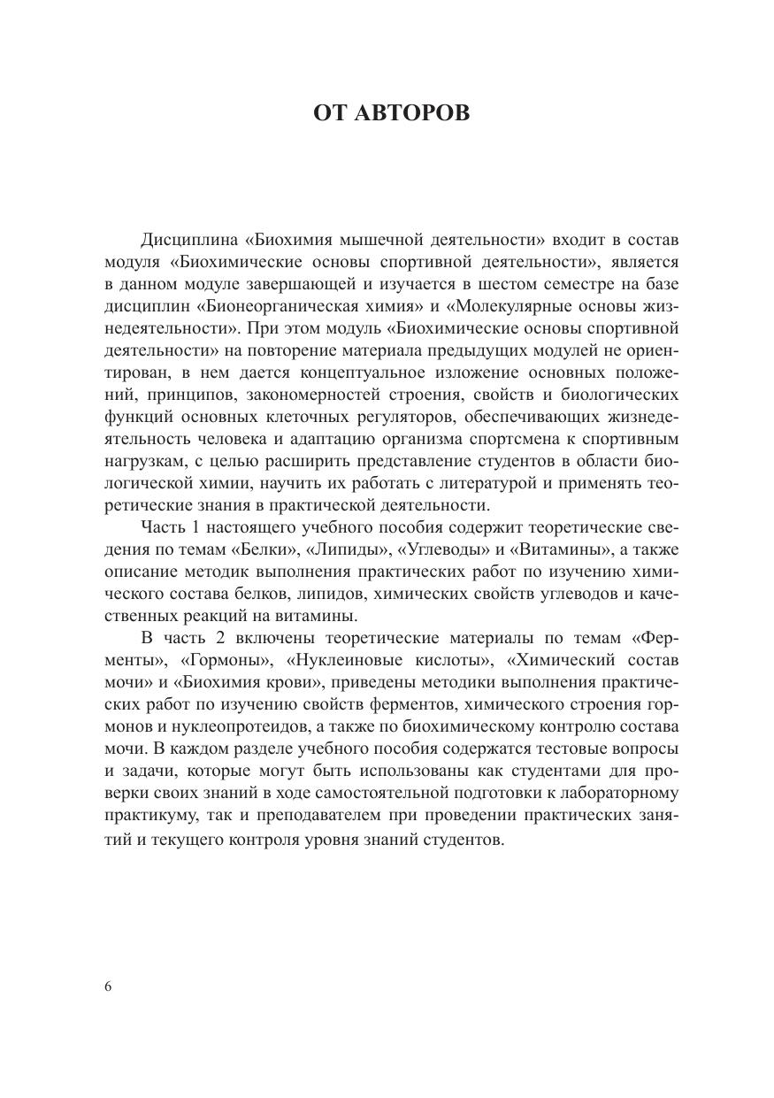В части 2 учебного пособия представлен теоретический материал по строению и свойствам ферментов, гормонов, нуклеиновых кислот, химическому составу мочи, биохимии крови. Приводится описание практических работ по качественному обнаружению ферментов, нуклеопротеидов, гормонов различной химической природы, неорганических и органических компонентов мочи и изучению влияния различных факторов на активность ферментов. Для студентов бакалавриата, будущих специалистов по физической культуре и спорту, а также для самостоятельной подготовки к практическим занятиям и выполнению лабораторных работ по дисциплине «Биохимия мышечной деятельности».
