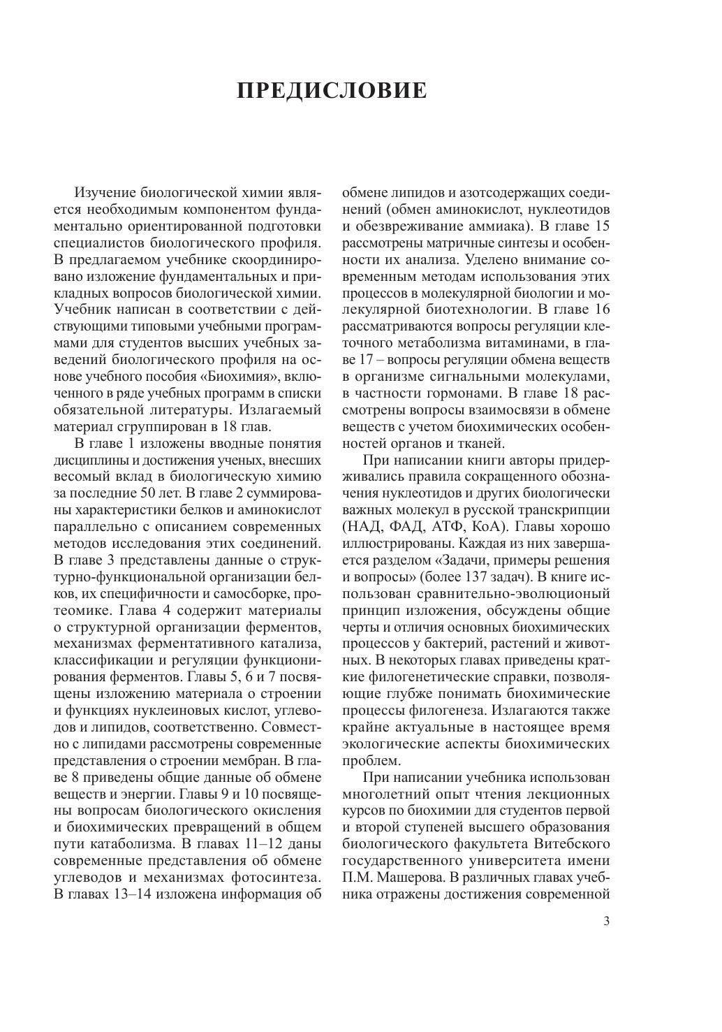 Изложены новейшие достижения в биохимии белков, углеводов, липидов, нуклеиновых кислот, витаминов, минеральных веществ и воды, а также ряда органов и тканей. Особое внимание уделено современным методам биохимических исследований, проблемам статической, динамической и функциональной биологической химии.