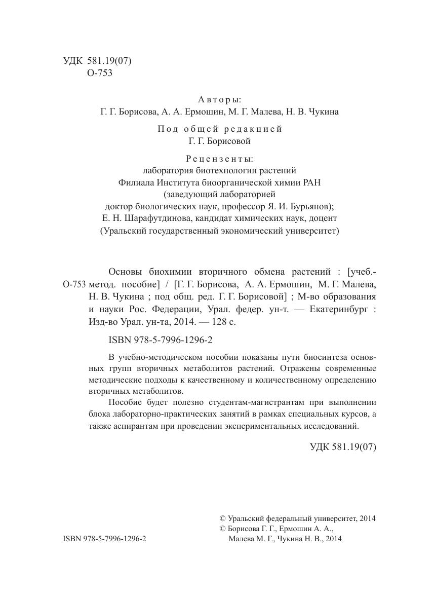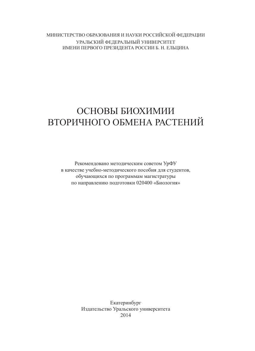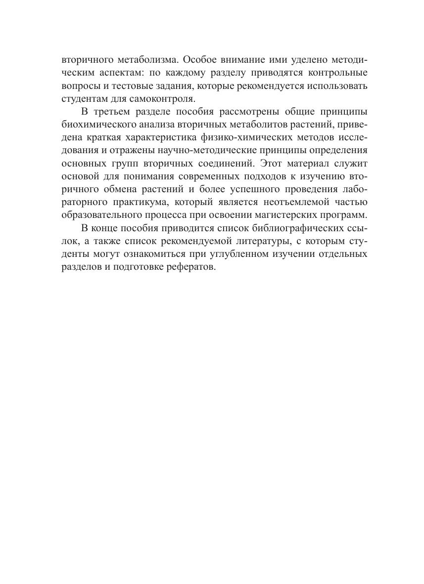 В учебно-методическом пособии показаны пути биосинтеза основных групп вторичных метаболитов растений. Отражены современные методические подходы к качественному и количественному определению вторичных метаболитов. Пособие будет полезно студентам-магистрантам при выполнении блока лабораторно-практических занятий в рамках специальных курсов, а также аспирантам при проведении экспериментальных исследований.
