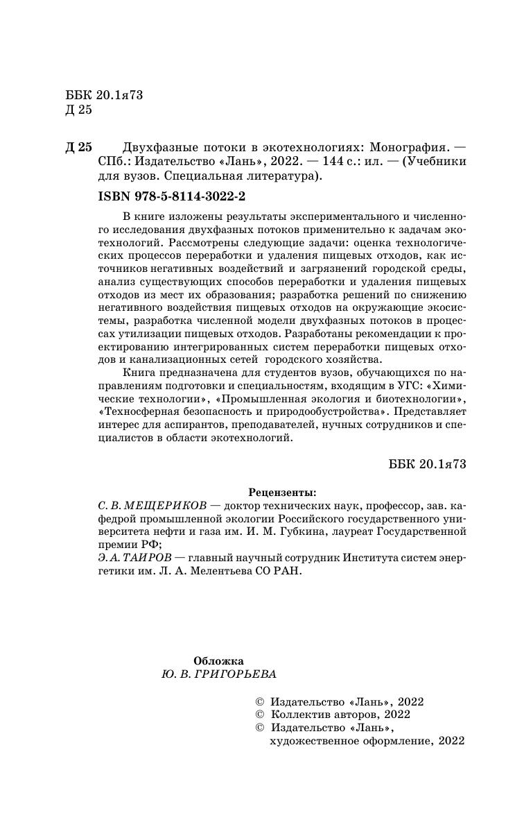 В книге изложены результаты экспериментального и численного исследования двухфазных потоков применительно к задачам экотехнологий. Рассмотрены следующие задачи: оценка технологических процессов переработки и удаления пищевых отходов, как источников негативных воздействий и загрязнений городской среды, анализ существующих способов переработки и удаления пищевых отходов из мест их образования, разработка решений по снижению негативного воздействия пищевых отходов на окружающие экосистемы, разработка численной модели двухфазных потоков в процессах утилизации пищевых отходов. Разработаны рекомендации к проектированию интегрированных систем переработки пищевых отходов и канализационных сетей городского хозяйства. Книга предназначена для студентов вузов, обучающихся по направлениям подготовки и специальностям, входящим в УГС: «Химические технологии», «Промышленная экология и биотехнологии», «Техносферная безопасность и природообустройства». Представляет интерес для аспирантов, преподавателей, нучных сотрудников и специалистов в области экотехнологий.