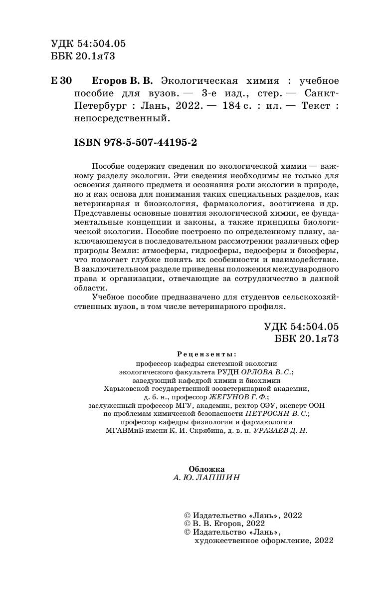 Пособие содержит сведения по экологической химии - важному разделу экологии. Эти сведения необходимы не только для освоения данного предмета и осознания роли экологии в природе, но и как основа для понимания таких специальных разделов, как ветеринарная и биоэкология, фармакология, зоогигиена и др. Представлены основные понятия экологической химии, ее фундаментальные концепции и законы, а также принципы биологической экологии. Пособие построено по определенному плану, заключающемуся в последовательном рассмотрении различных сфер природы Земли: атмосферы, гидросферы, педосферы и биосферы, что помогает глубже понять их особенности и взаимодействие. В заключительном разделе приведены положения международного права и организации, отвечающие за сотрудничество в данной области. Учебное пособие предназначено для студентов сельскохозяйственных вузов, в том числе ветеринарного профиля.