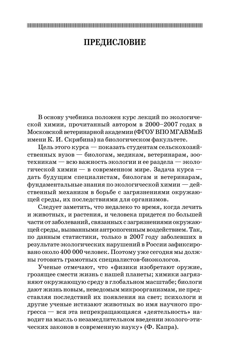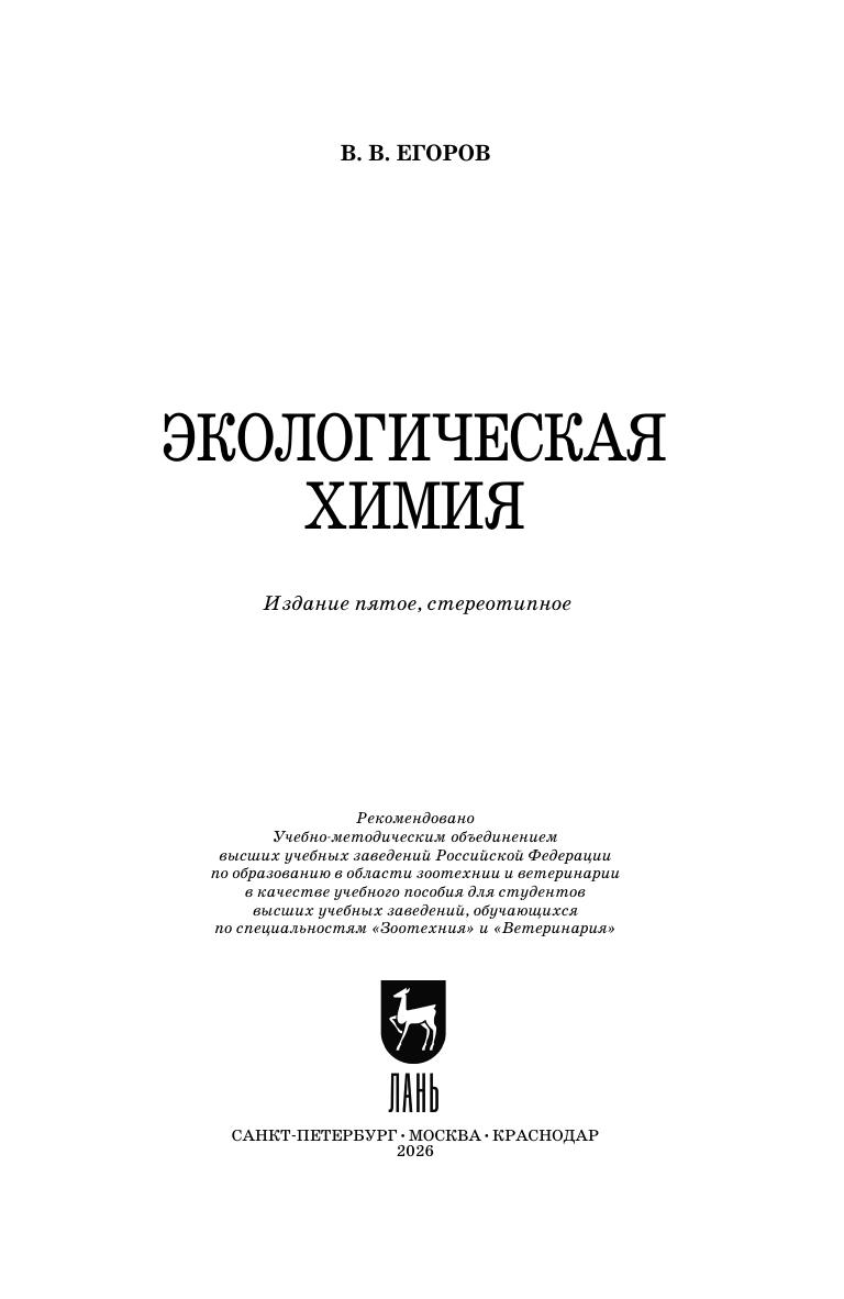 Пособие содержит сведения по экологической химии - важному разделу экологии. Эти сведения необходимы не только для освоения данного предмета и осознания роли экологии в природе, но и как основа для понимания таких специальных разделов, как ветеринарная и биоэкология, фармакология, зоогигиена и др. Представлены основные понятия экологической химии, ее фундаментальные концепции и законы, а также принципы биологической экологии. Пособие построено по определенному плану, заключающемуся в последовательном рассмотрении различных сфер природы Земли: атмосферы, гидросферы, педосферы и биосферы, что помогает глубже понять их особенности и взаимодействие. В заключительном разделе приведены положения международного права и организации, отвечающие за сотрудничество в данной области. Учебное пособие предназначено для студентов сельскохозяйственных вузов, в том числе ветеринарного профиля.