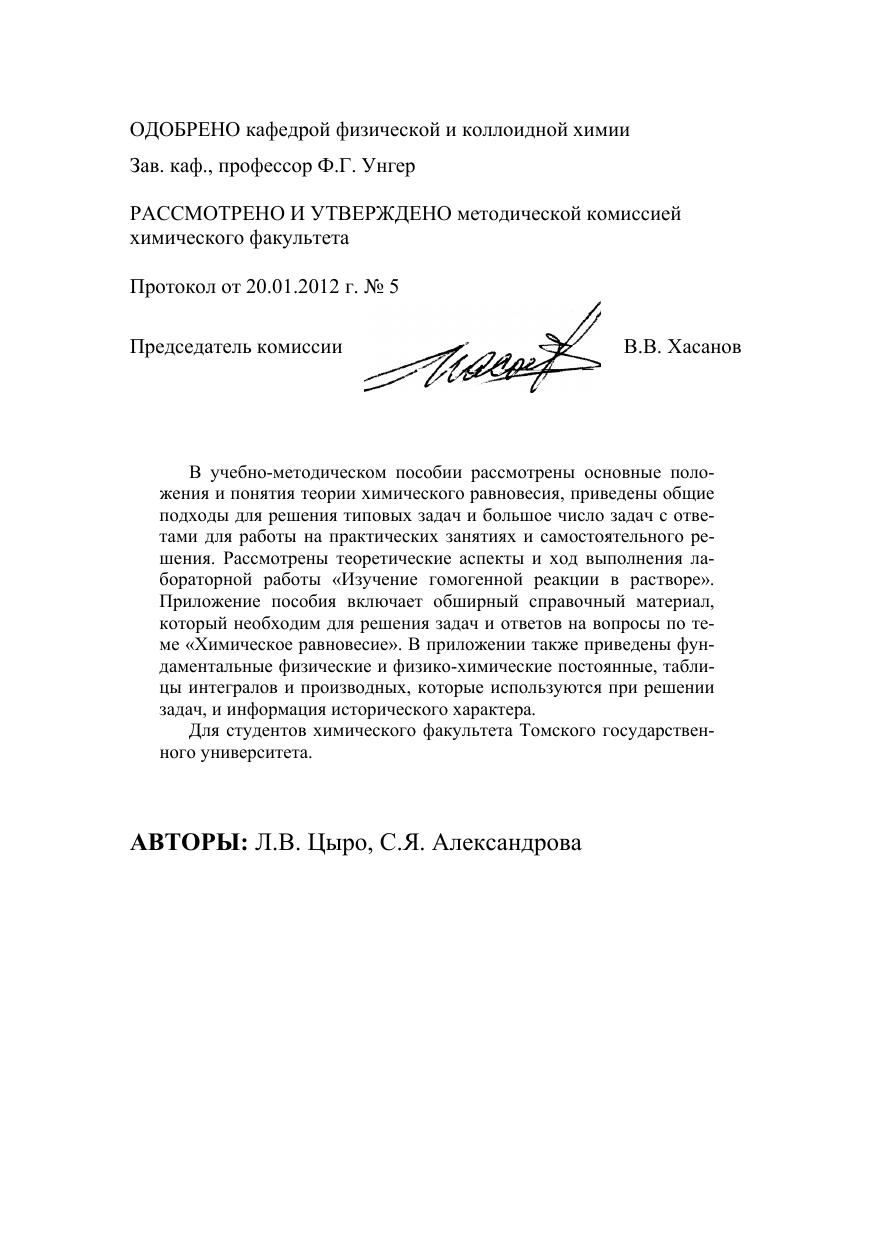 В учебно-методическом пособии рассмотрены основные положения и понятия теории химического равновесия, приведены общие подходы для решения типовых задач и большое число задач с ответами для работы на практических занятиях и самостоятельного решения. Рассмотрены теоретические аспекты и ход выполнения лабораторной работы «Изучение гомогенной реакции в растворе». Приложение пособия включает обширный справочный материал, который необходим для решения задач и ответов на вопросы по теме «Химическое равновесие». В приложении также приведены фундаментальные физические и физико-химические постоянные, таблицы интегралов и производных, которые используются при решении задач, и информация исторического характера. Для студентов химического факультета Томского государственного университета.