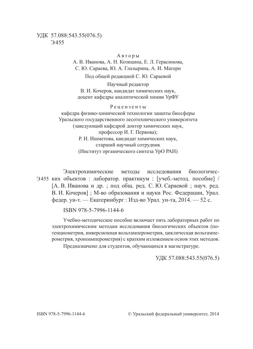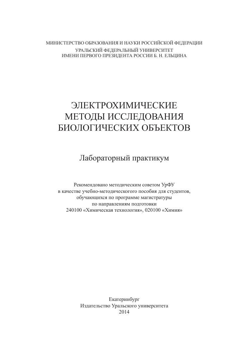 Учебно-методическое пособие включает пять лабораторных работ по электрохимическим методам исследования биологических объектов (потенциометрия, инверсионная вольтамперометрия, циклическая вольтамперометрия, хроноамперометрия) с кратким изложением основ этих методов. Предназначено для студентов, обучающихся в магистратуре.