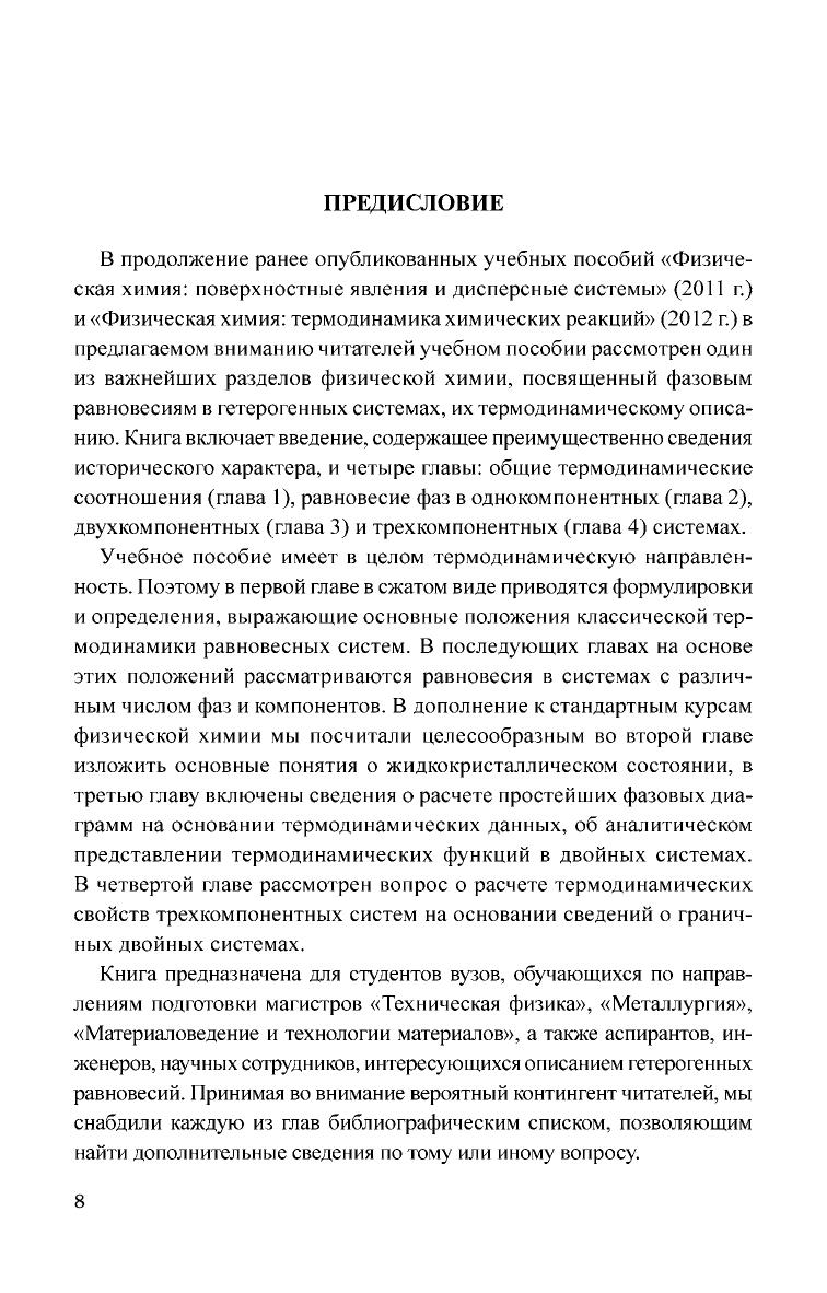 В учебном пособии изложены вопросы, связанные с термодинамическим описанием равновесий в одно- , двух- и трехкомпонентных системах. В качестве примеров рассмотрены преимущественно металлические системы. Специальное внимание уделено аналитическому представлению концентрационной зависимости термодинамических функций в двойных жидких системах, расчету термодинамических свойств тройных систем по данным о граничных двойных системах, расчетам фазовых диаграмм. Учебное пособие предназначено для студентов высших учебных заведений, обучающихся по магистерской программе «Материаловедение наноматериалов и компонентов электронной техники» направления подготовки магистров «Техническая физика». Оно может быть также использовано при обучении студентов направлений подготовки «Материаловедение и технологии материалов», «Металлургия», в системах повышения квалификации, в учреждениях дополнительного профессионального образования.