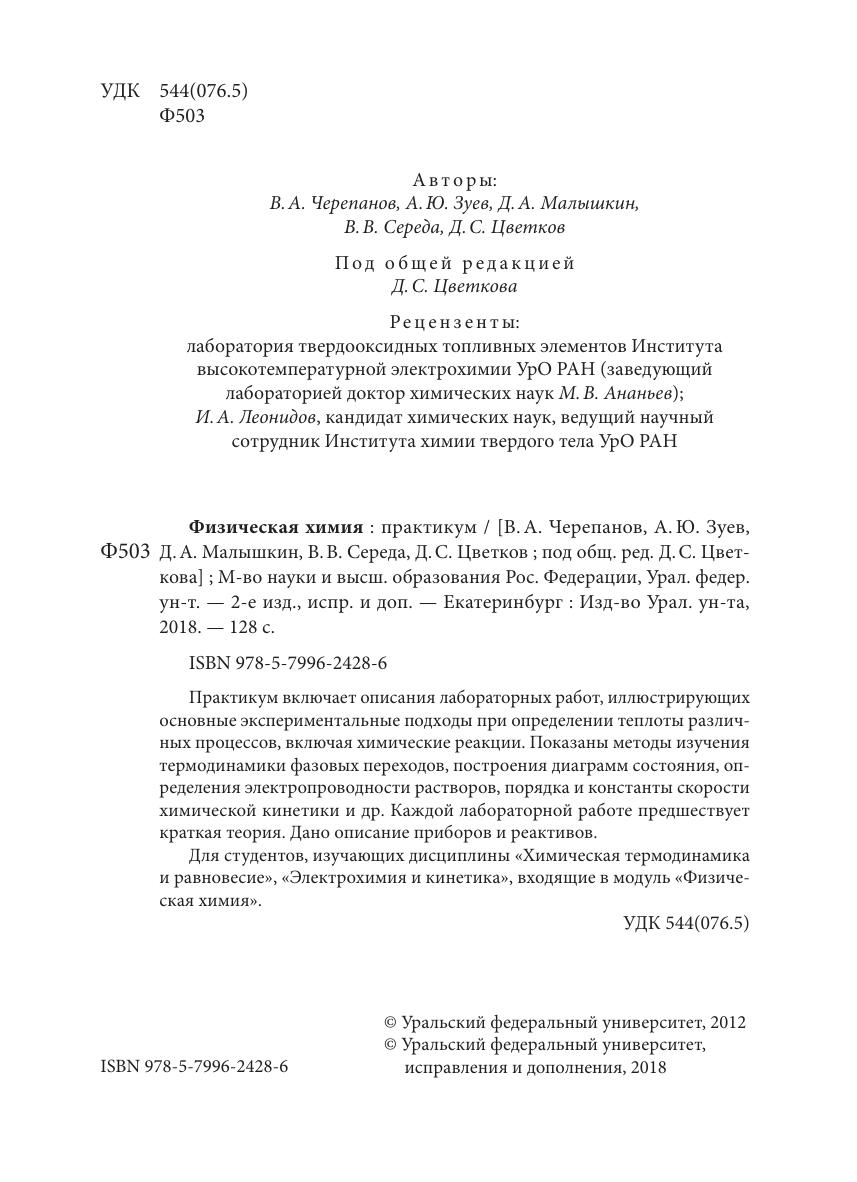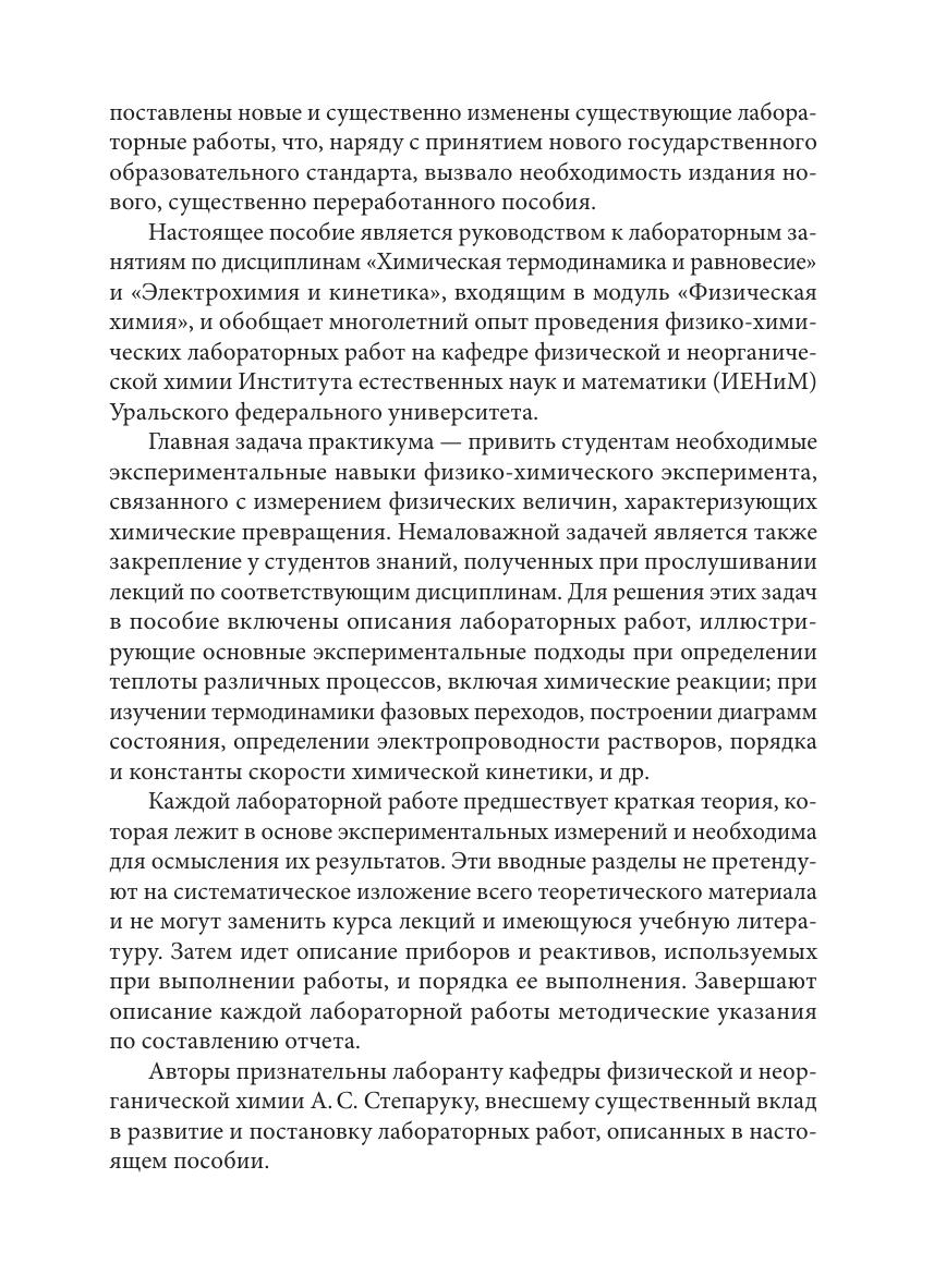 Практикум включает описания лабораторных работ, иллюстрирующих основные экспериментальные подходы при определении теплоты различных процессов, включая химические реакции. Показаны методы изучения термодинамики фазовых переходов, построения диаграмм состояния, определения электропроводности растворов, порядка и константы скорости химической кинетики и др. Каждой лабораторной работе предшествует краткая теория. Дано описание приборов и реактивов. Для студентов, изучающих дисциплины «Химическая термодинамика и равновесие», «Электрохимия и кинетика», входящие в модуль «Физическая химия».