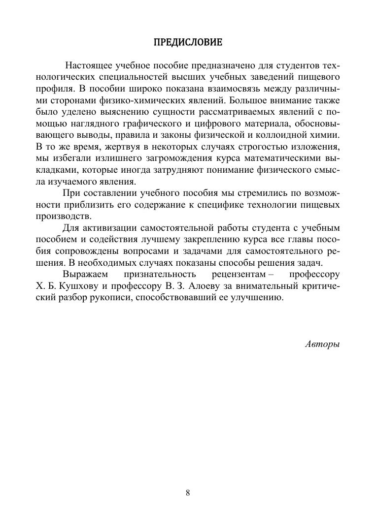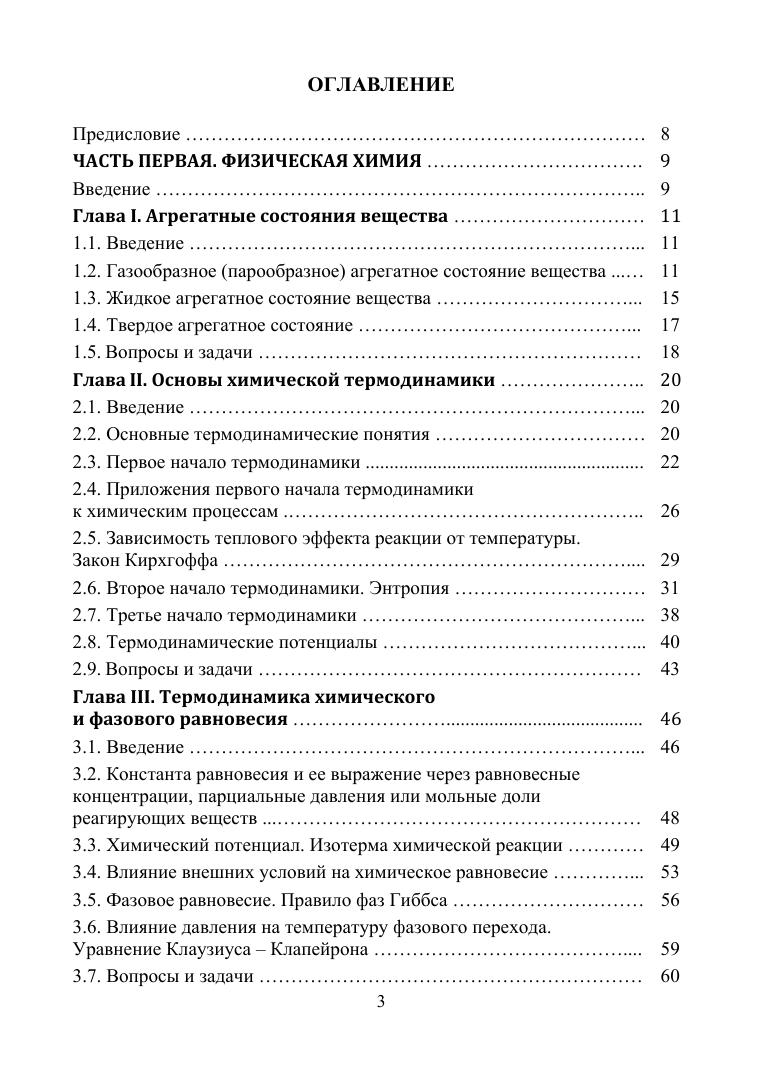 В учебном пособии изложены основные разделы физической и коллоидной химии: состояние вещества, химическая термодинамика, термохимия, химическое и фазовое равновесие, химическая кинетика и катализ, фотохимия, термодинамические свойства растворов электролитов и неэлектролитов, электропроводность растворов электролитов, электрохимические процессы, поверхностные явления, учение о коллоидных состояниях и микрогетерогенных системах.