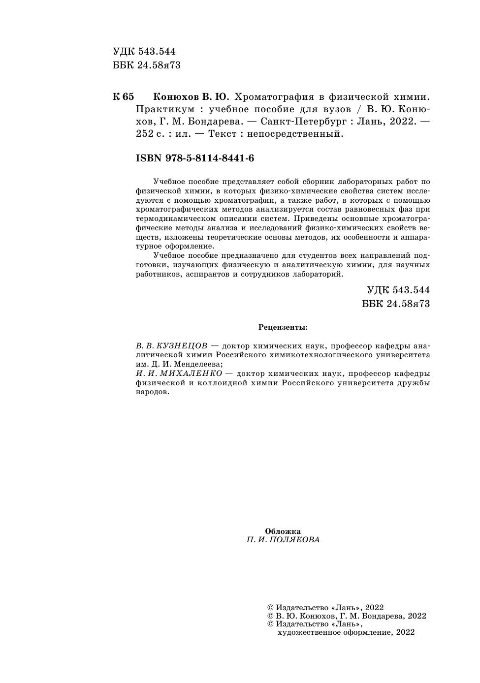 Учебное пособие представляет собой сборник лабораторных работ по физической химии, в которых физико-химические свойства систем исследуются с помощью хроматографии, а также работы, в которых с помощью хроматографических методов анализируется состав равновесных фаз при термодинамическом описании систем. Приведены основные хроматографические методы анализа и исследований физико-химических свойств веществ, изложены теоретические основы методов, их особенности и аппаратурное оформление. Учебное пособие предназначено для студентов всех направлений подготовки, изучающих физическую и аналитическую химии, для научных работников, аспирантов и сотрудников лабораторий.