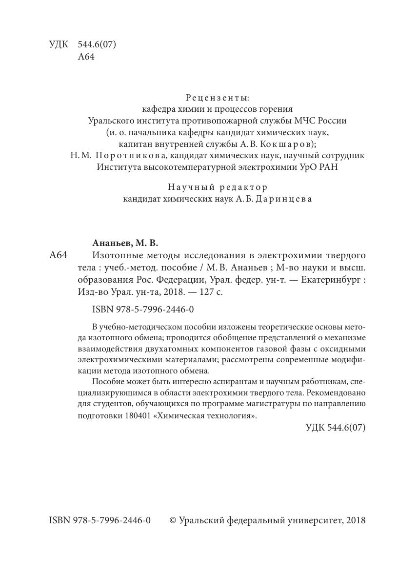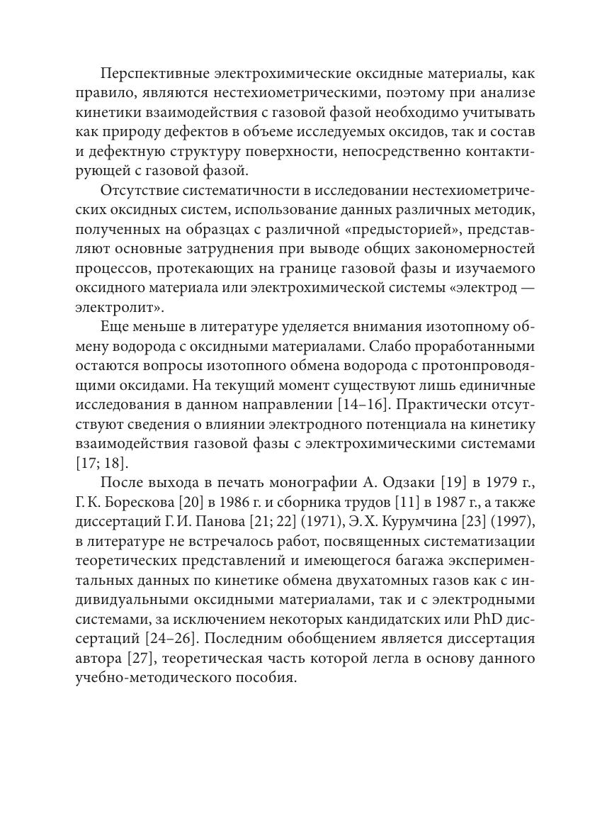 В учебно-методическом пособии изложены теоретические основы метода изотопного обмена; проводится обобщение представлений о механизме взаимодействия двухатомных компонентов газовой фазы с оксидными электрохимическими материалами; рассмотрены современные модификации метода изотопного обмена. Пособие может быть интересно аспирантам и научным работникам, специализирующимся в области электрохимии твердого тела. Рекомендовано для студентов, обучающихся по программе магистратуры по направлению подготовки 180401 «Химическая технология».