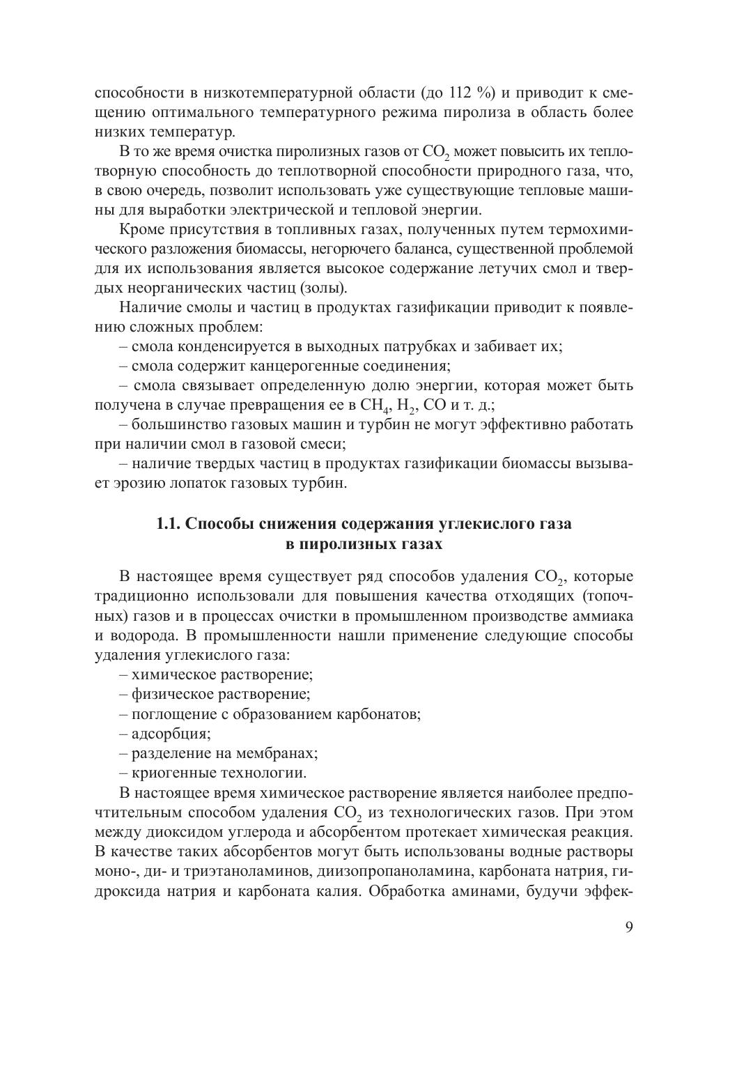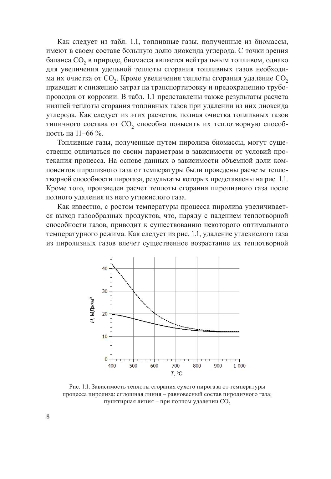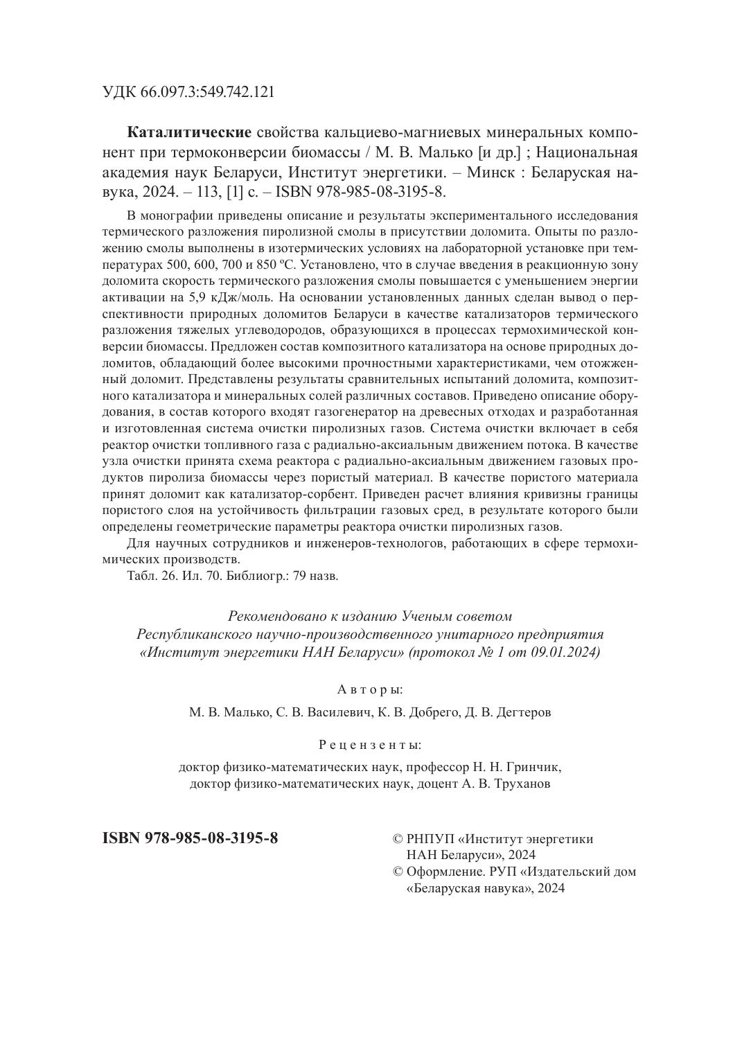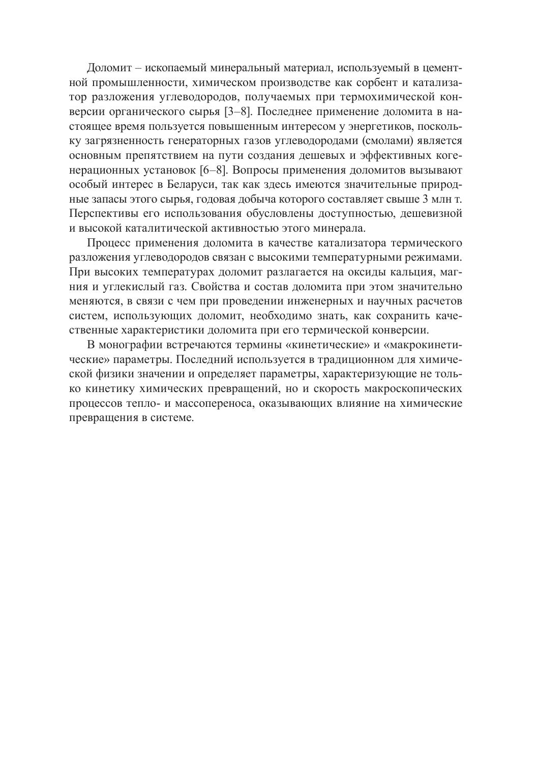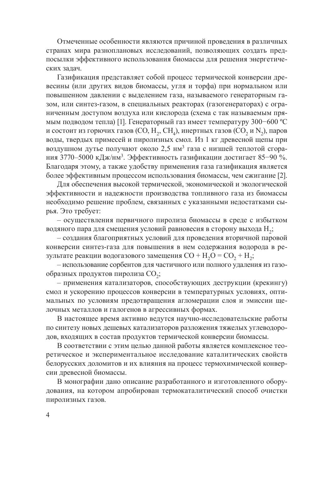 В монографии приведены описание и результаты экспериментального исследования термического разложения пиролизной смолы в присутствии доломита. Опыты по разложению смолы выполнены в изотермических условиях на лабораторной установке при температурах 500, 600, 700 и 850 ºС. Установлено, что в случае введения в реакционную зону доломита скорость термического разложения смолы повышается с уменьшением энергии активации на 5,9 кДж/моль. На основании установленных данных сделан вывод о перспективности природных доломитов Беларуси в качестве катализаторов термического разложения тяжелых углеводородов, образующихся в процессах термохимической конверсии биомассы. Предложен состав композитного катализатора на основе природных доломитов, обладающий более высокими прочностными характеристиками, чем отожженный доломит. Представлены результаты сравнительных испытаний доломита, композитного катализатора и минеральных солей различных составов. Приведено описание оборудования, в состав которого входят газогенератор на древесных отходах и разработанная и изготовленная система очистки пиролизных газов. Система очистки включает в себя реактор очистки топливного газа с радиально-аксиальным движением потока. В качестве узла очистки принята схема реактора с радиально-аксиальным движением газовых продуктов пиролиза биомассы через пористый материал. В качестве пористого материала принят доломит как катализатор-сорбент. Приведен расчет влияния кривизны границы пористого слоя на устойчивость фильтрации газовых сред, в результате которого были определены геометрические параметры реактора очистки пиролизных газов.
