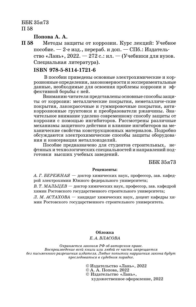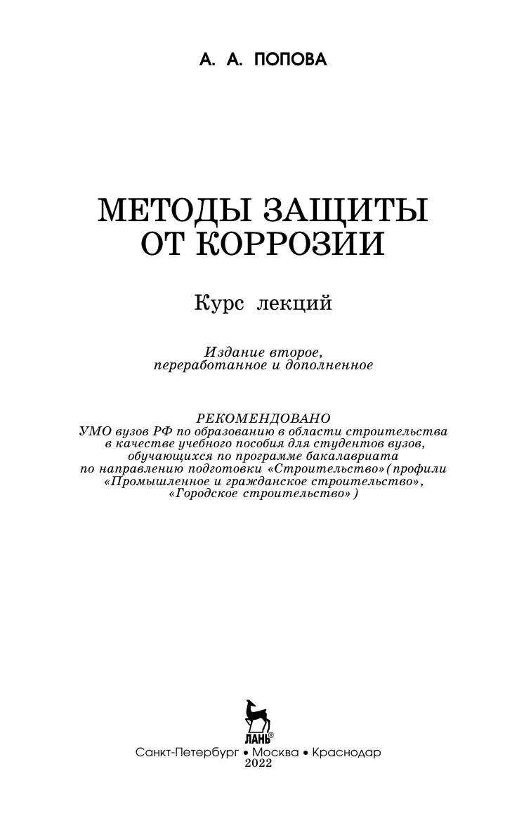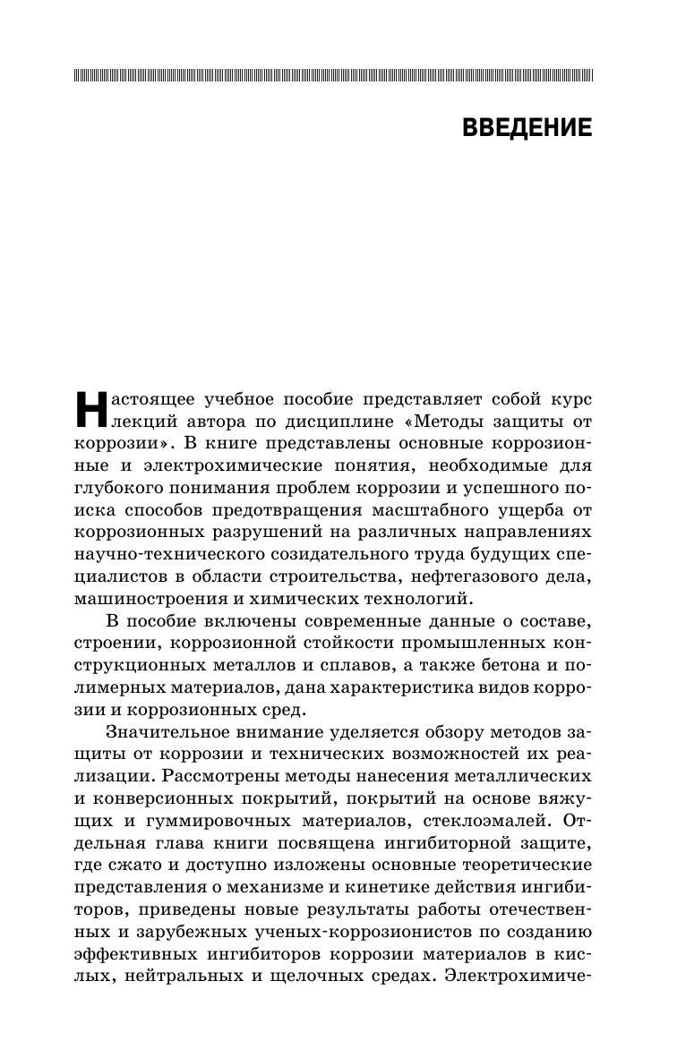 Представленное учебное пособие содержит значительный теоретический и иллюстрационный материал, позволяющий изучить коррозию металлических, неметаллических, бетонных, полимерных, композиционных материалов в различных средах. В пособии приведены основные электрохимические и коррозионные определения, закономерности и экспериментальные данные, необходимые для глубокого освоения сложной и многогранной проблемы коррозии и эффективной борьбы с ней, формирования грамотного инженерного подхода к решению практических коррозионных задач. Вниманию читателя представлены основные способы защиты от коррозии: металлические и неметаллические покрытия, лакокрасочные и гуммировочные покрытия, антикоррозионные грунтовки и преобразователи ржавчины. Значительное внимание уделено современному способу защиты от коррозии с помощью ингибиторов. Рассмотрены различные механизмы защитного действия и влияние ингибиторов на механические свойства конструкционных материалов. Подробно обсуждаются электрохимические способы защиты оборудования и консервация металлоизделий. Приведенные в конце каждой главы примеры расчетов, контрольные вопросы и задания позволяют более полно и всесторонне освоить дисциплину «Методы защиты технологического оборудования от коррозии», в том числе при обучении дистанционно. Пособие предназначено для студентов строительных, нефтяных и технологических специальностей и направлений высших учебных заведений. Пособие будет полезно также магистрам и преподавателям химических дисциплин при подготовке аудиторных занятий и исследовательских работ с целью расширения представлений обучающихся о видах, механизме коррозионных процессов и способах защиты от коррозии с привлечением широкого иллюстративного материала.