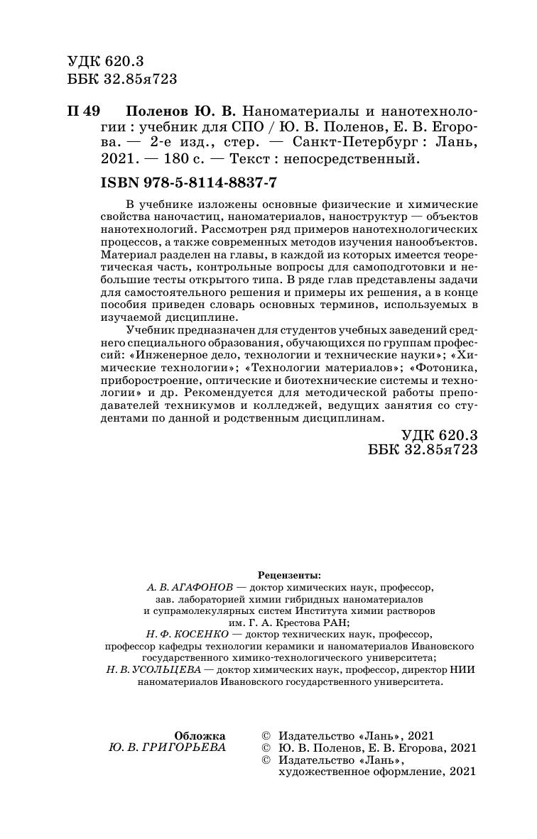 В учебнике изложены основные физические и химические свойства наночастиц, наноматериалов, наноструктур - объектов нанотехнологий. Рассмотрены ряд примеров нанотехнологических процессов, а также современных методов изучения нанообъектов. Материал разделен на главы, в каждой из которых имеется теоретическая часть, контрольные вопросы для самоподготовки и небольшие тесты открытого типа. В ряде глав представлены задачи для самостоятельного решения и примеры их решения, а в конце пособия приведен словарь основных терминов, используемых в изучаемой дисциплине.