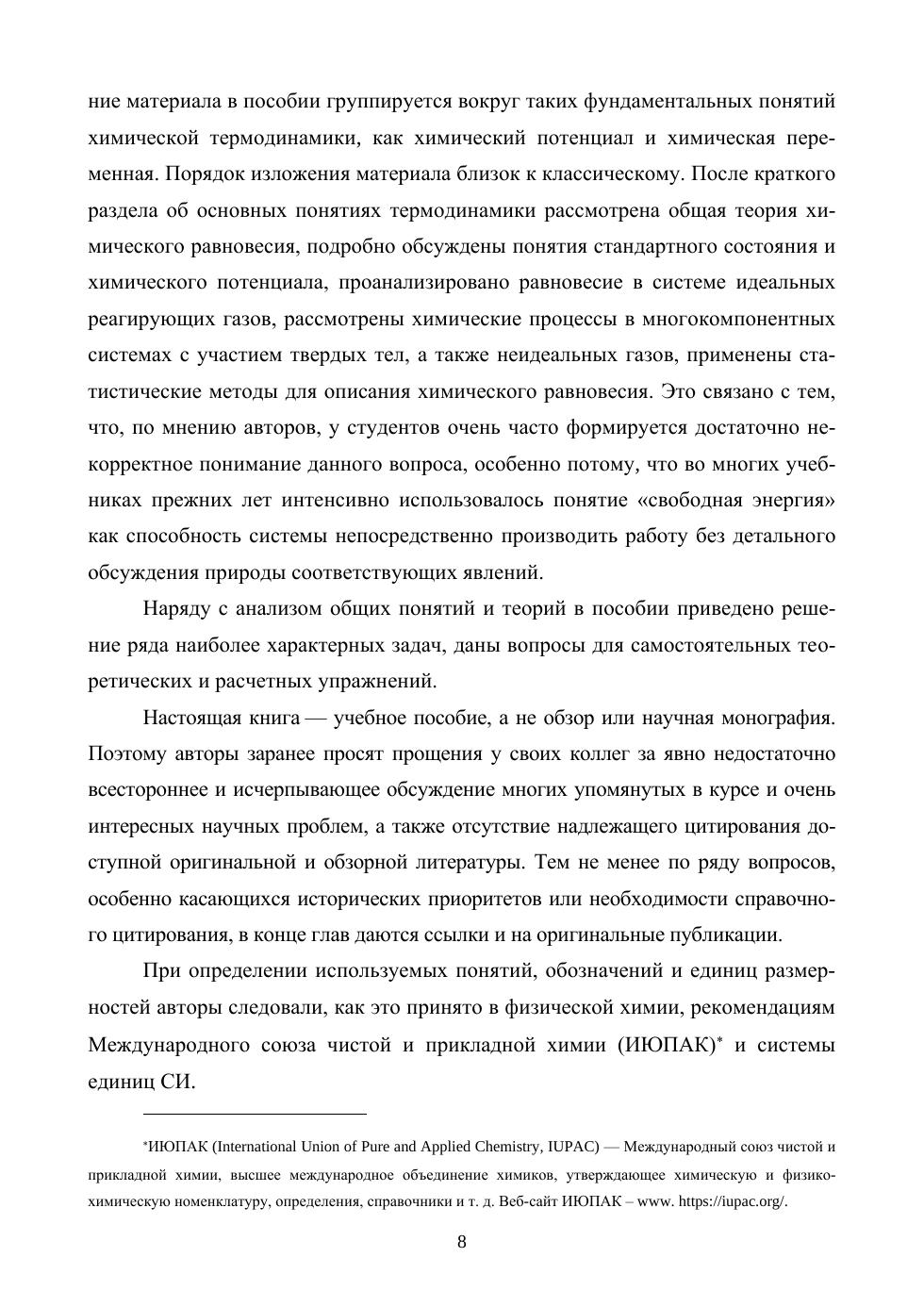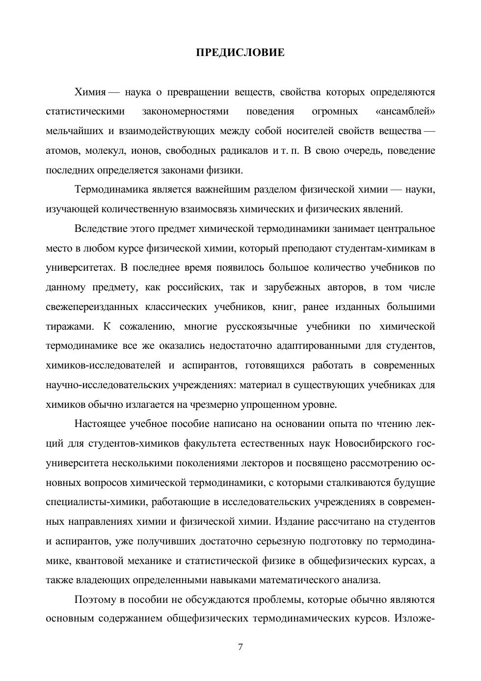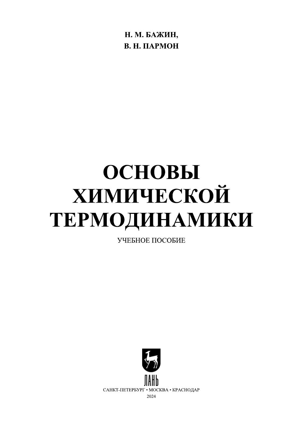 Предлагаемое издание посвящено рассмотрению основных вопросов химической термодинамики. В нем не обсуждаются те проблемы, которые обычно являются основным содержанием общефизических термодинамических курсов. Поэтому после напоминания основных понятий термодинамики в книге рассмотрена общая теория химического равновесия, подробно описаны понятия стандартного состояния и химического потенциала, проанализировано равновесие в системе идеальных реагирующих газов, рассмотрены химические процессы в многокомпонентных системах с участием твердых тел, а также неидеальных газов, применены статистические методы для описания химического равновесия. Издание адресовано студентам, обучающимся по направлениям подготовки, входящим в УГСН: «Химия», «Химические технологии», и получившим подготовку по термодинамике, квантовой механике и статистической физики в общефизических курсах.