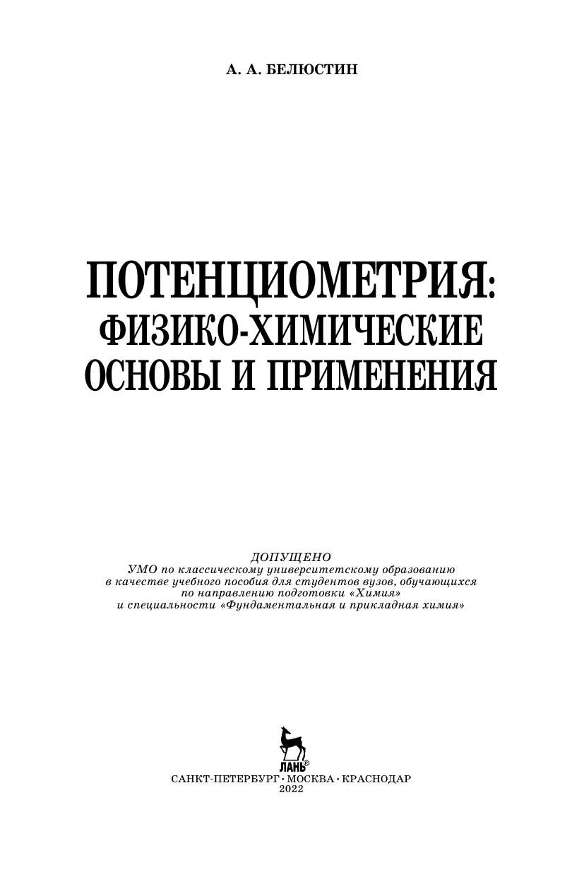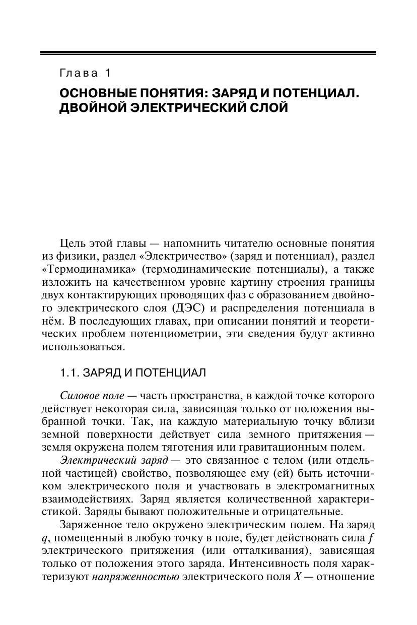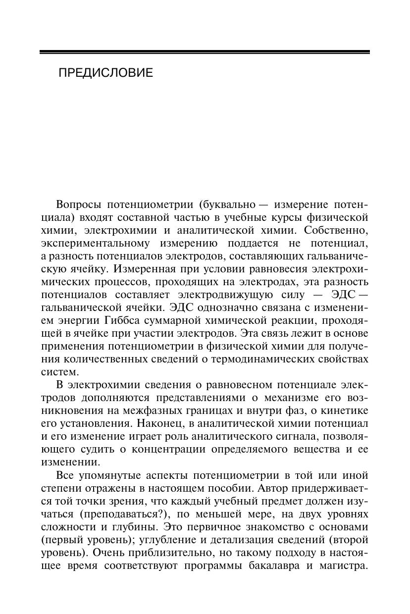 Потенциометрия – измерение электродвижущей силы (ЭДС) равновесной разности потенциалов между электродами гальванической ячейки. Потенциометрия включает в себя рН-метрию, ионометрию с ионоселективными электродами и оксредметрию. В учебном пособии описаны теоретические основы потенциометрии и применение потенциометрического метода в физической, аналитической химии, электрохимии, биологии, медицине, химическом производстве. Предмет изложен на двух уровнях сложности:первичное знакомство с основами (первый уровень), углубление и детализация сведений (второй уровень). В книге представлены последние достижения в рассматриваемой области науки. Настоящее учебное пособие предназначено для обучения бакалавров (первый уровень) и магистров, а также аспирантов (второй уровень) на естественно-научных (в частности, химическом и биологическом) факультетах университетов. Пособие полезно специалистам химикам-аналитикам и физико-химикам, биологам и геологам, инженерно-техническим работникам, измеряющим рН и окислительно-восстановительные потенциалы на химическом, фармацевтическом и т. п. производствах.
